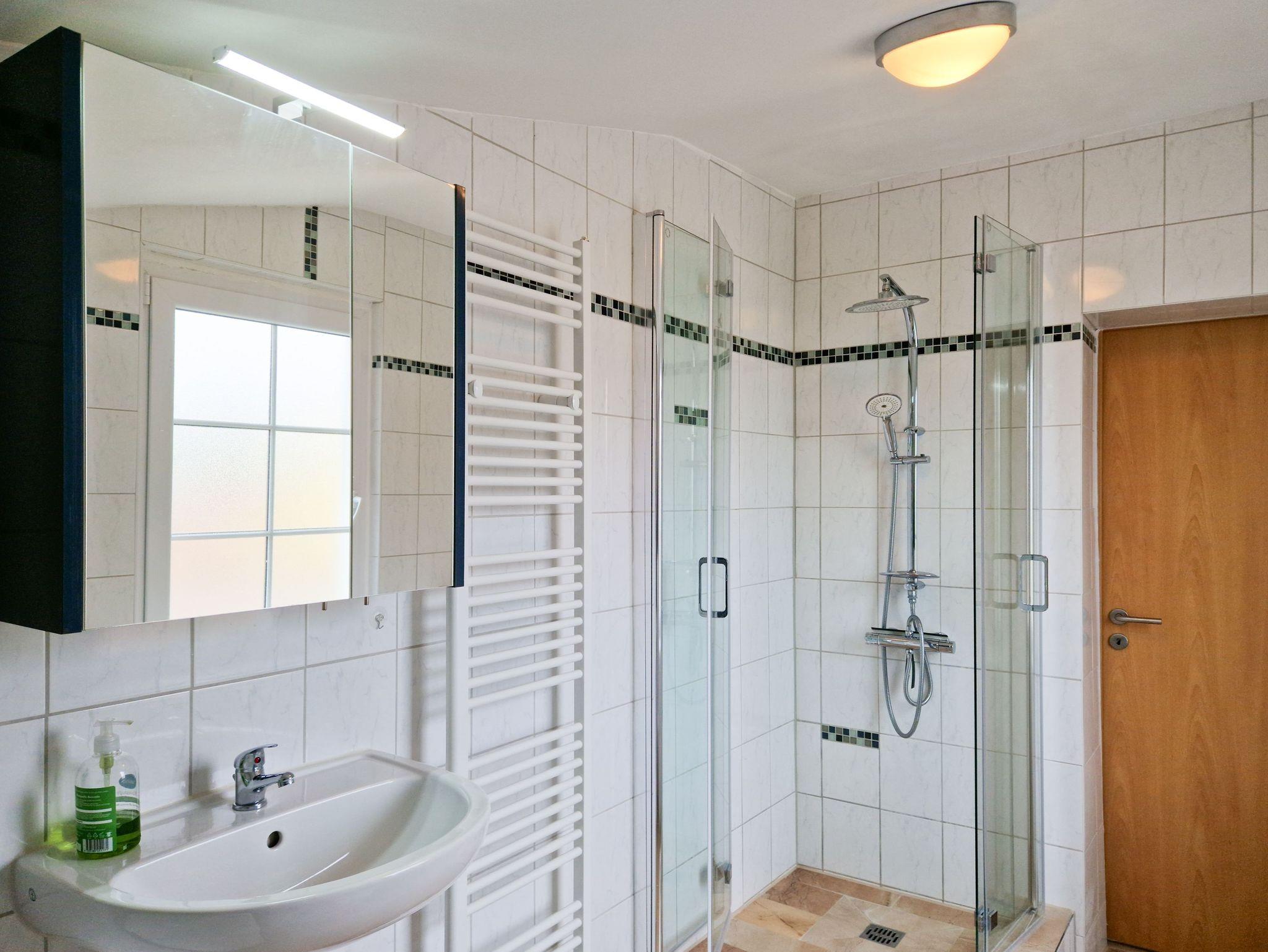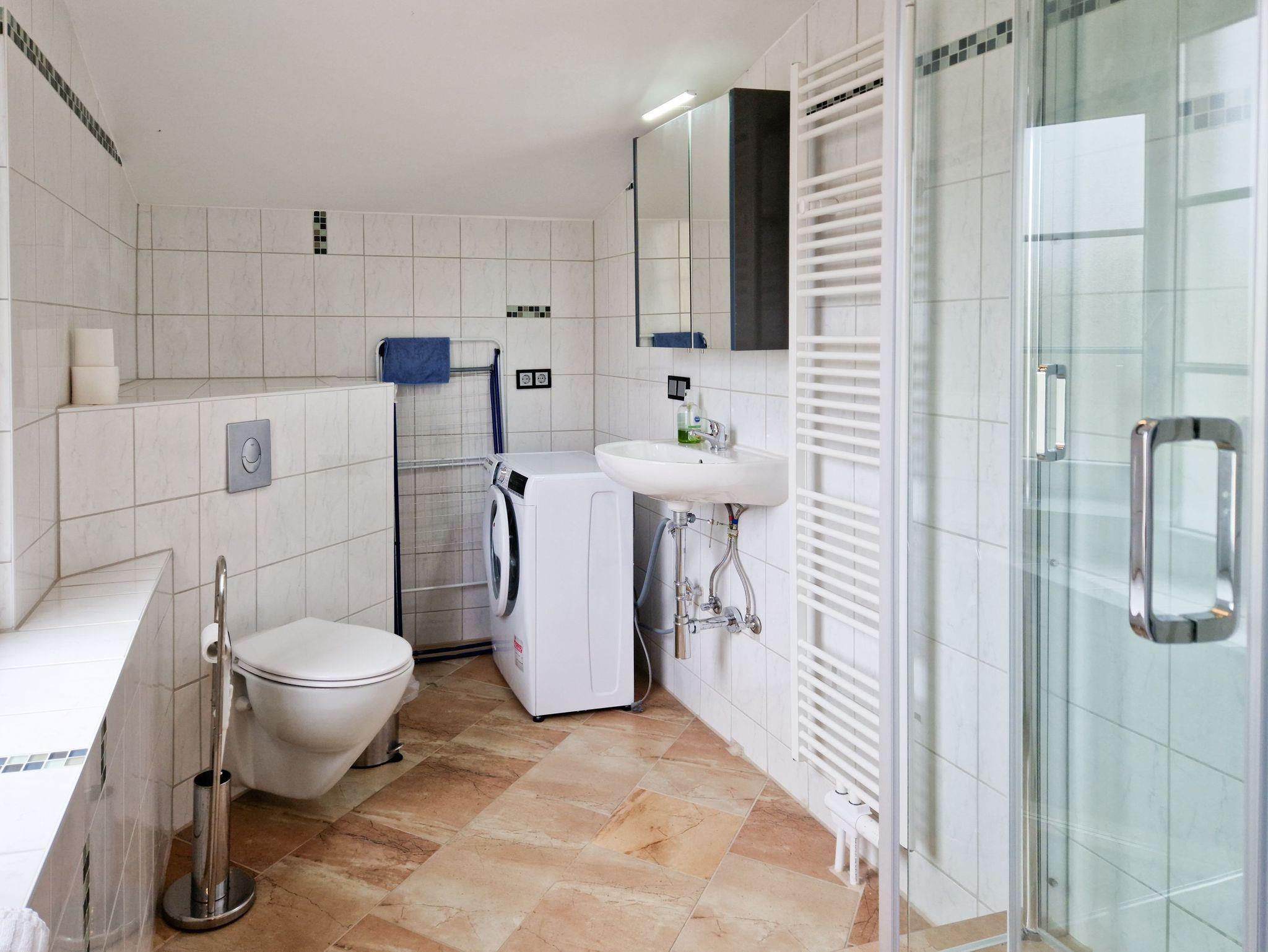 Das moderne Badezimmer mit Dusche, WC, Waschbecken und sogar einer Waschmaschine sorgt dafür, dass es Ihnen an nichts fehlt, auch nicht bei der Wäsche.