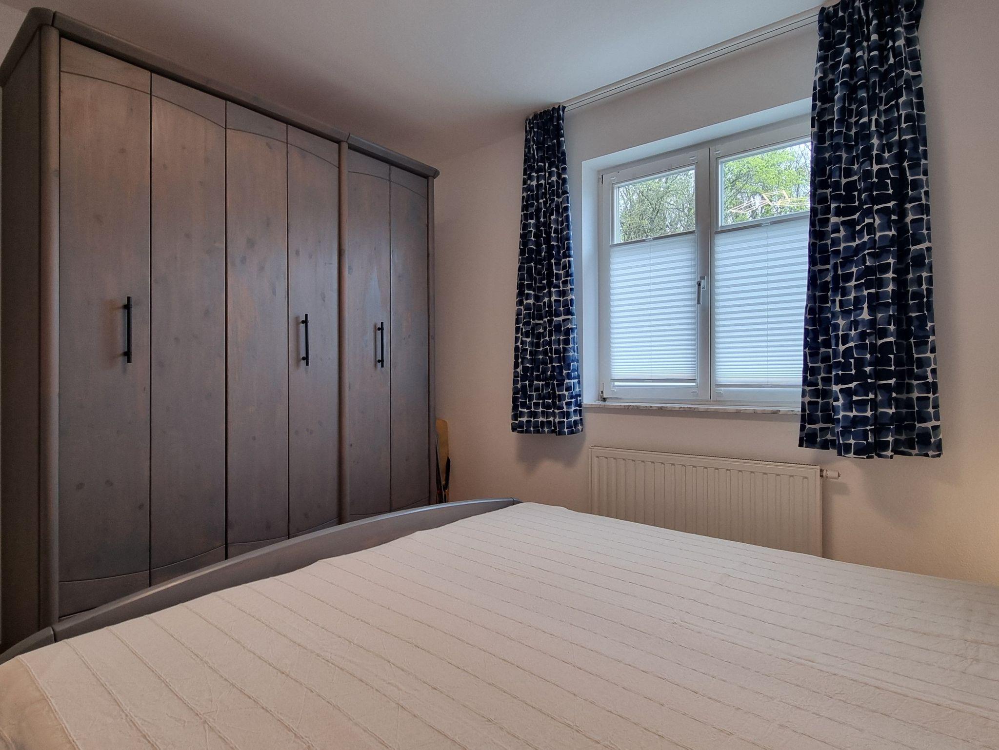 • Ein Schlafzimmer mit einem Doppelbett (180 x 200 cm), einer Sitzbank und einem Kleiderschrank.