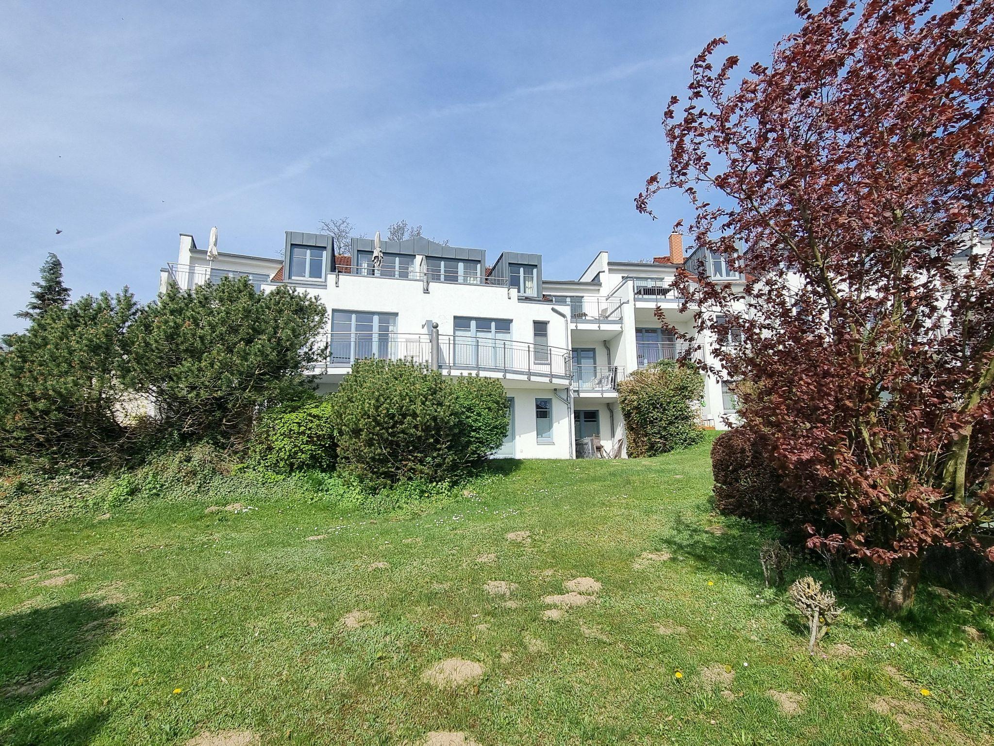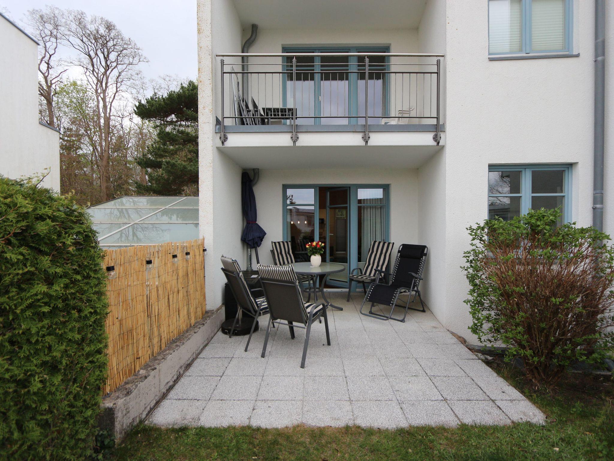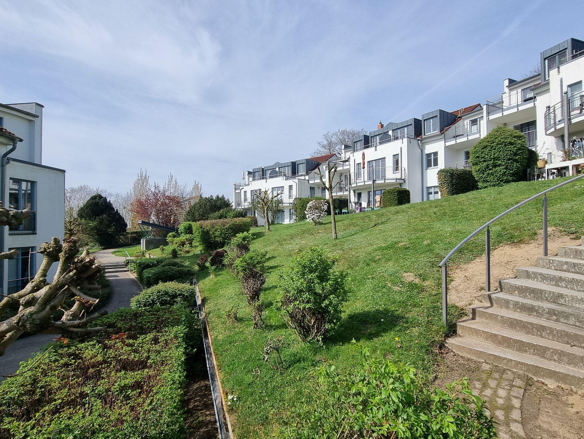 Die Ferienwohnung Nr. 23 mit Terrasse befindet sich im Erdgeschoss in der Residenz Bellevue in 17454 Zinnowitz, Heimweg 10 und bietet einen Blick auf das Umfeld und die Landschaft.