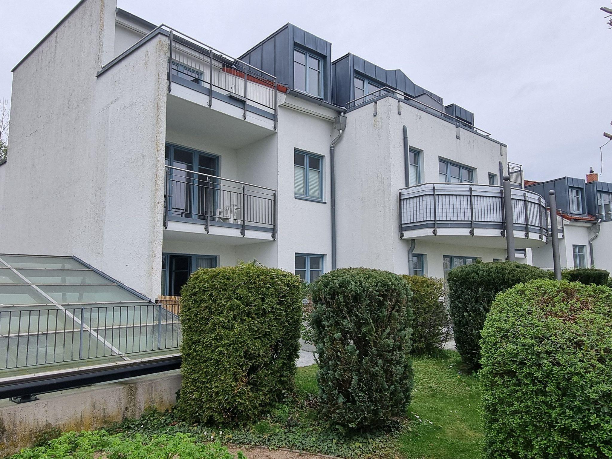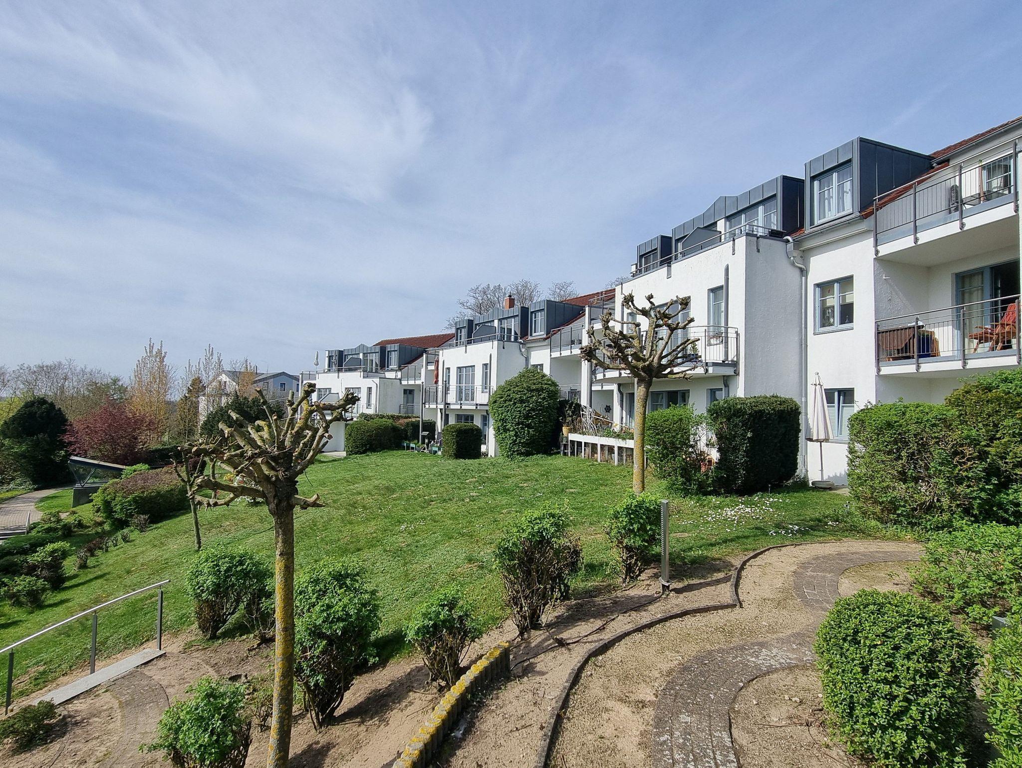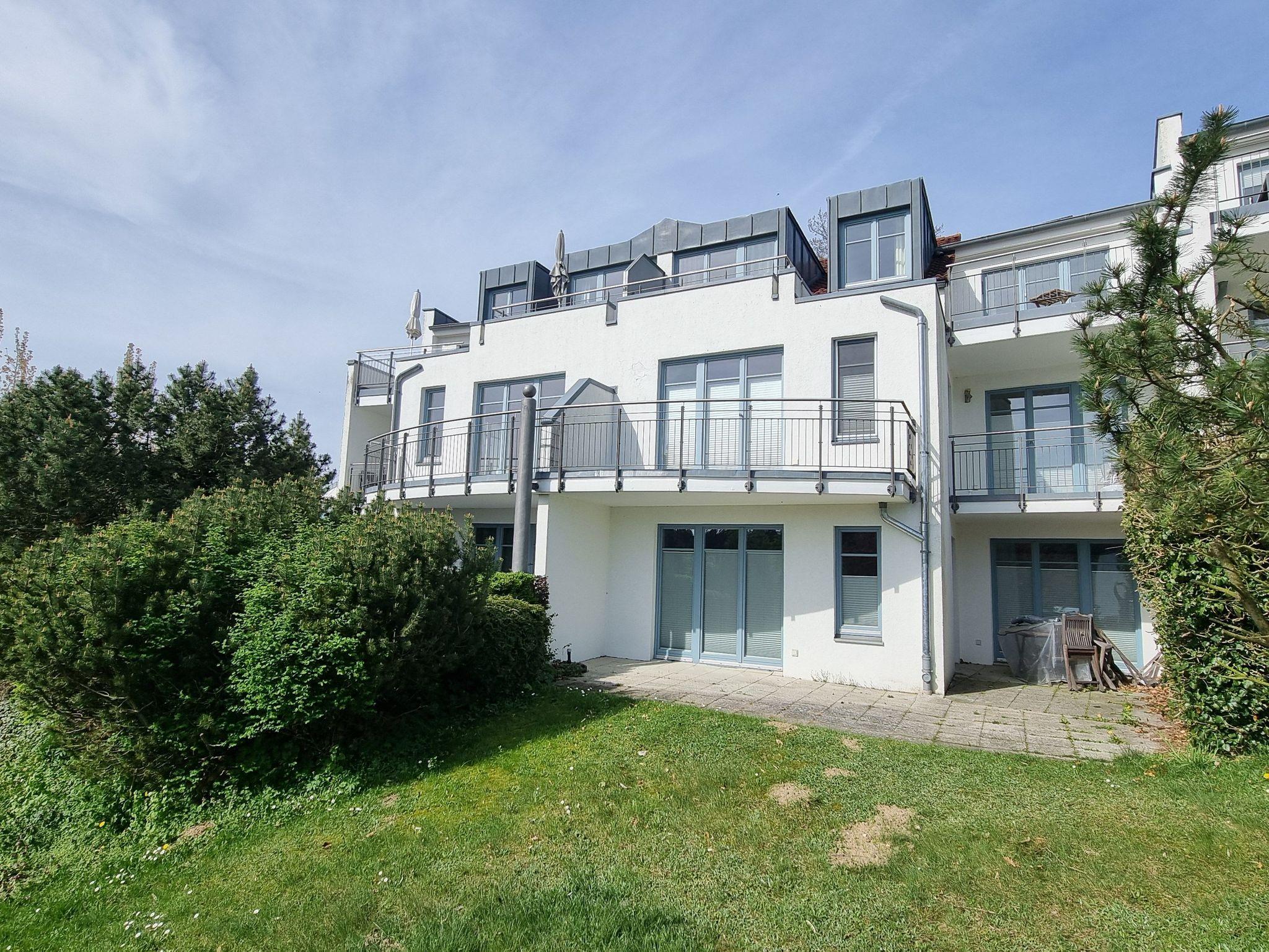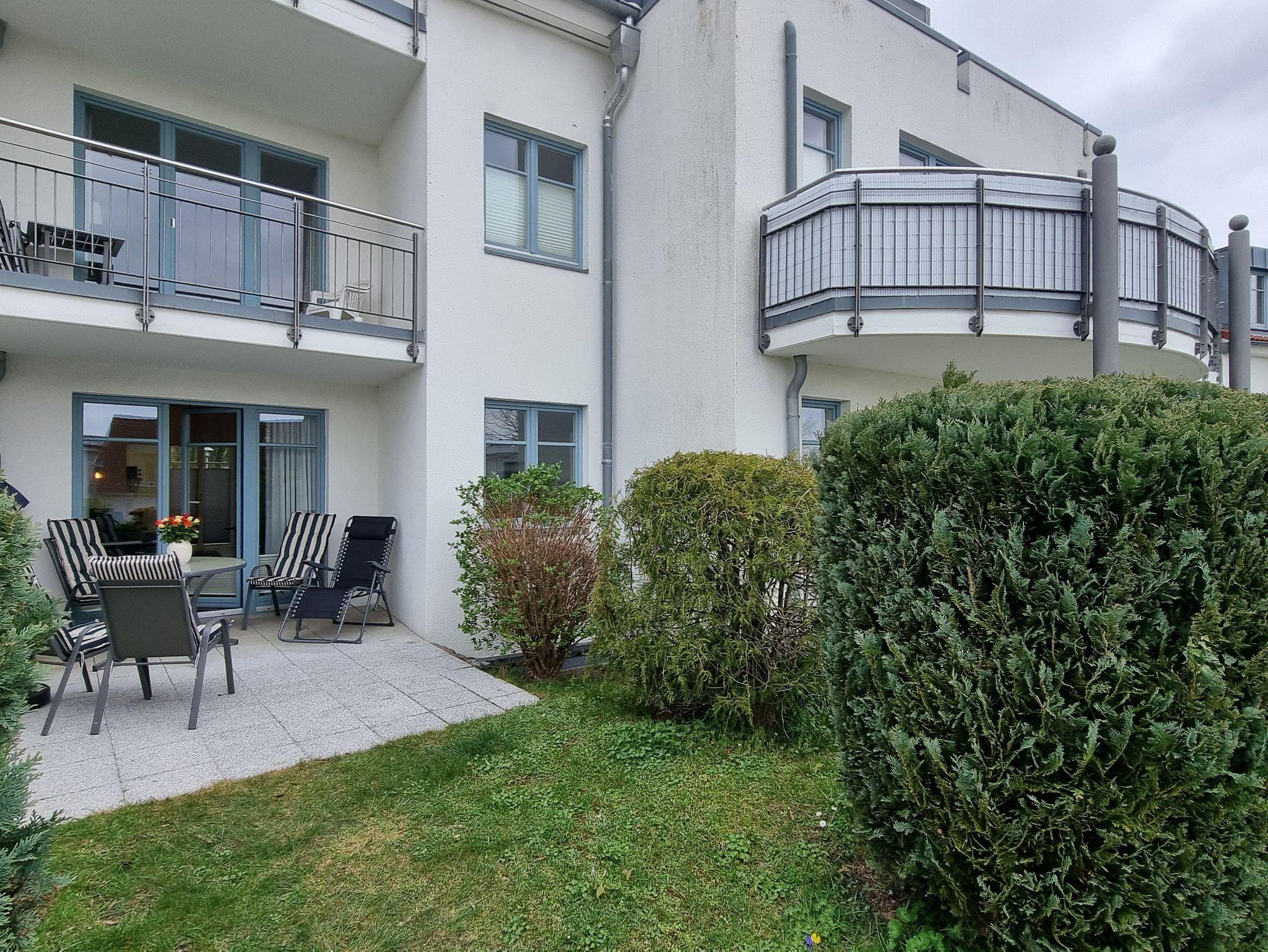 Die Ferienwohnung Nr. 23 mit Terrasse befindet sich im Erdgeschoss in der Residenz Bellevue in 17454 Zinnowitz, Heimweg 10 und bietet einen Blick auf das Umfeld und die Landschaft.