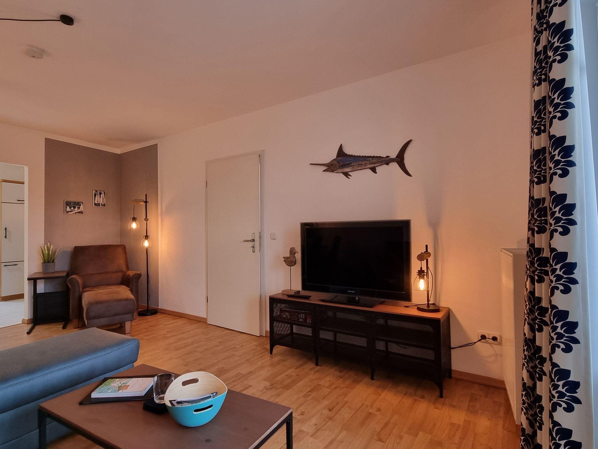 • 1 Wohnzimmer mit 1 Schlafsofa (140 x 200 cm), 1 Hocker, 1 Lese-Sessel mit Hocker, 1 Couchtisch, 1 Esstisch mit Platz für 4 Personen, einem Flachbild-Fernseher und 1 TV - Schrank.
