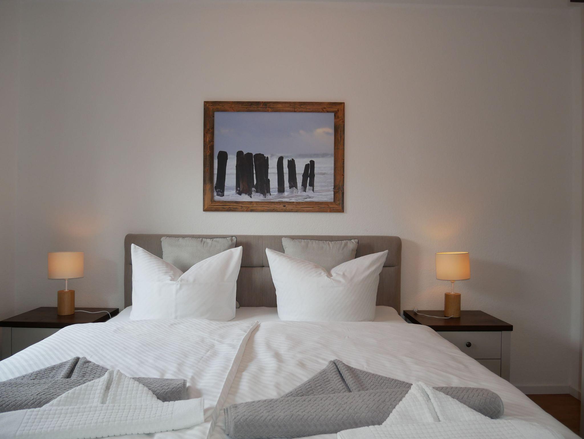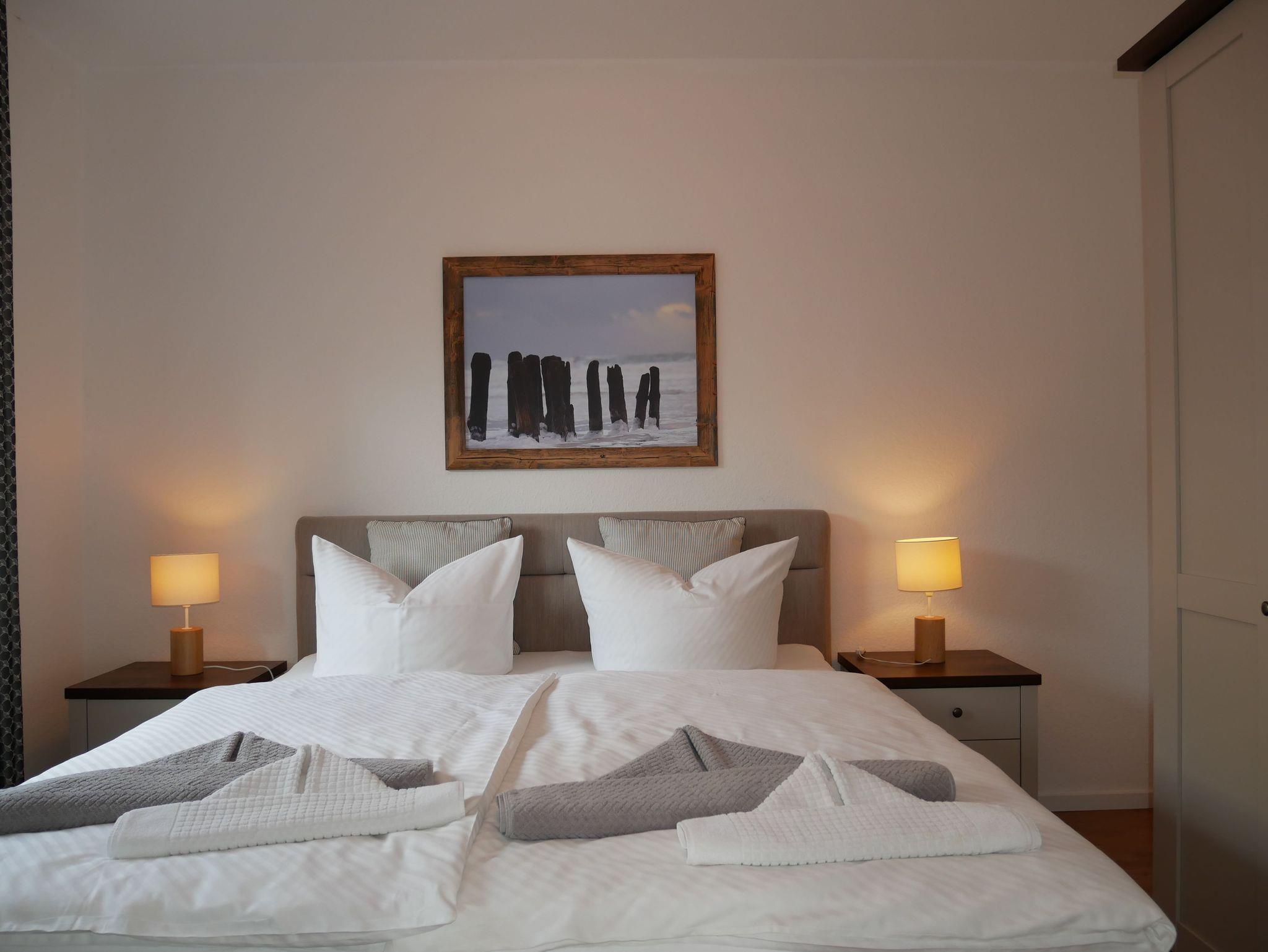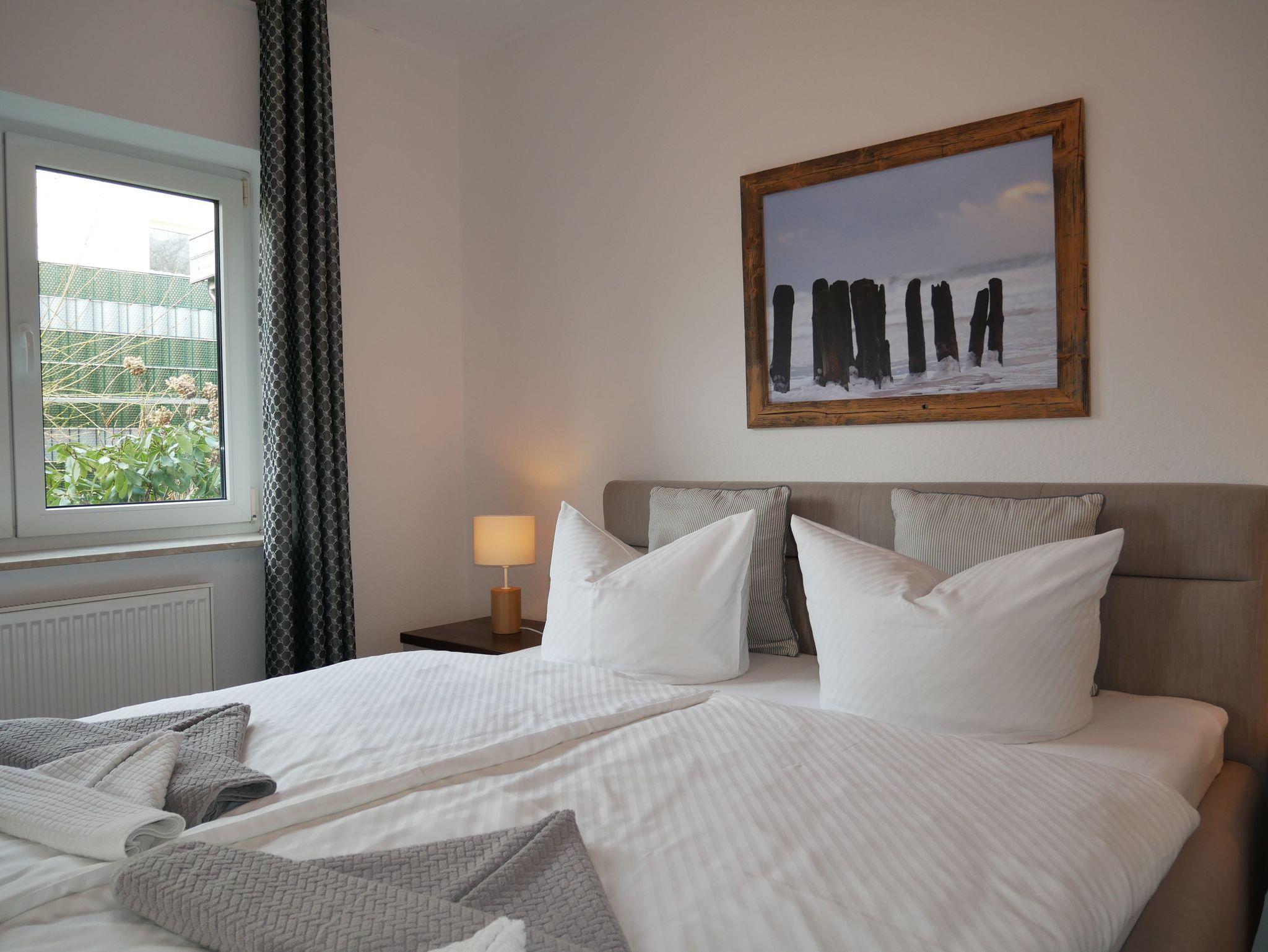 Ein helles und freundliche Schlafzimmer begrüßt Sie mit einem Doppelbett und einem Kleiderschrank.