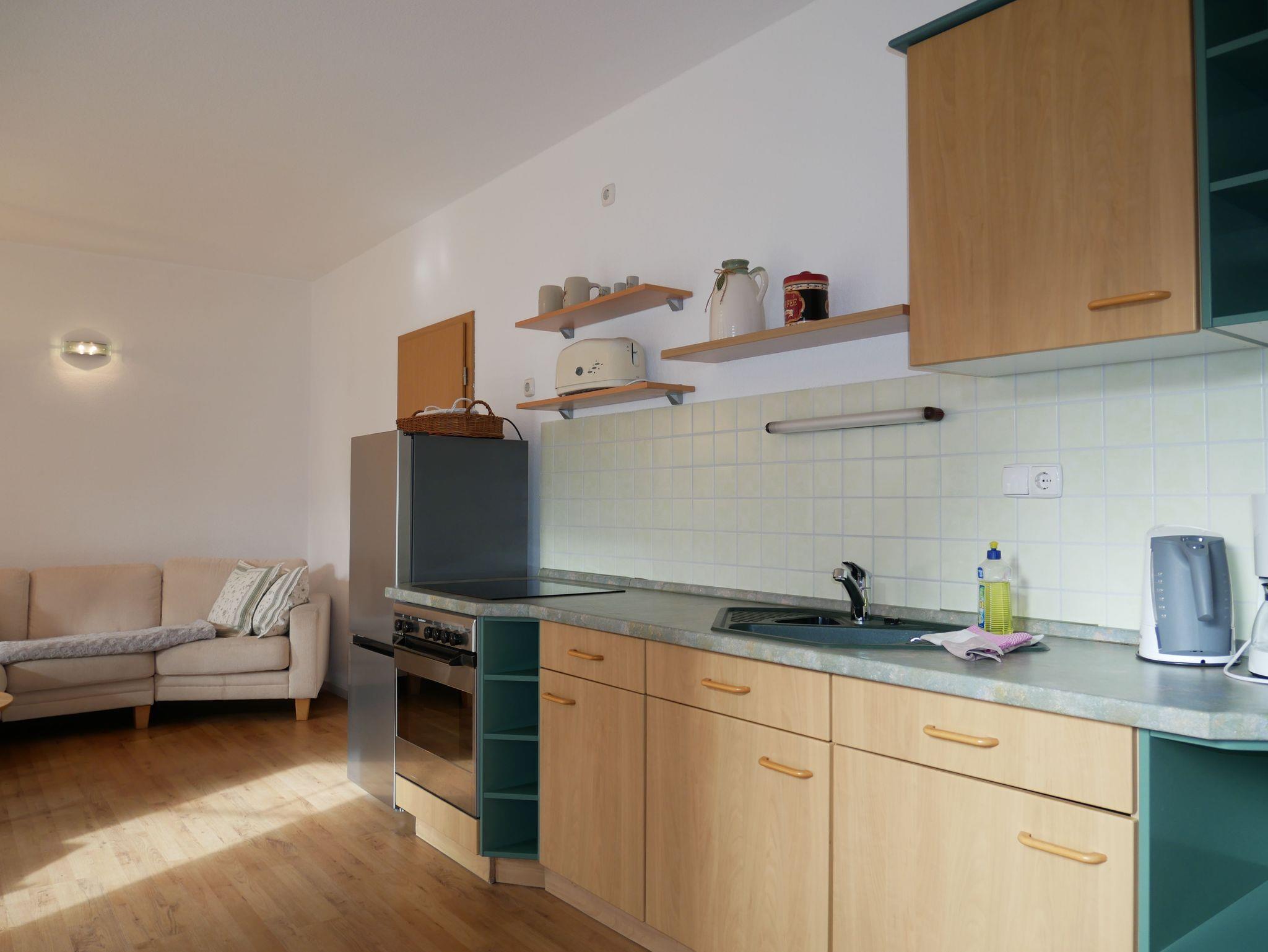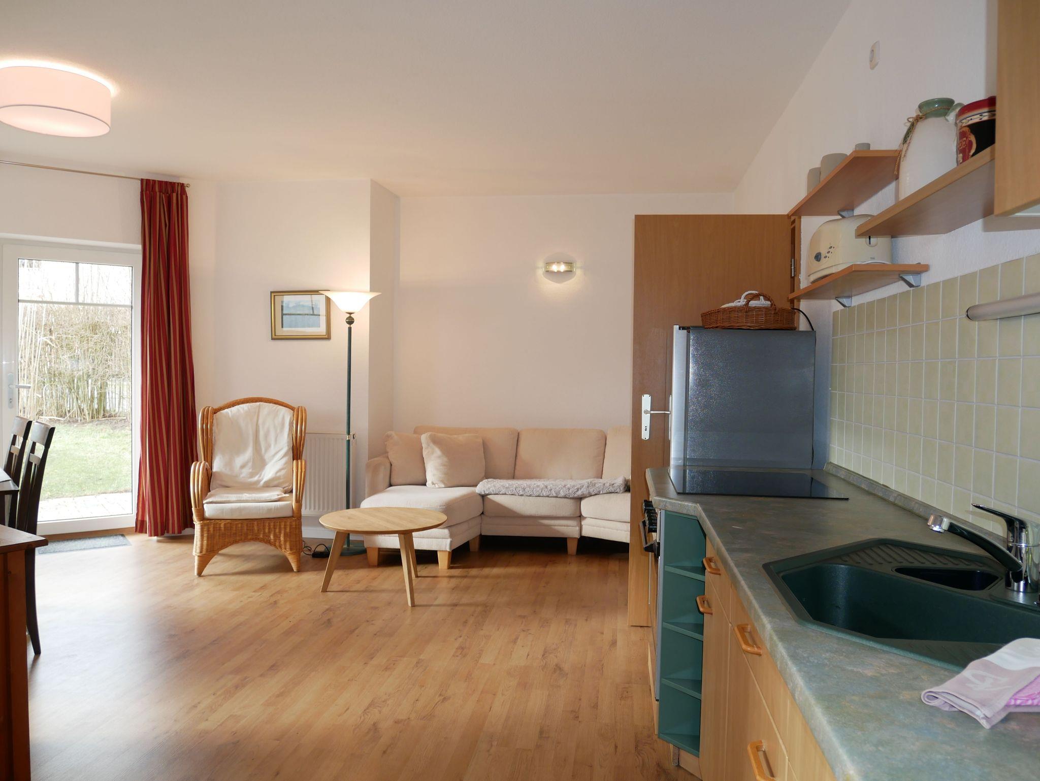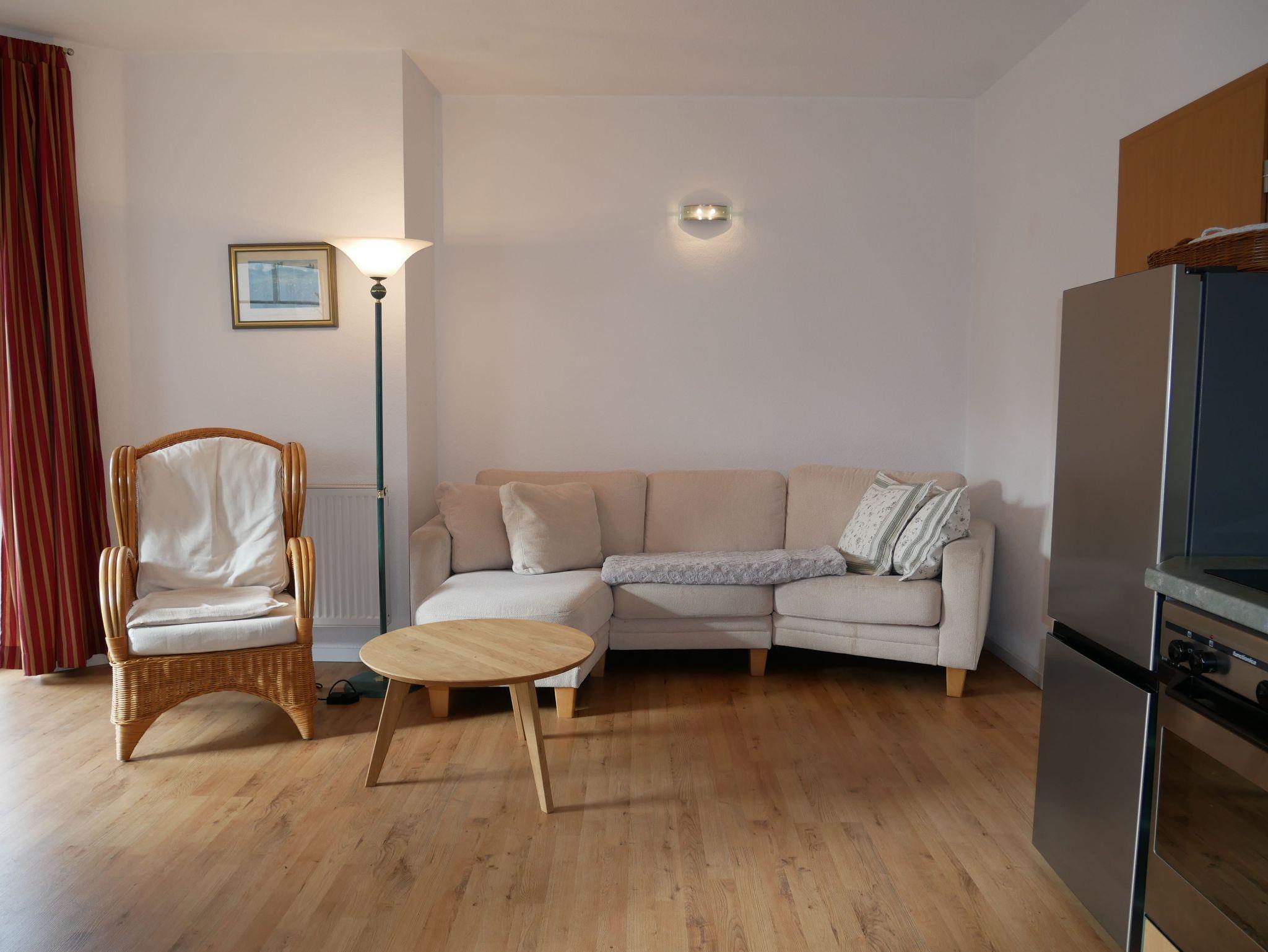 Das Wohnzimmer ist neben einer Sitzecke mit Couch, einen Flachbild-TV und einem Radio zusätzlich mit einer Pantryküche mit eigenem Kühlschrank und Spülmaschine ausgestattet. Ein Gefrierfach befindet sich in der öffentlichen Teeküche im Erdgeschoss.