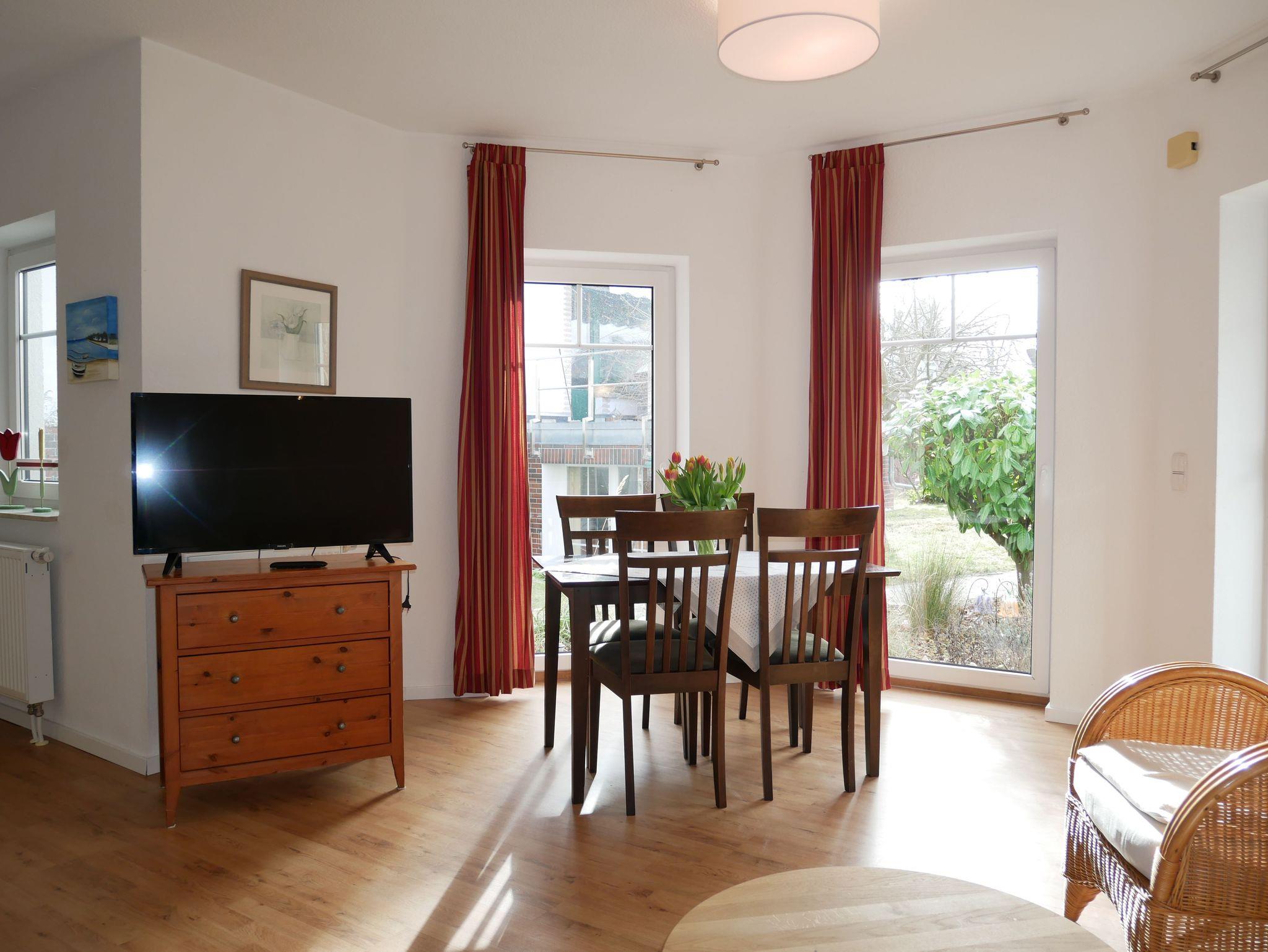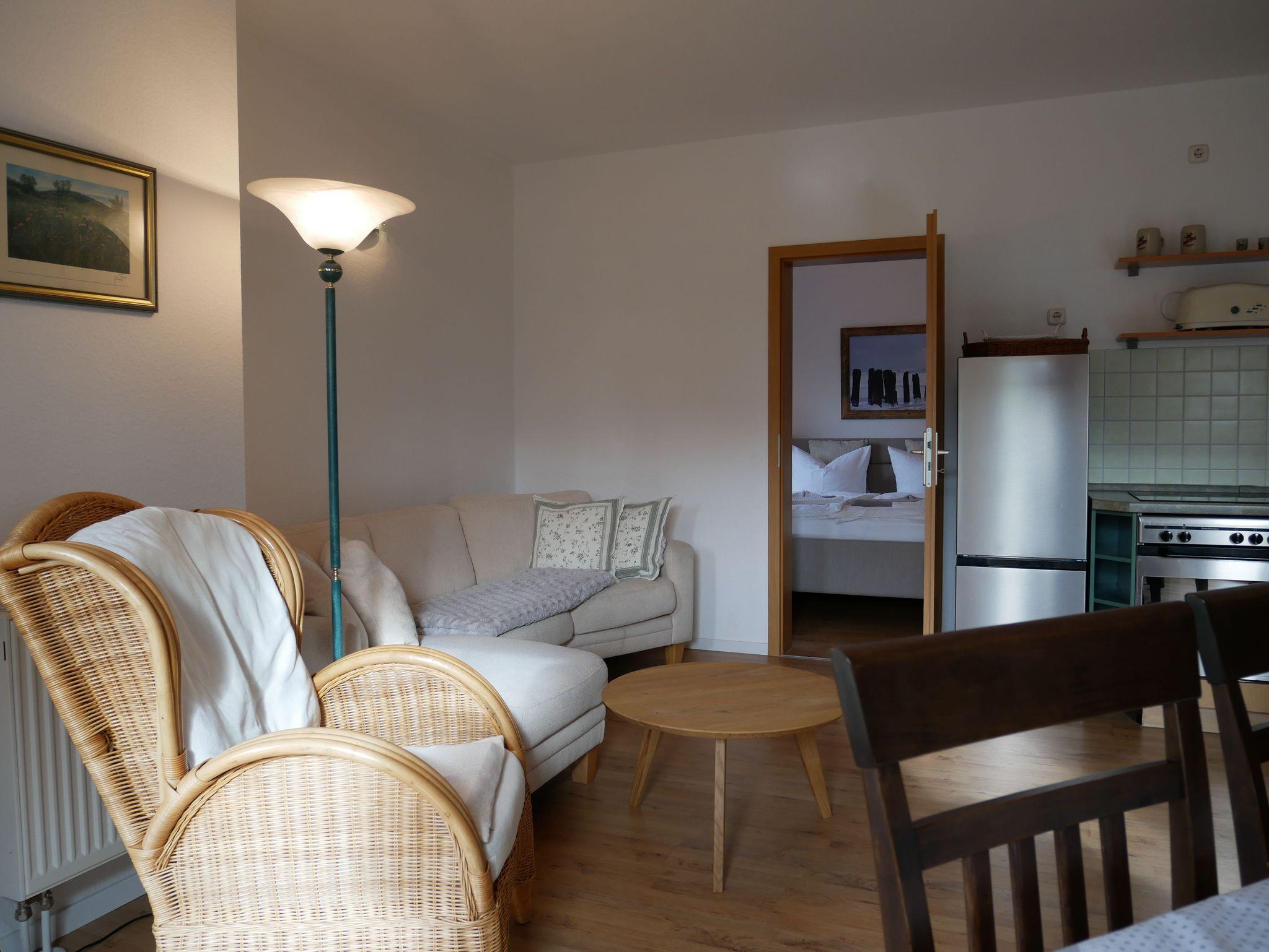 Die 40qm große gemütliche Ferienwohnung befindet sich im Erdgeschoss des Gästehauses und bietet Platz für bis zu 3 Personen (2 Erwachsene und ein 12-jähriges Kind). Sie verfügt über ein getrenntes Schlaf- und Wohnzimmer, eine möblierte Terrasse sowie über ein eigenes Bad mit Dusche.