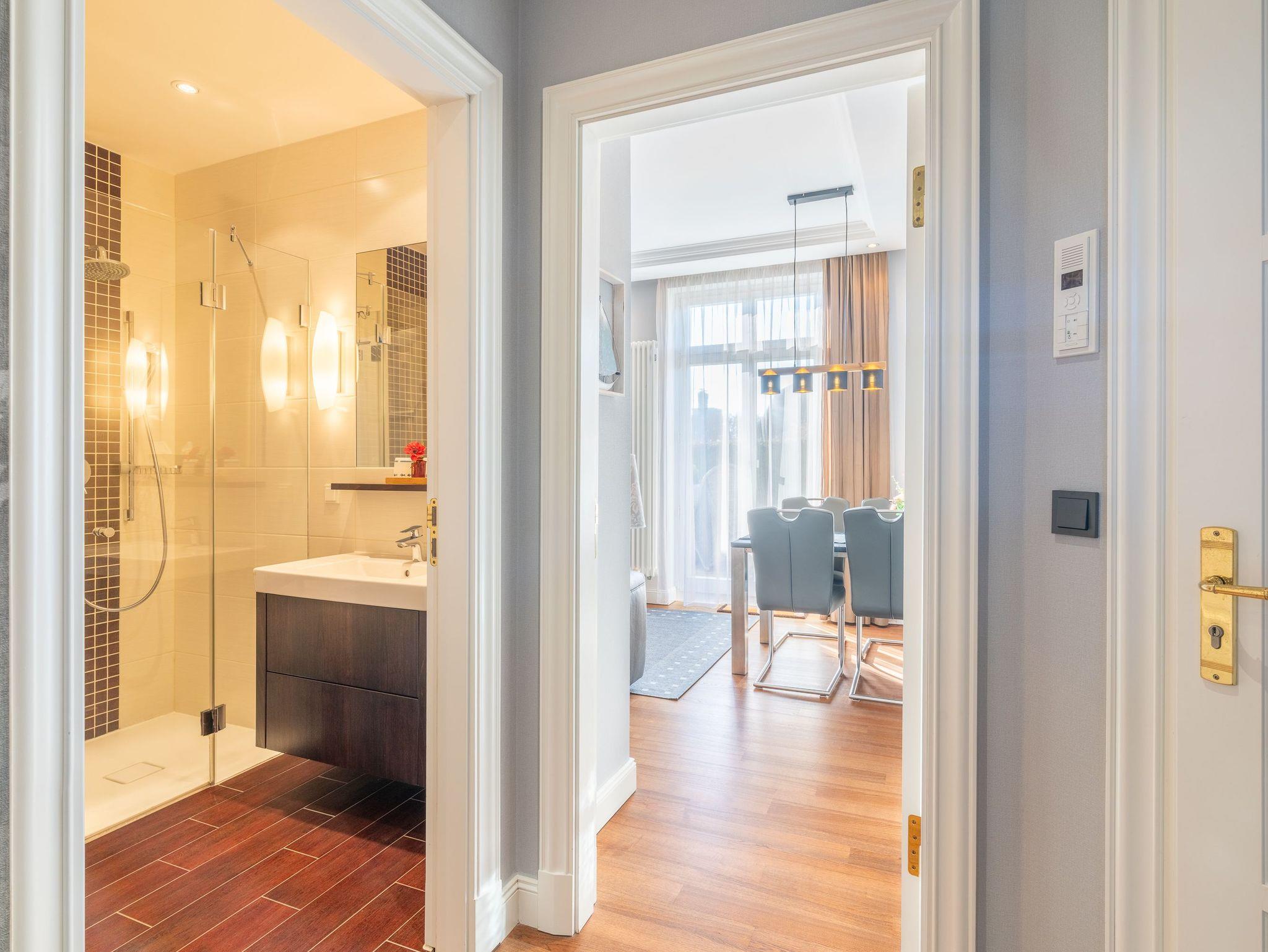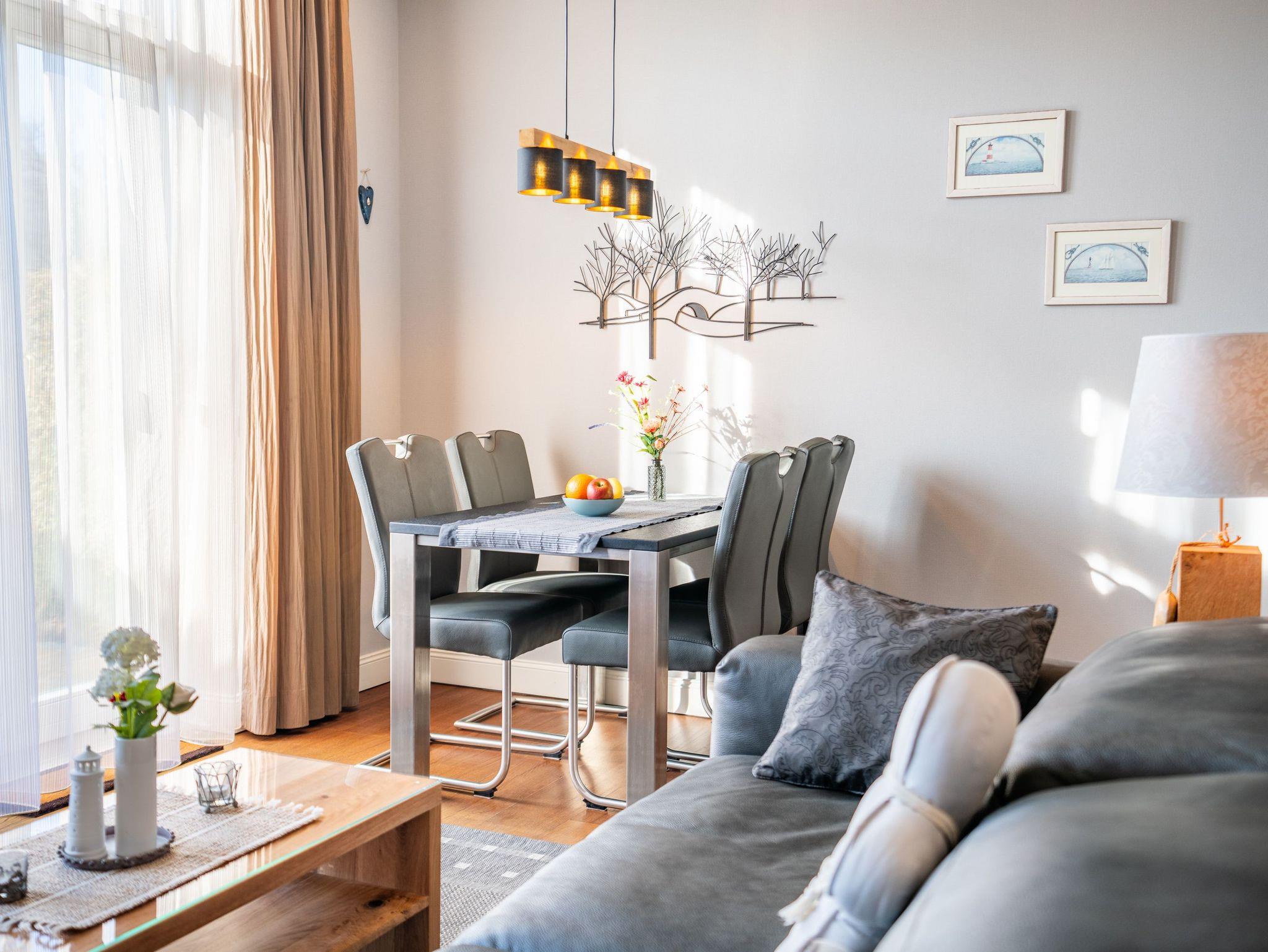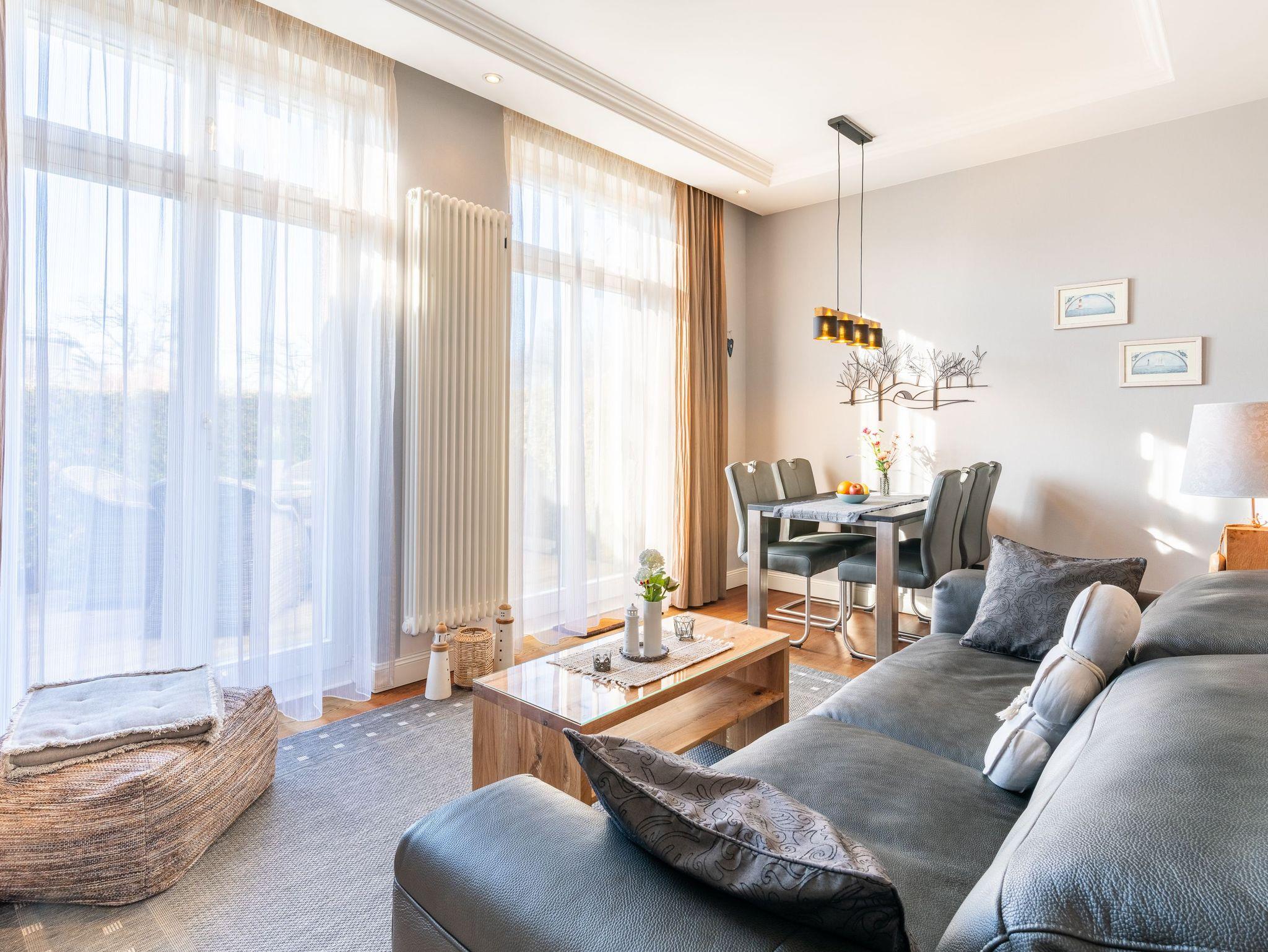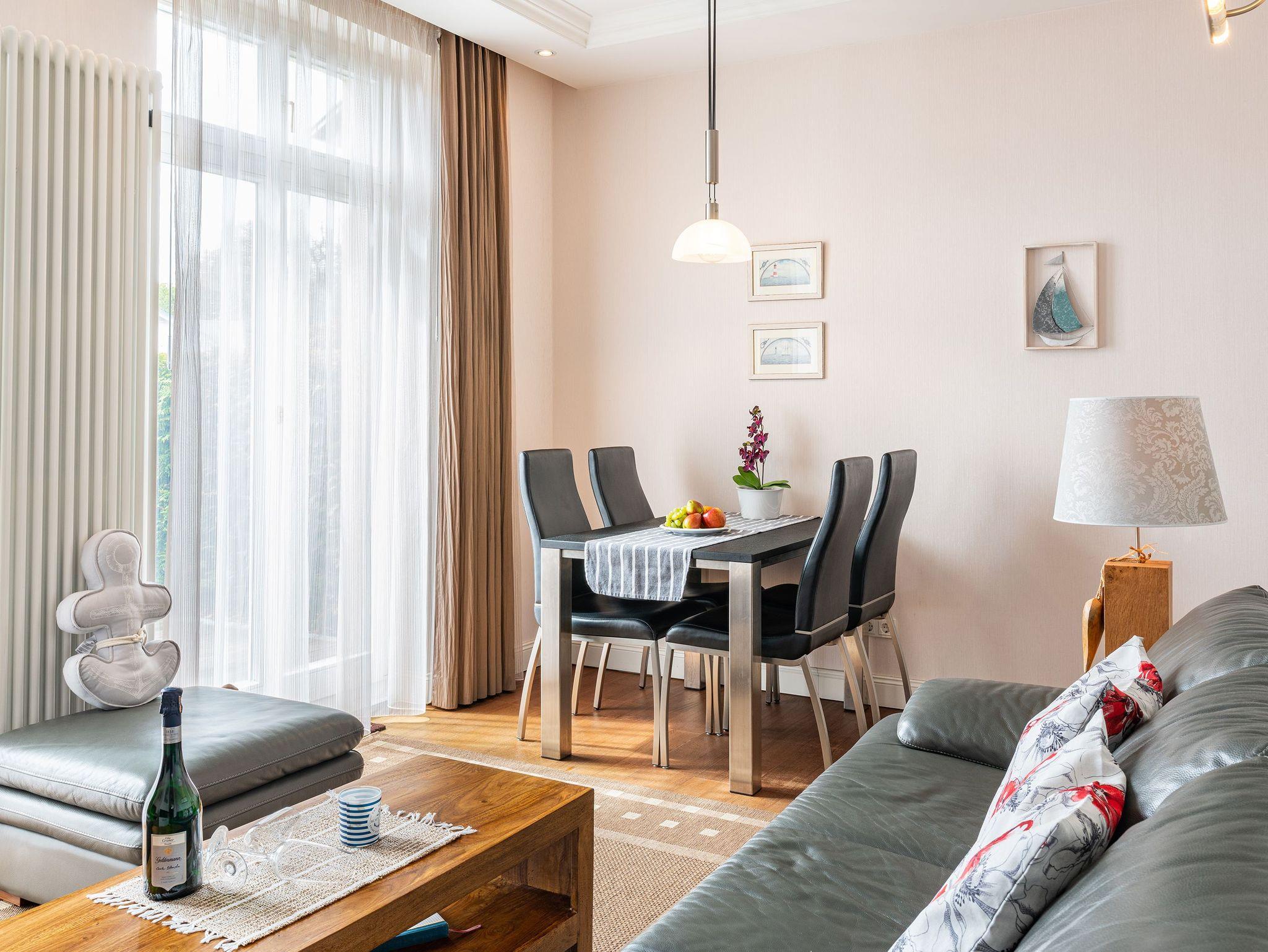 Gebührend verbringen Sie mit bis zu vier Personen diesen auf 55 Quadratmetern im Erdgeschoss der Villa Gruner, im geschmackvoll eingerichteten 3-Zimmer-Appartement mit traumhafter Südterrasse. Der liebevoll eingerichtete Wohnbereich verfügt neben einer Relaxmöglichkeit auf dem edlen Ledersofa, einem Esstisch für 4 Personen über eine optisch vom Wohnbereich abgetrennte edle Küchenzeile (Backofen, Kühlschrank, Geschirrspüler, Mikrowelle, Wasserkocher, Toaster, Kaffeemaschine). Für die romantischen Momente im Urlaub sorgt der im Wohnbereich integrierte Gaskamin.