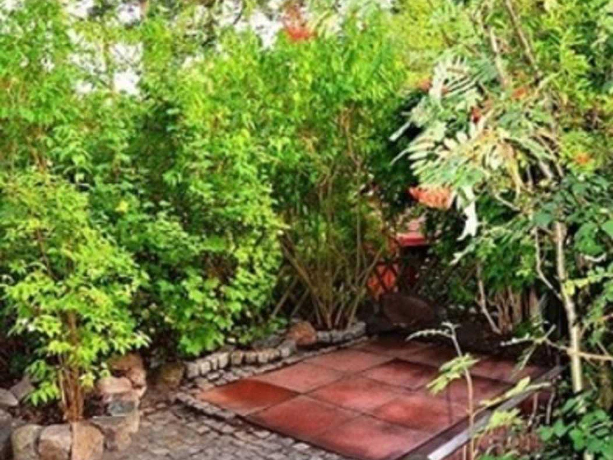 1 überdachte Terrasse mit Gartenmöbeln und kleinem Garten