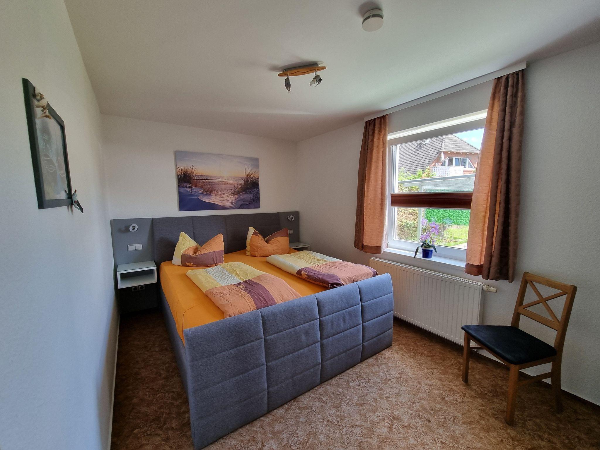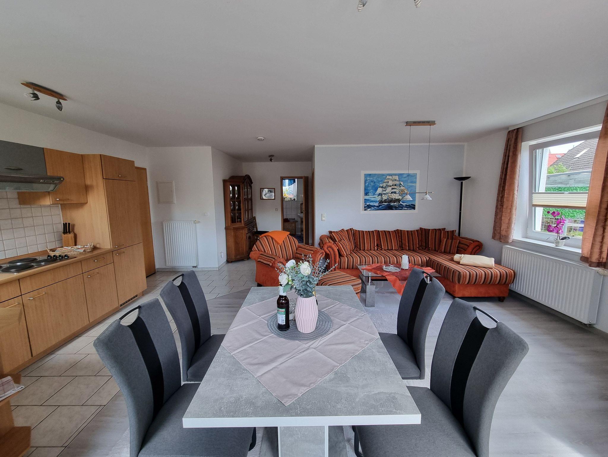 Die Ferienwohnung hat ein Schlafzimmer mit einem großen Doppelbett und ein Wohnbereich mit offener Küche. Es gibt eine gemütliche Couch, SAT-TV und eine gut ausgestattete Küche mit Essbereich.
