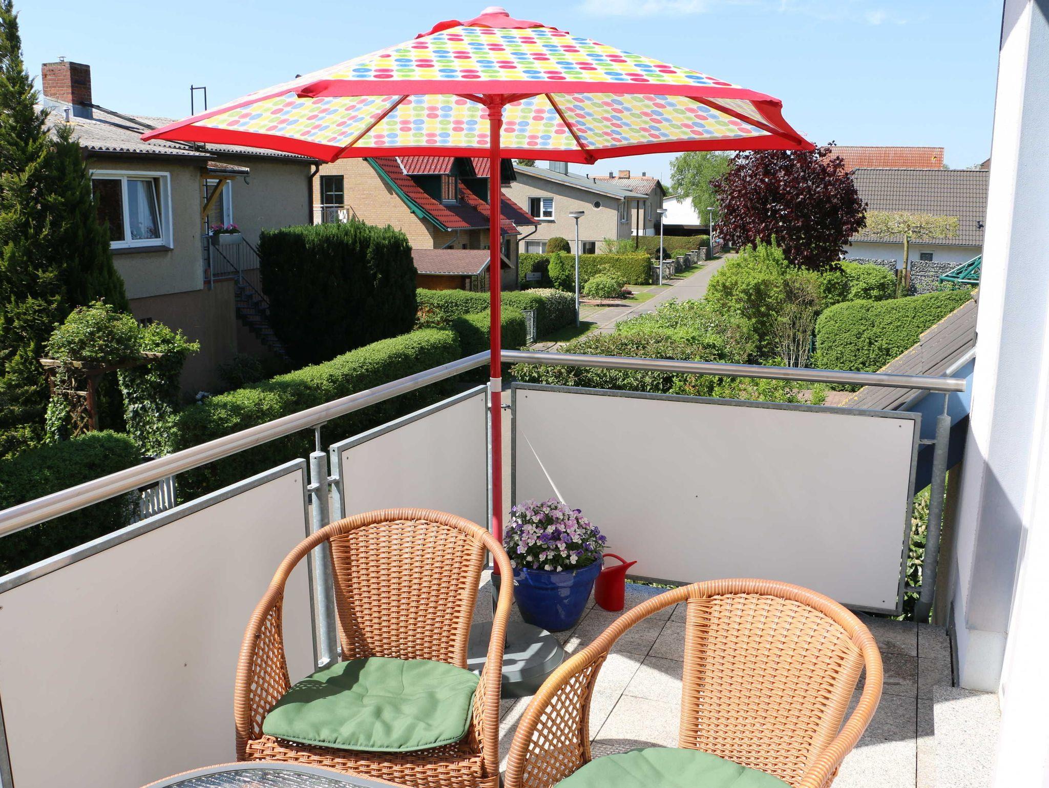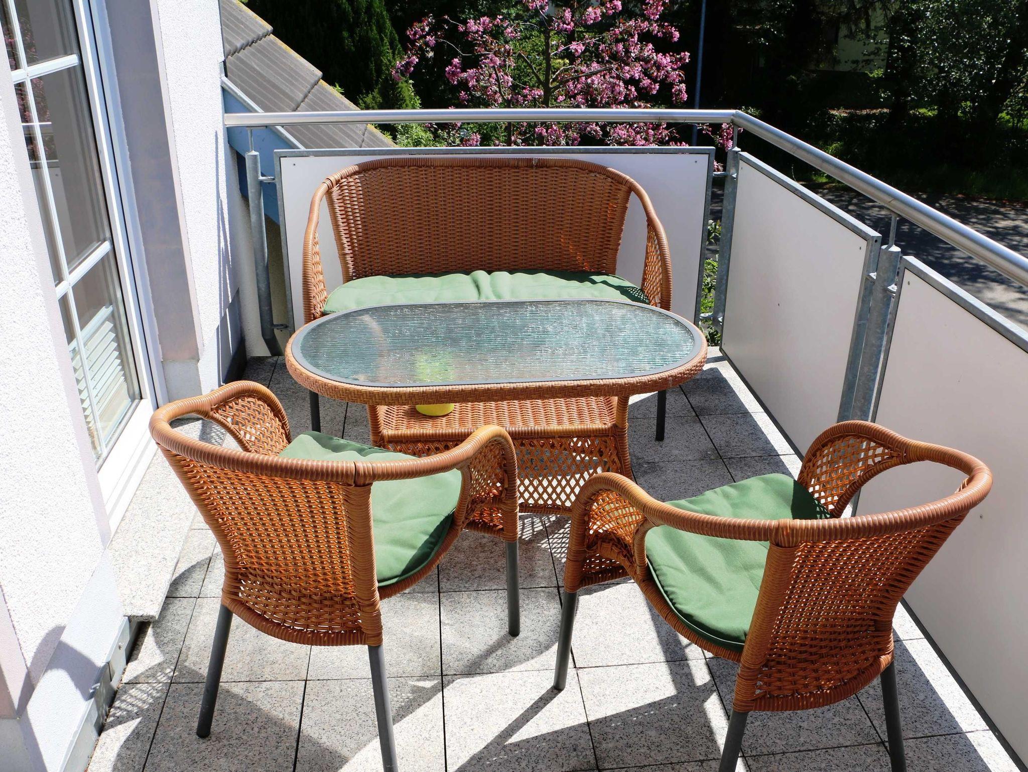 Der möblierte Balkon lädt zum Verweilen oder frühstücken ein.