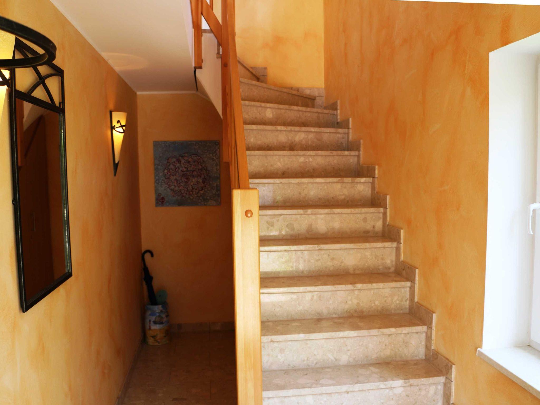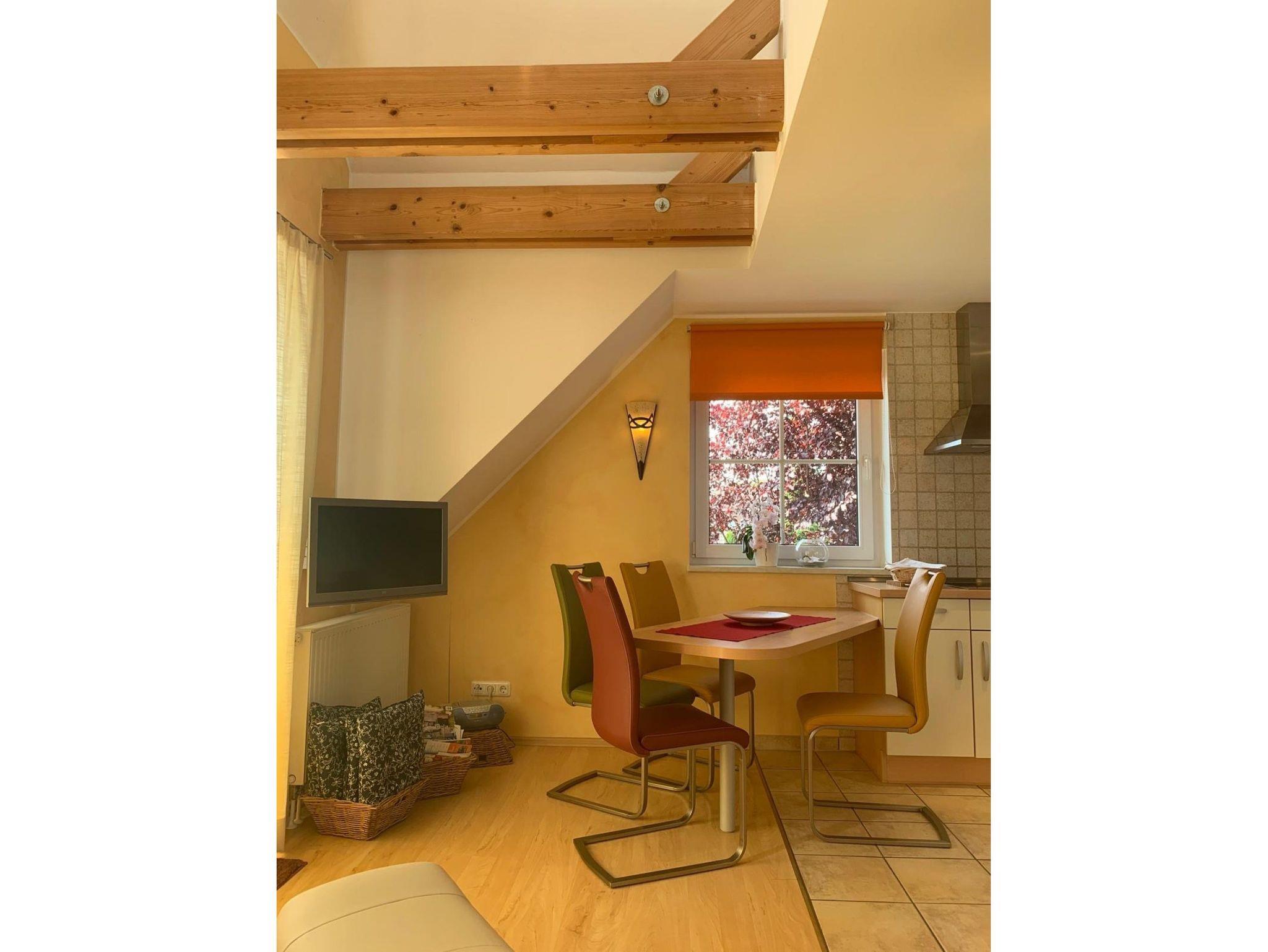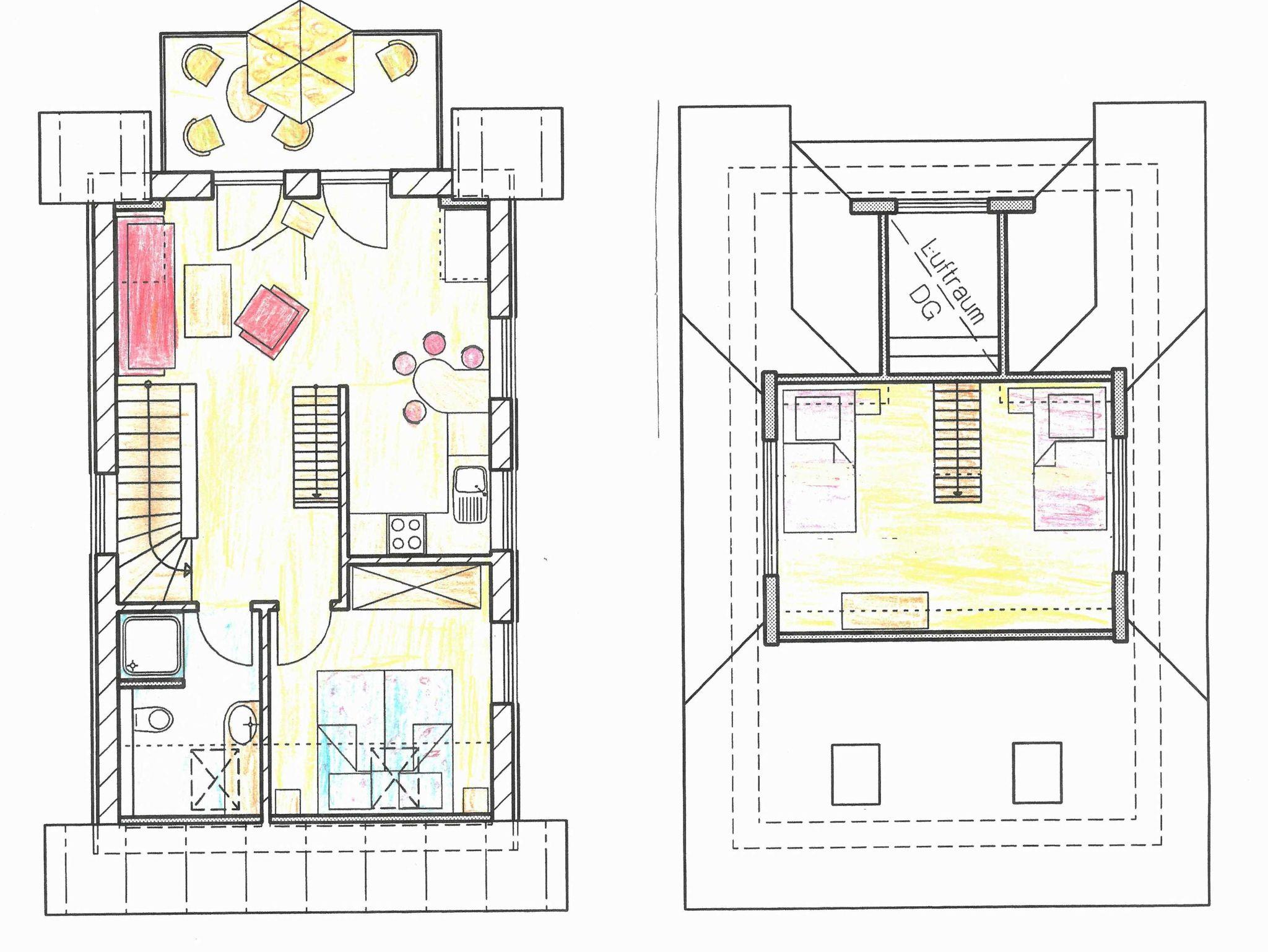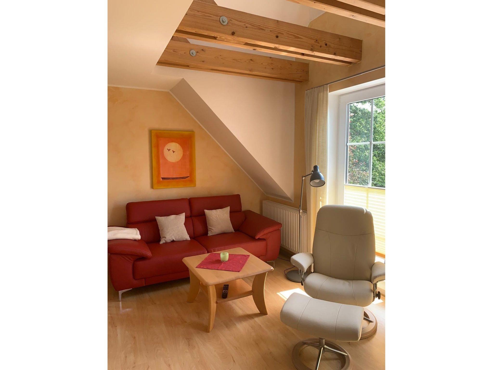 Es gibt ein Wohnzimmer mit offener Küche, ein Schlafzimmer mit Doppelbett, ein Schlafzimmer mit zwei Einzelbetten und ein Bad mit Dusche und WC. Die Küche ist mit einer Spülmaschine, Mikrowelle, Kühlschrank und Gefrierfach, Kaffeemaschine, Toaster und Wasserkocher ausgestattet. Das zweite Schlafzimmer ist für Kinder unter 3 Jahren und für ältere, gehbehinderte Personen aufgrund der steilen Treppe nicht geeignet.