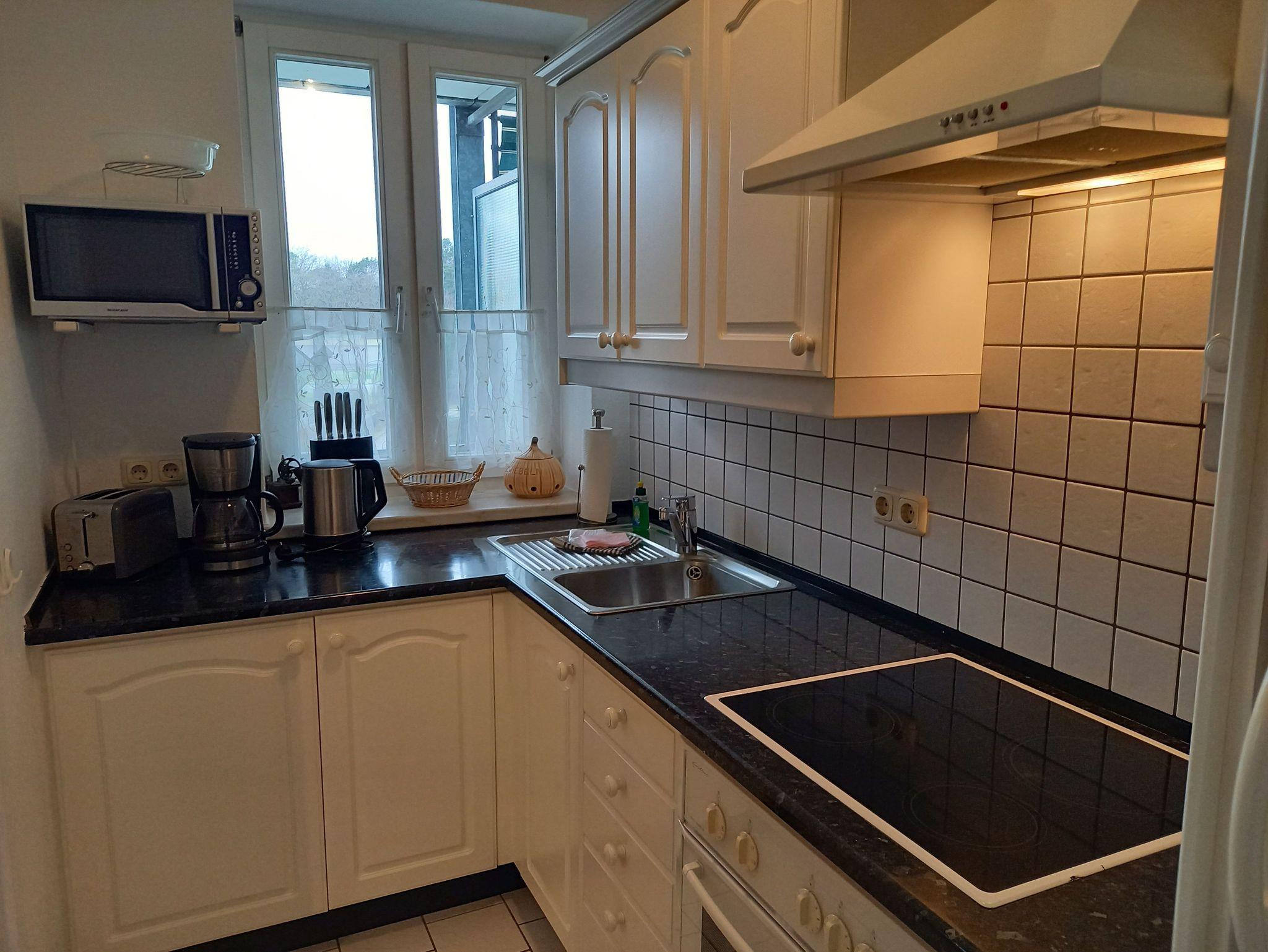 Küche mit Fenster, Kührschrank mit Gefrierwürfel, Mikrowelle, Kaffeemaschine, Wasserkocher, Toaster, Herd mit 4 Ceranplatten+Backofen