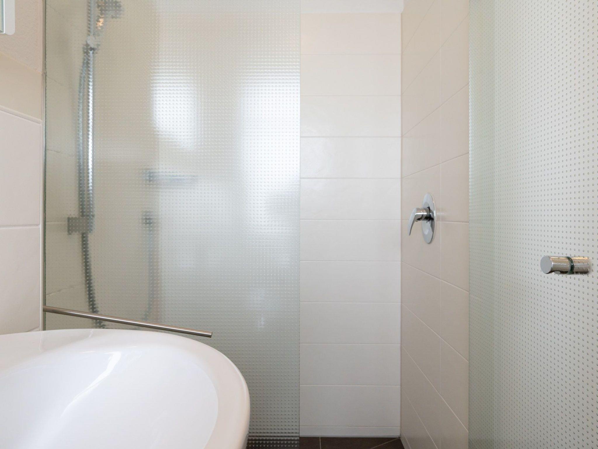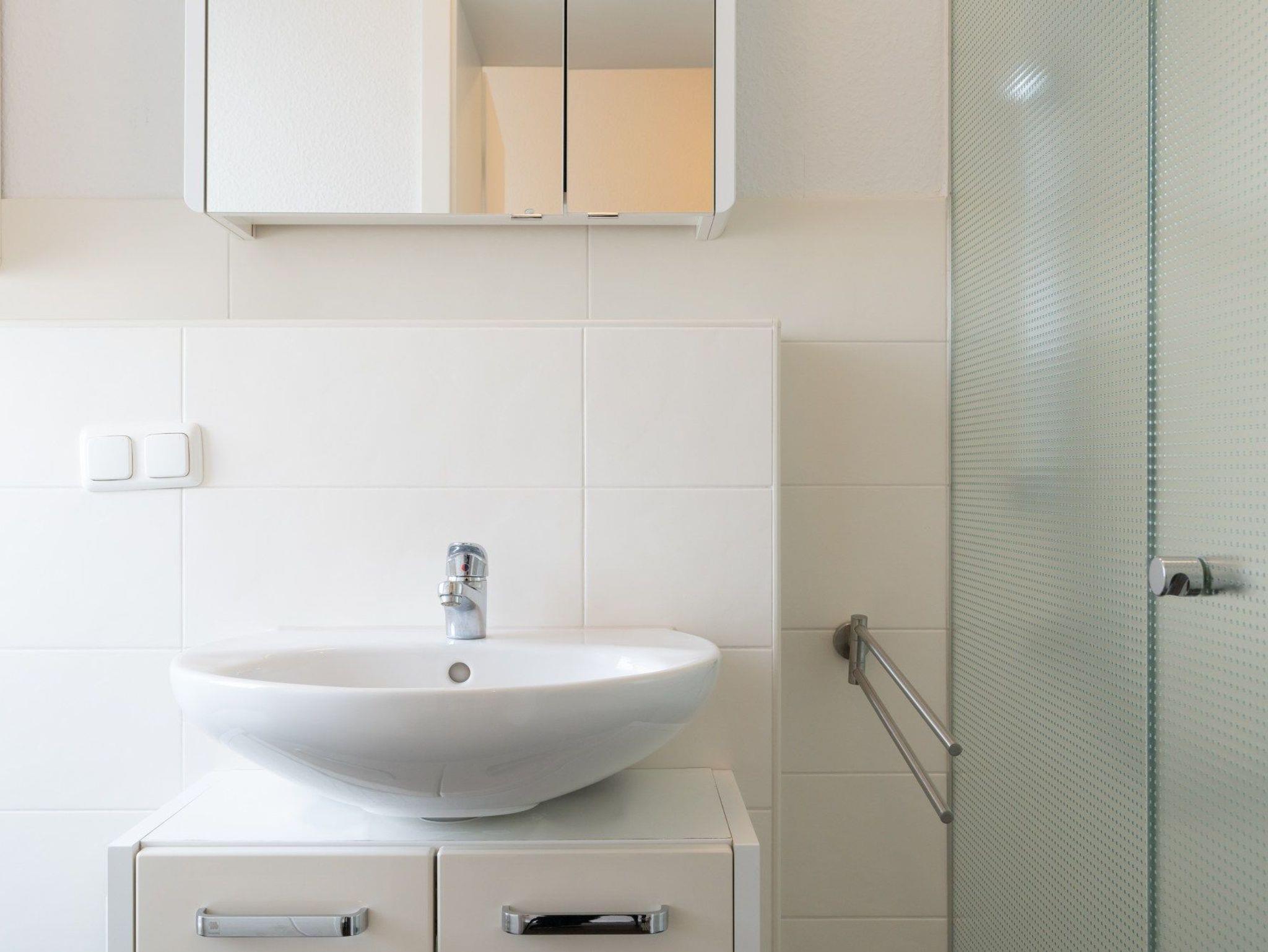 Das Badezimmer verfügt über eine Dusche (ebenerdig) und WC.