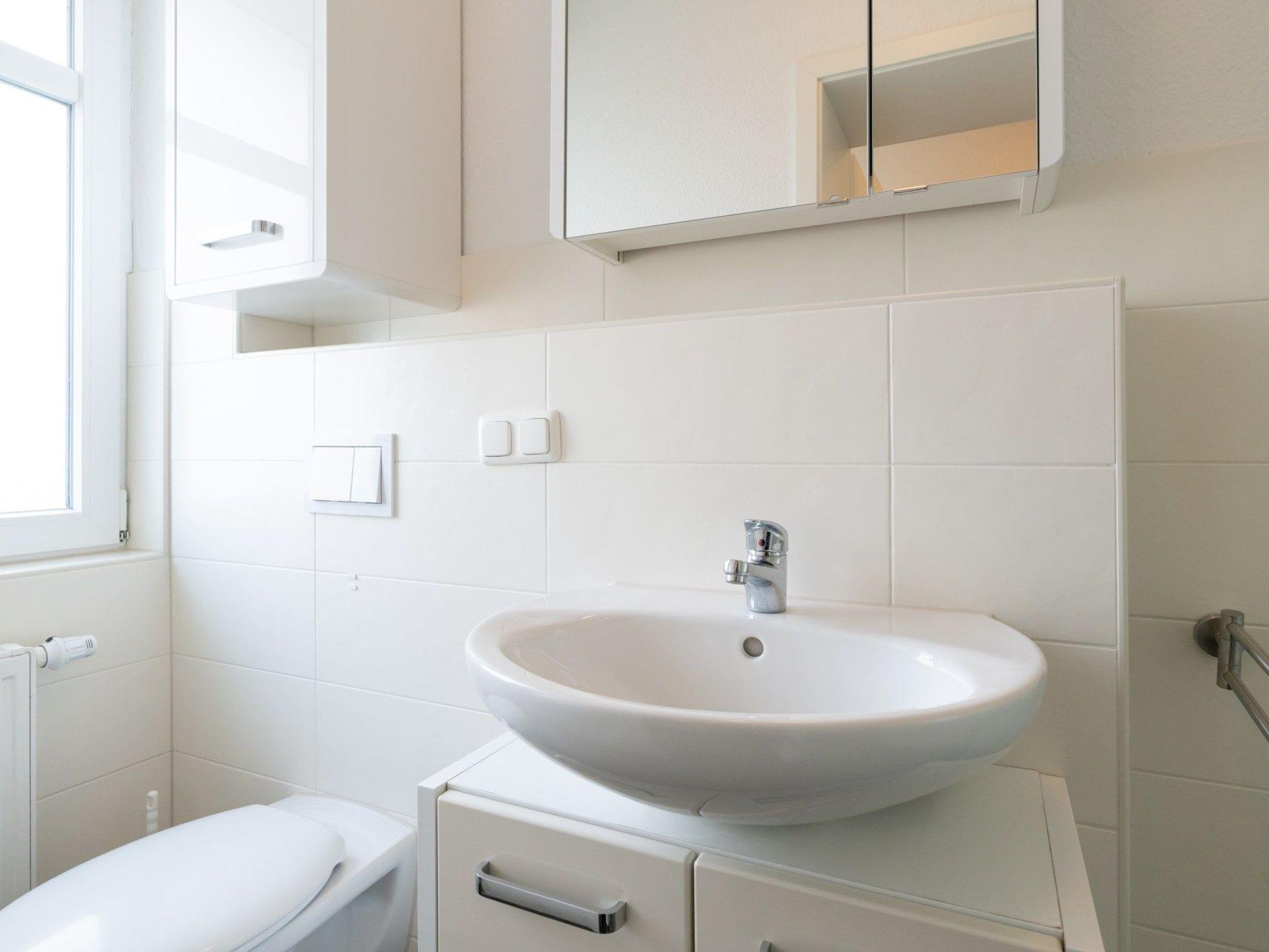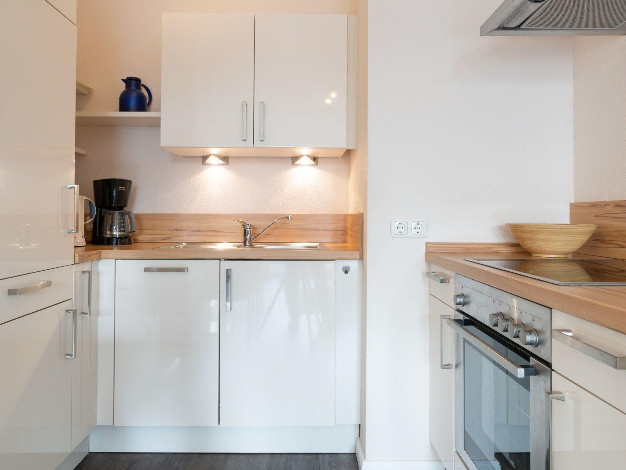 Die hier angrenzende Küchenzeile ist mit einem Kühlschrank mit Gefrierfach, einem Geschirrspüler und einem Backofen mit Cerankochfeld ausgestattet. Eine Kaffeemaschine, ein Toaster und ein Wasserkocher stehen Ihnen hier selbstverständlich zur Verfügung.