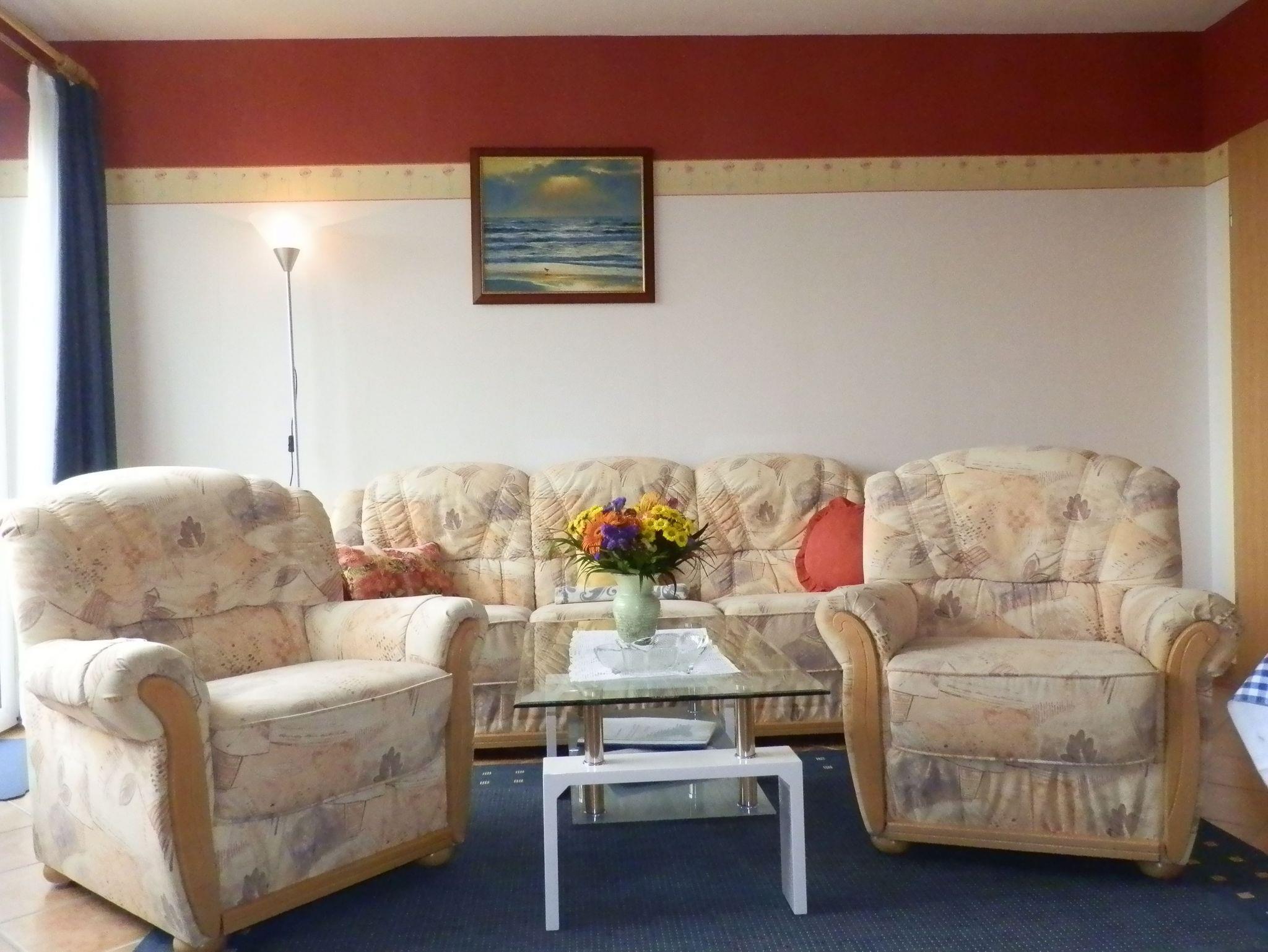 Unser Ferienhaus liegt ca.15 Geh-Minuten vom Strand entfernt in einer ruhigen Wohnlage. Die komplett eingerichtete Ferienwohnung mit Wohnzimmer, zwei Schlafzimmern mit einem Doppelbett und einmal zwei Einzelbetten, Küchenzeile, Dusche, WC, Flur und großem Balkon/Terrasse würde für Sie bereitstehen. Zur Ausstattung gehören weiter Radio, Fernseher, einmalig Bettwäsche und Handtücher. In der Küchenzeile sind Mikrowelle, Kaffeemaschine und Toaster, Eier-und Wasserkocher sowie ein 2-Platten-Kocher, Kühlschrank und Geschirr vorhanden. Eine Aufbettung ist im Wohnzimmer nach Absprache auf dem ausziehbarem Sofa möglich.