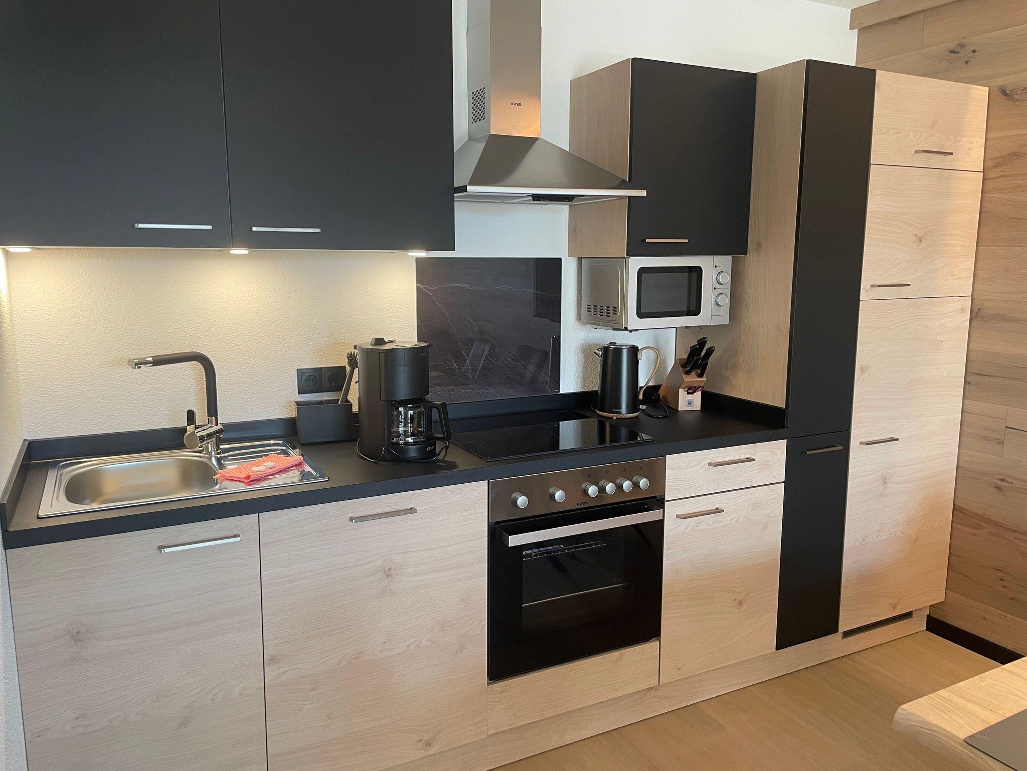 - Küchenbereich mit Küchenzeile (Backofen, Mikrowelle, 4 Zonen - Induktionskochfeld, Kühlschrank mit