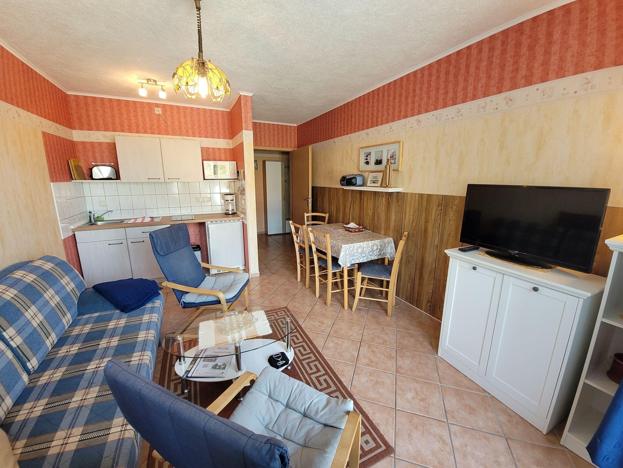 Die komplett eingerichtete Ferienwohnung mit Wohnzimmer, ein Schlafzimmer mit einem Ehebett und einer Liege, Küchenzeile, Dusche, WC, Flur und großem Balkon würde für Sie bereitstehen. Zur Ausstattung gehören weiter Radio, Sat-Fernseher, einmalig Bettwäsche und Handtücher. In der Küchenzeile sind Mikrowelle, Kaffeemaschine und Toaster, Eier- und Wasserkocher sowie ein 2- Platten-Kocher, Kühlschrank und Geschirr vorhanden. Wir möchten Sie darauf hinweisen, dass es sich bei unseren Ferienwohnungen um Nichtraucherwohnungen handelt. Natürlich dürfen Sie auf dem Balkon oder der Terrasse rauchen. Die Waschmaschinen- und Trocknerbenutzung ist nach vorheriger Absprache möglich.
