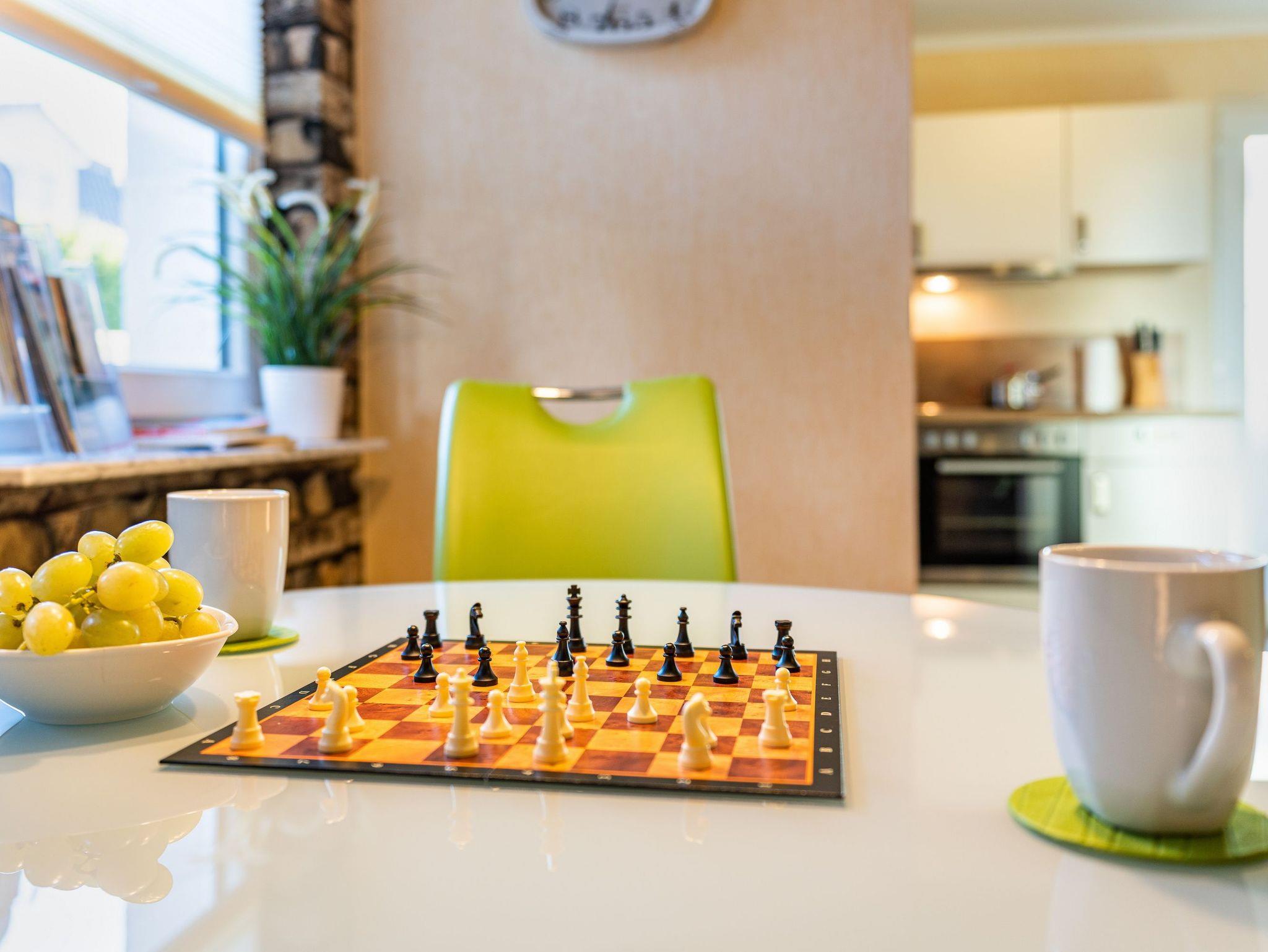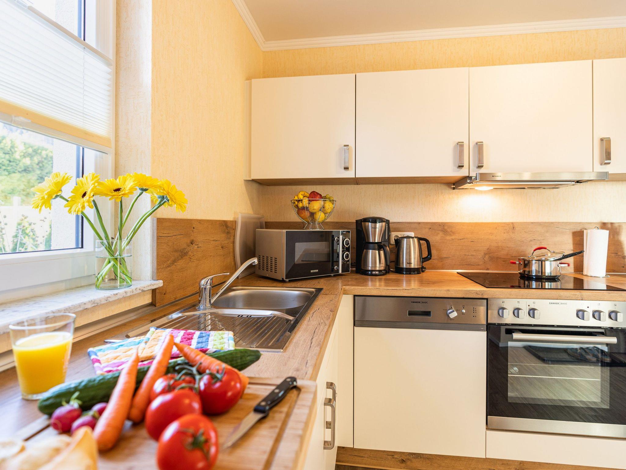 Der Wohnraum ist in hellen Farben gehalten. Sofa und FlatTV sowie ein Esstisch für zwei Personen laden zum Erholen, Entspannen und Schlemmen ein. Die separate Küche ist mit allem (Backofen, Kühlschrank mit Gefrierfach, Geschirrspüler, Mikrowelle, Wasserkocher, Toaster, Kaffeemaschine) ausgestattet, was Sie für die Zubereitung Ihrer Lieblingsspeisen benötigen.