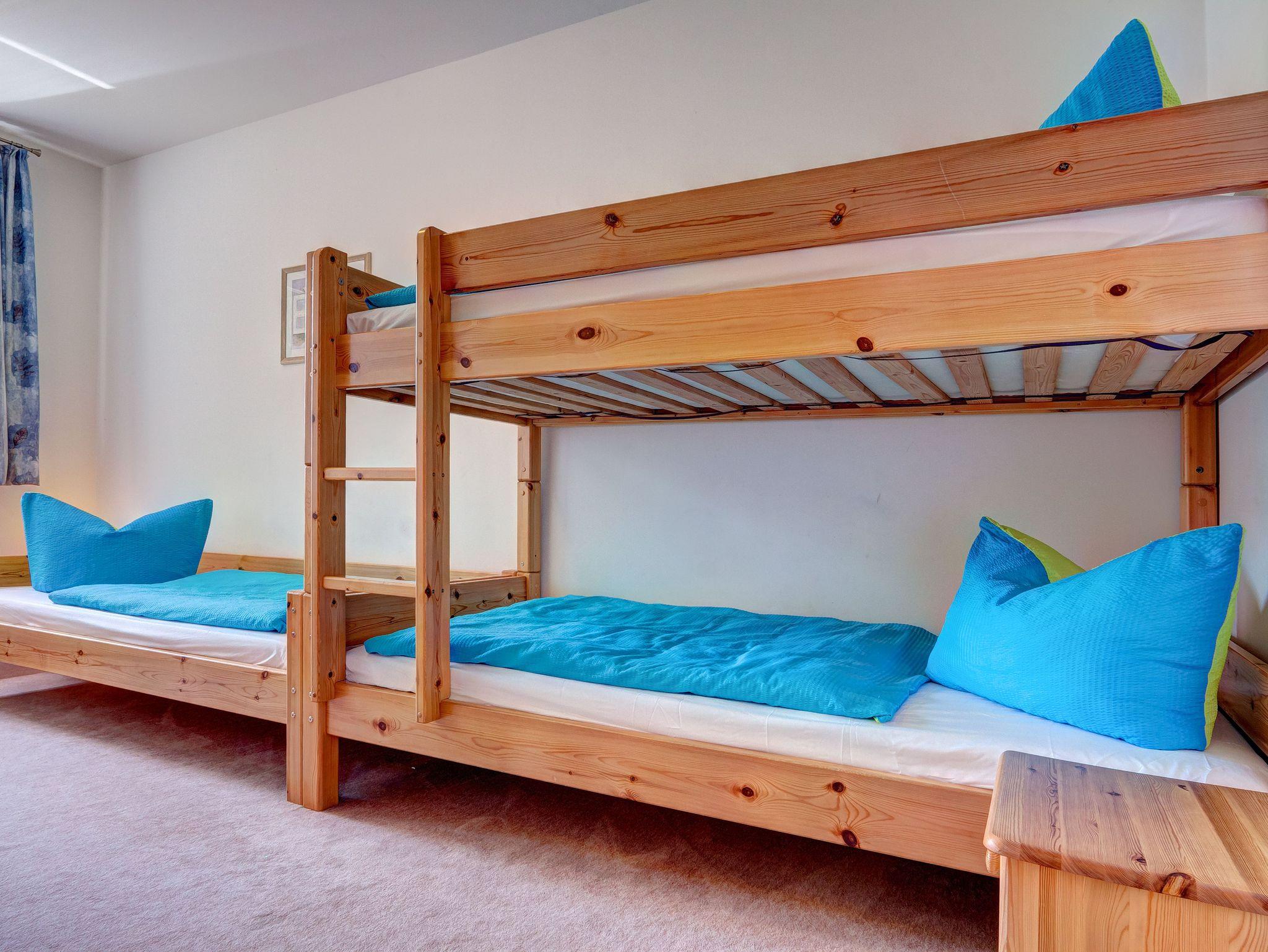 Über eine stabile Holztreppe gelangen Sie in das Obergeschoß, wo sich die beiden Schlafzimmer befinden. Eines davon mit Doppelbett, das andere mit einem Doppelstockbett und einem Einzelbett.