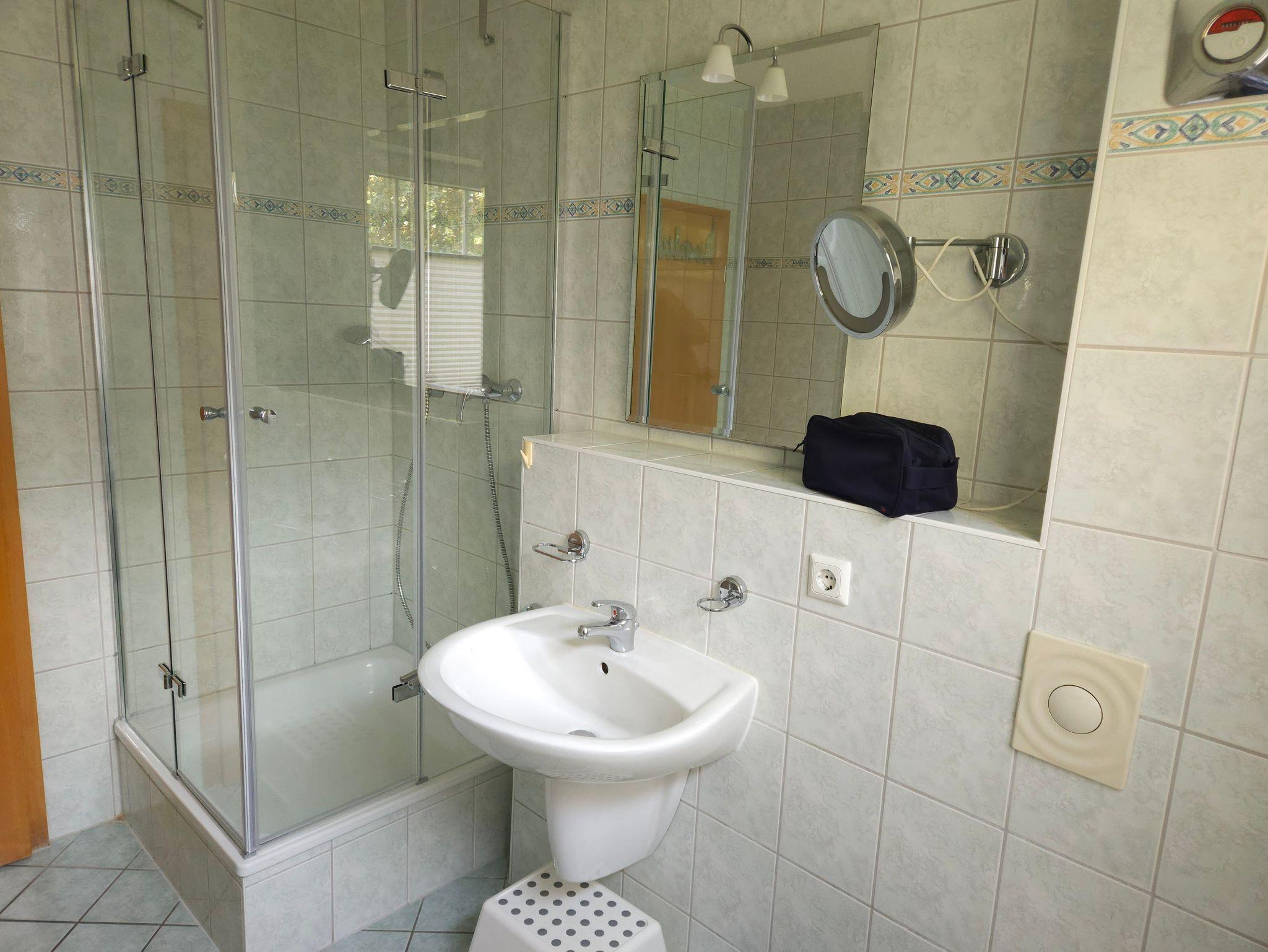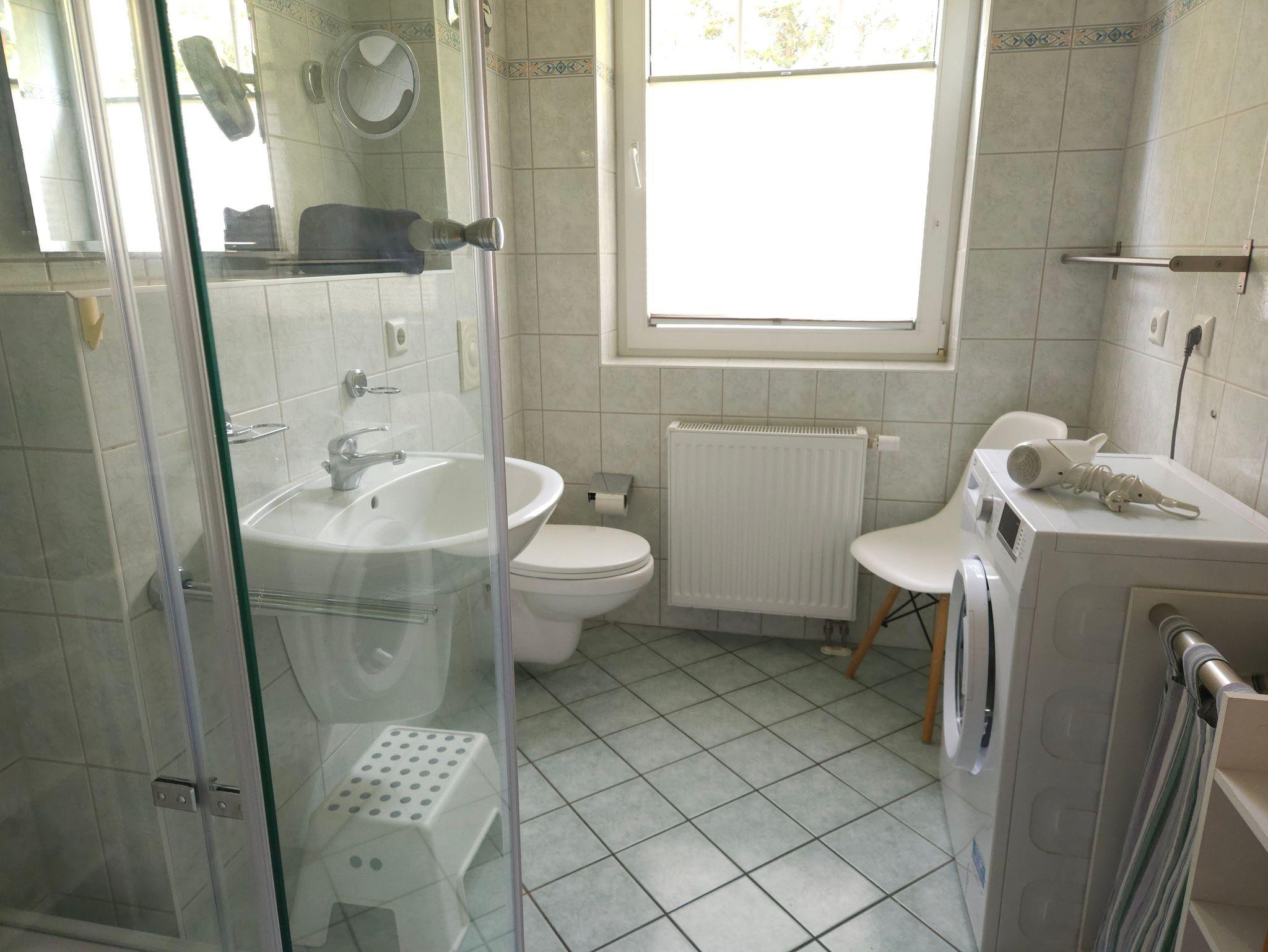 Das durch ein großes Fenster natürlich beleuchtete Bad verfügt über Waschbecke, WC und eine geräumige Dusche mit Schiebetüren. Außerdem findet sich dort eine Waschmaschine zur kostenlosen Nutzung.