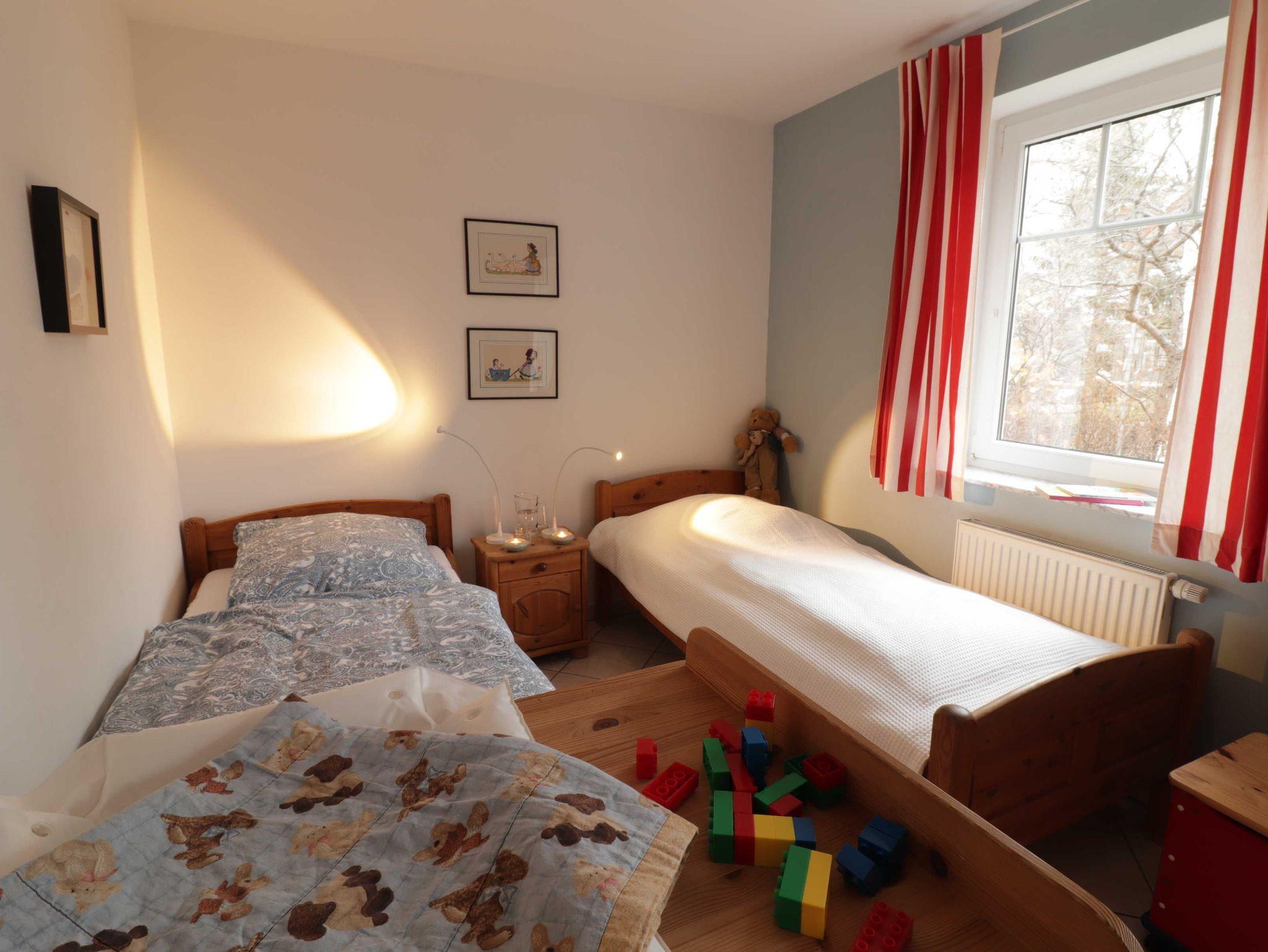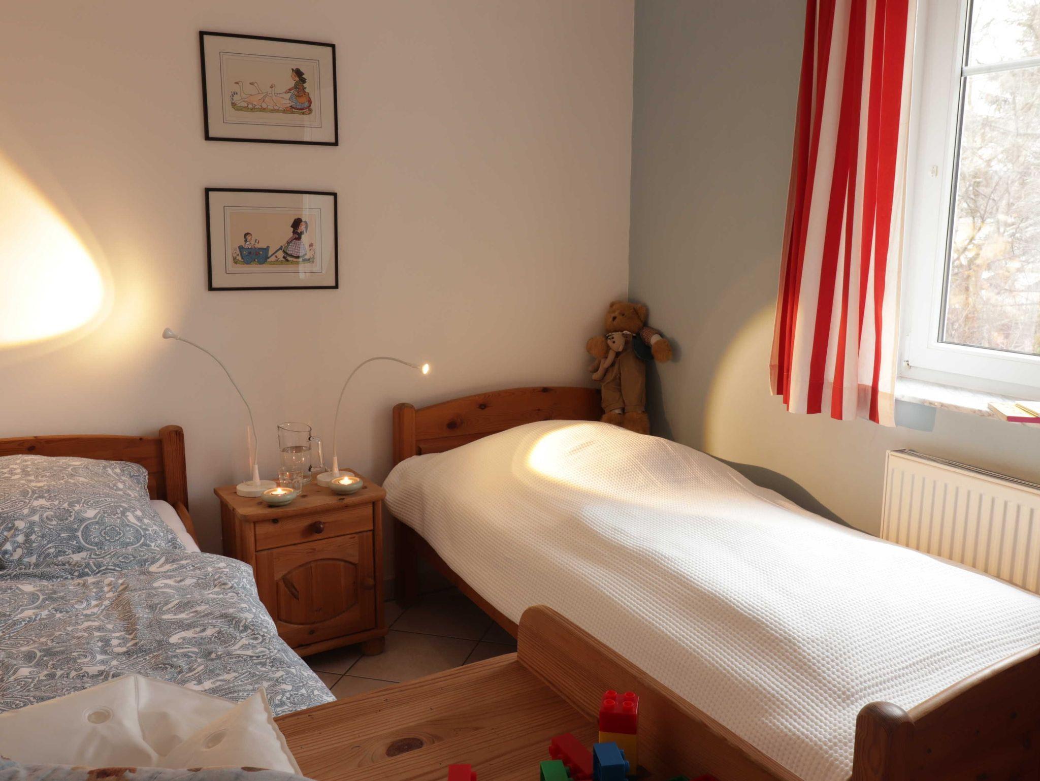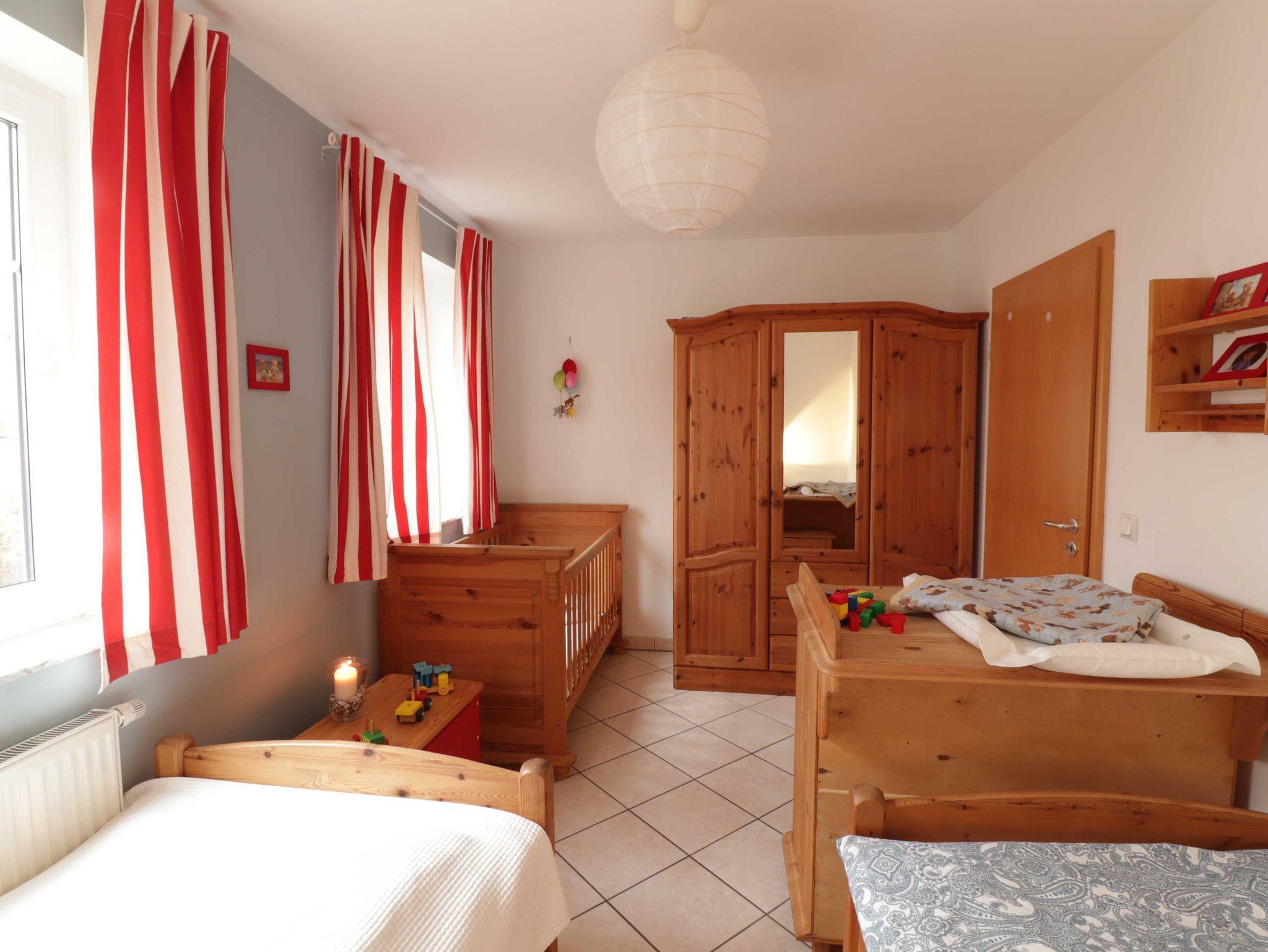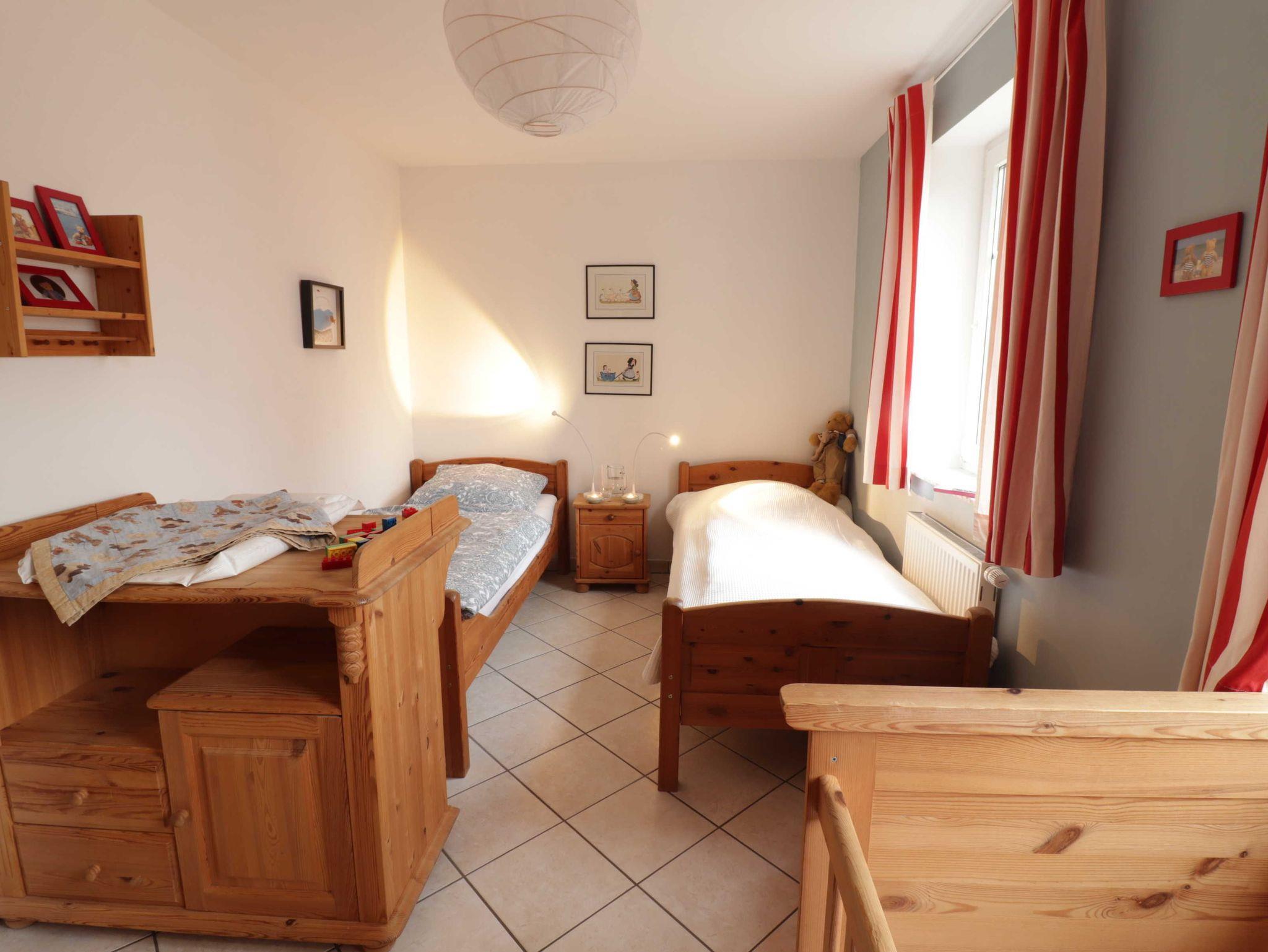 Im Kinderzimmer befinden sich zwei Einzelbetten (90 200 cm) und ein Kindergitterbett (70 x 140 cm). Dort steht auch ein großzügiger Kleiderschrank, eine Wickelkommode und eine Kindertruhe mit Spielzeug.