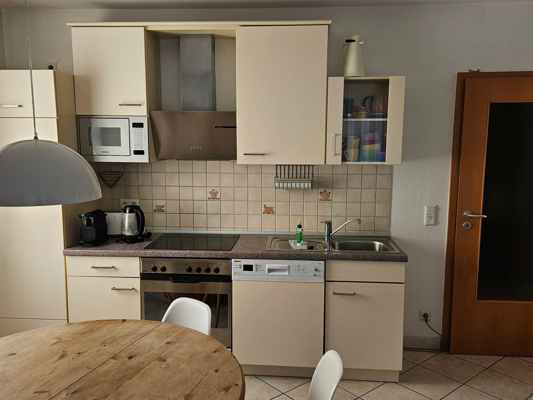 Die vollausgestattete Küchenzimmer im Wohnzimmer verfügt über einen Herd mit vier Kochfeldern und Backofen, Spülmaschine, Kühlschrank mit Gefriereinheit, Mikrowelle, Wasserkocher und Kaffeemaschine.