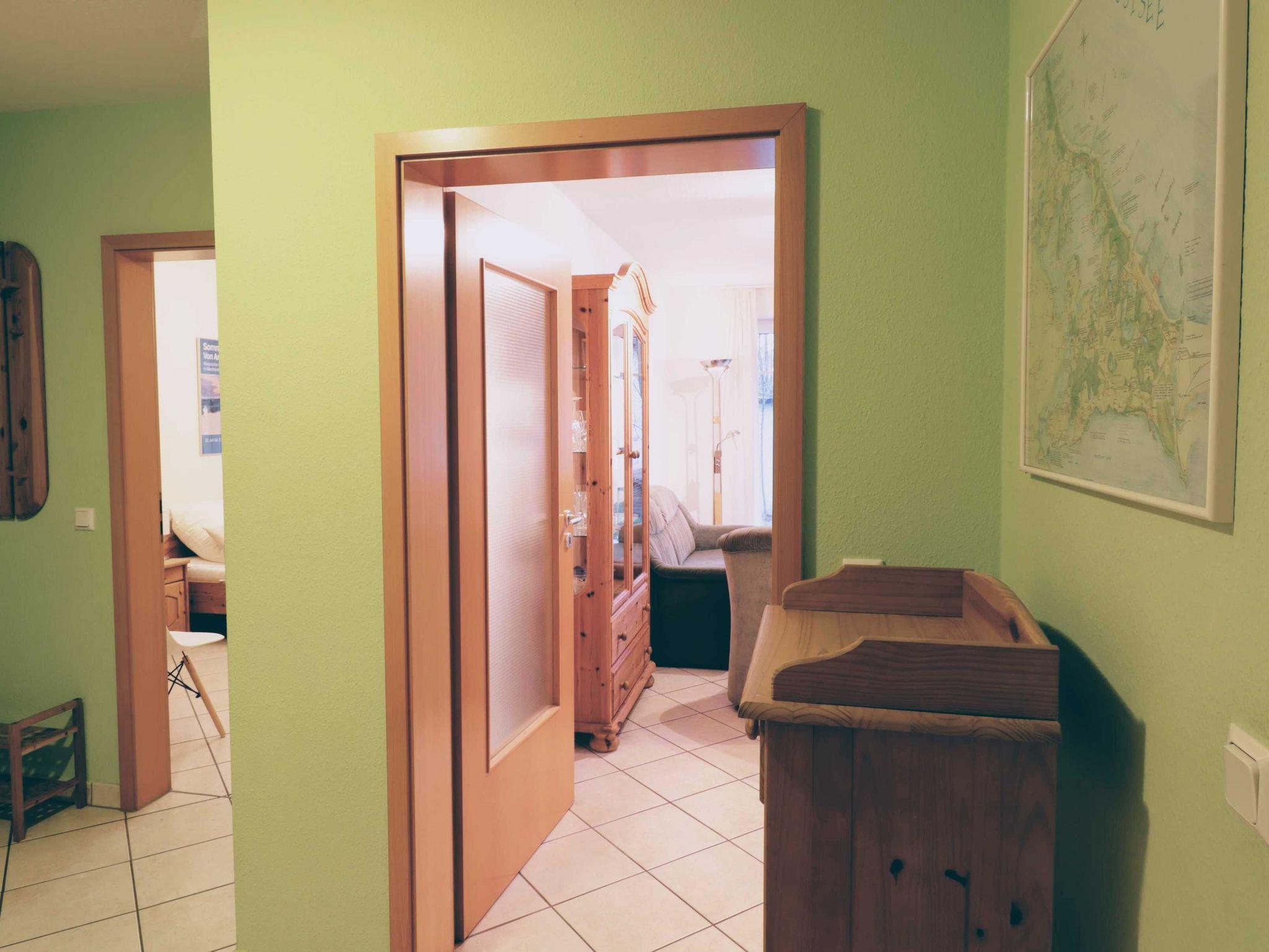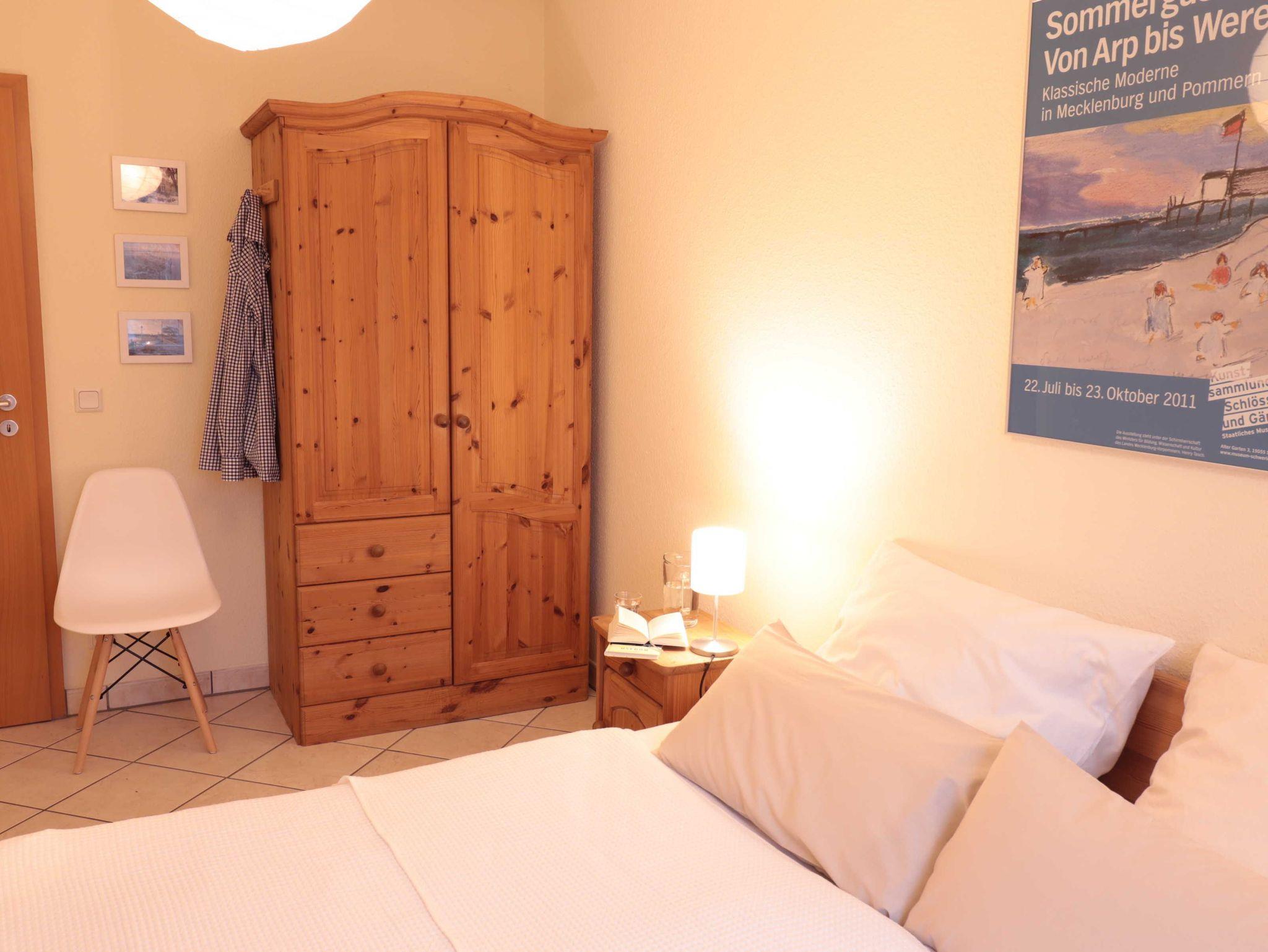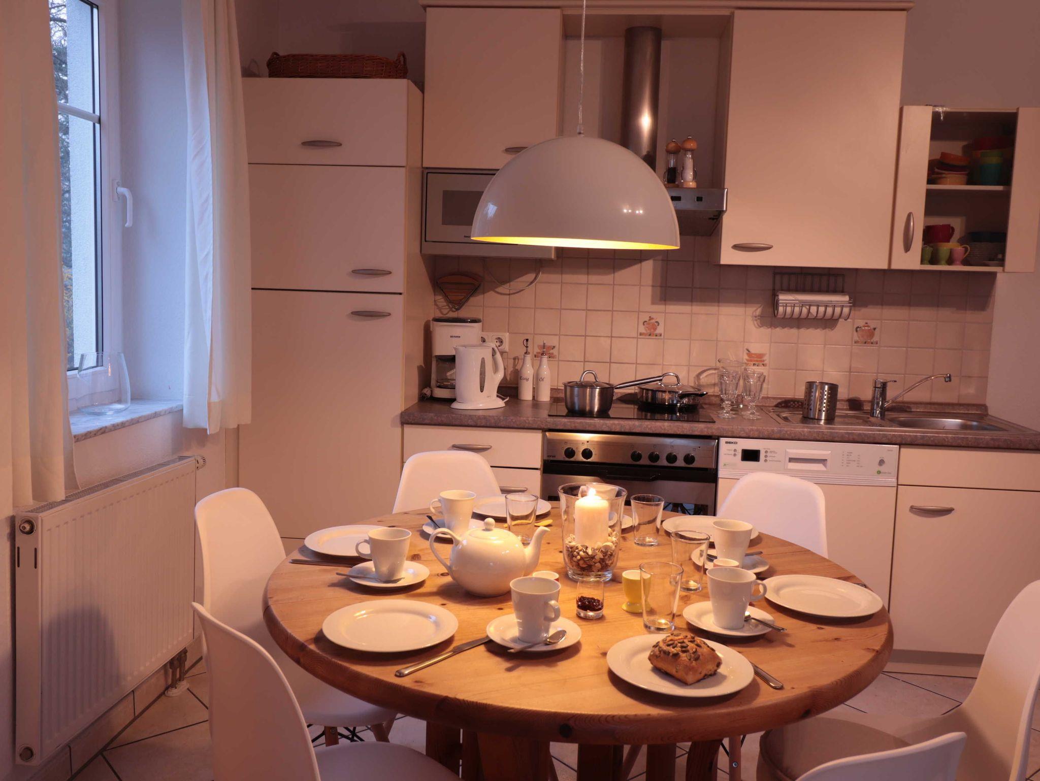 Im Wohnzimmer befindet sich eine Sitzgruppe, bestehend aus Sofa, das bei Bedarf zum Schlafsofa ausgeklappt werden kann und zwei bequemen, rollbaren Sesseln. Der aus Massivholz gearbeitete Esstisch kann erweitert werden, so dass dort bis zu acht Personen Platz finden. In einer Ecke des Wohnzimmersstehen ein Fernseher mit Kabelanschluss, CD/ DVD- Spieler sowie ein Internet/ DAB+ Radio. Die Wohnung ist mit einem eigenen WLAN-Netz versorgt, das Gästen der Wohnung kostenlos zur Verfügung steht. In dem großen Sideboard befinden sich eine Reihe ausgewählter Gesellschaftsspiel und weitere nützliche Utensilien. Alle Möbel sind aus Massivholz und vermitteln eine warme, behagliche Atmosphäre.