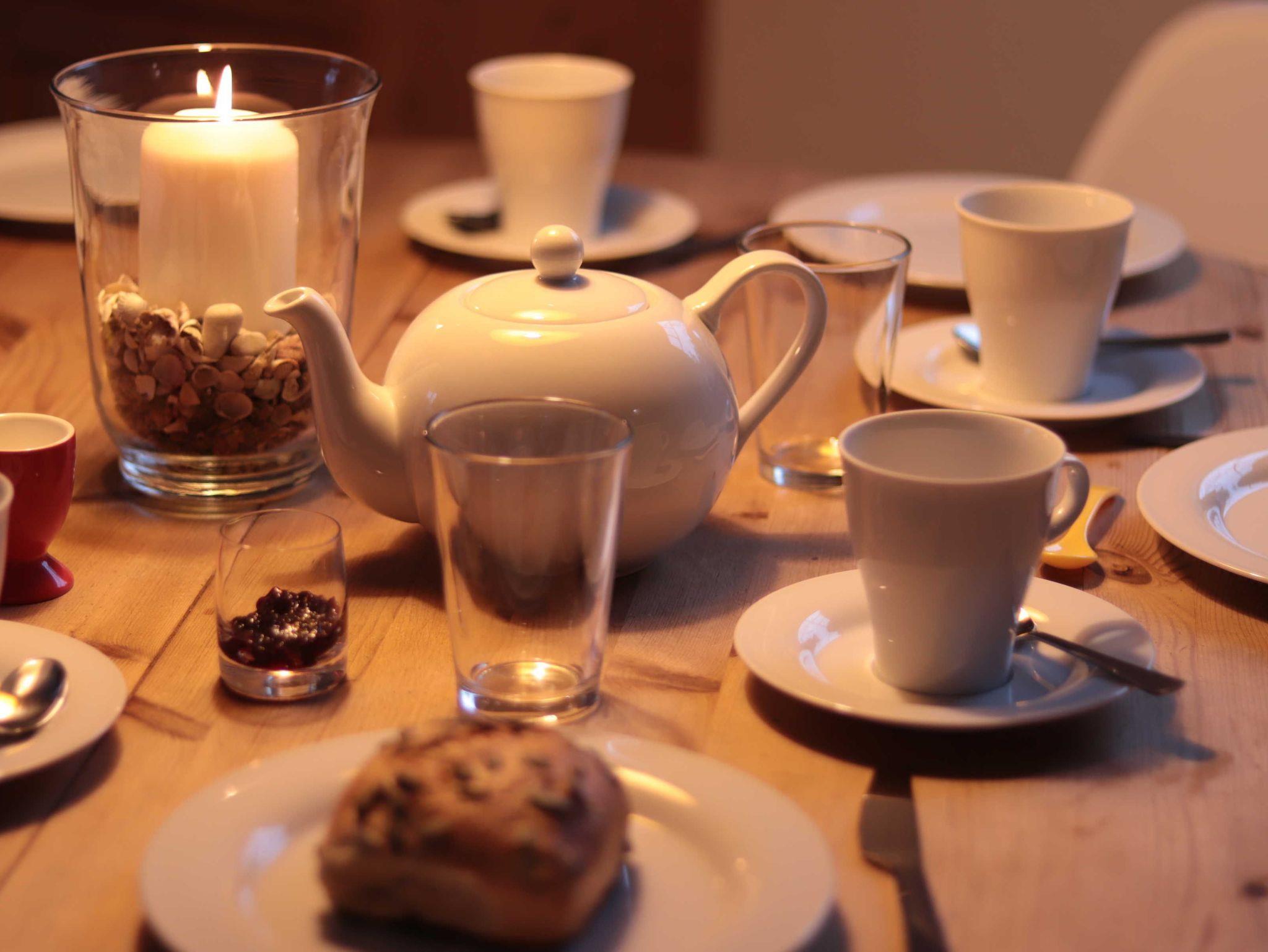 Im Wohnzimmer befindet sich eine Sitzgruppe, bestehend aus Sofa, das bei Bedarf zum Schlafsofa ausgeklappt werden kann, einem großzügigen, bequemen Sessel und einem kleinen Schaukelstuhl mit Kunststoffsitzschale. Der aus Massivholz gearbeitete Esstisch kann erweitert werden, so dass dort bis zu acht Personen Platz finden. Dazu gehören moderne, leichte Esszimmerstühle mit Holzbeinen und Kunststoffsitzschale. In einer Ecke des Wohnzimmersstehen ein Fernseher mit Kabelanschluss, CD/ DVD- Spieler sowie ein Internet/ DAB+ Radio. Die Wohnung ist mit einem eigenen WLAN-Netz versorgt, das Gästen der Wohnung kostenlos zur Verfügung steht. In dem großen Sideboard befinden sich eine Reihe ausgewählter Gesellschaftsspiel und weitere nützliche Utensilien. Alle Möbel sind aus Massivholz und vermitteln eine warme, behagliche Atmosphäre.