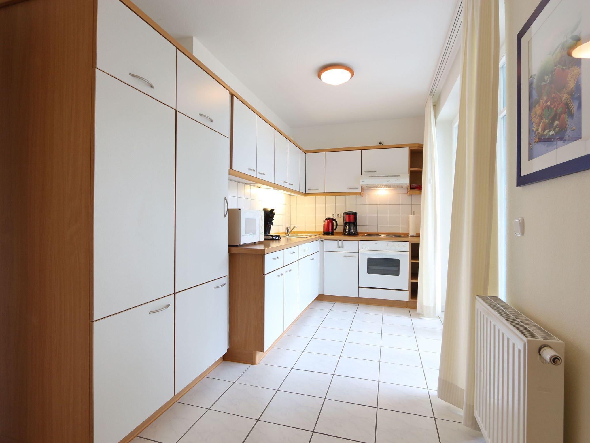 • Die komplett eingerichtete Einbauküche ist mit allem notwendigem für einen Urlaub ausgestattet. Dazu gehört ein Herd mit Backofen, ein Kühlschrank mit Eisfach, einer Mikrowelle, einer Kaffeemaschine, einem Wasserkocher, einem Toaster und ausreichend Geschirr etc..