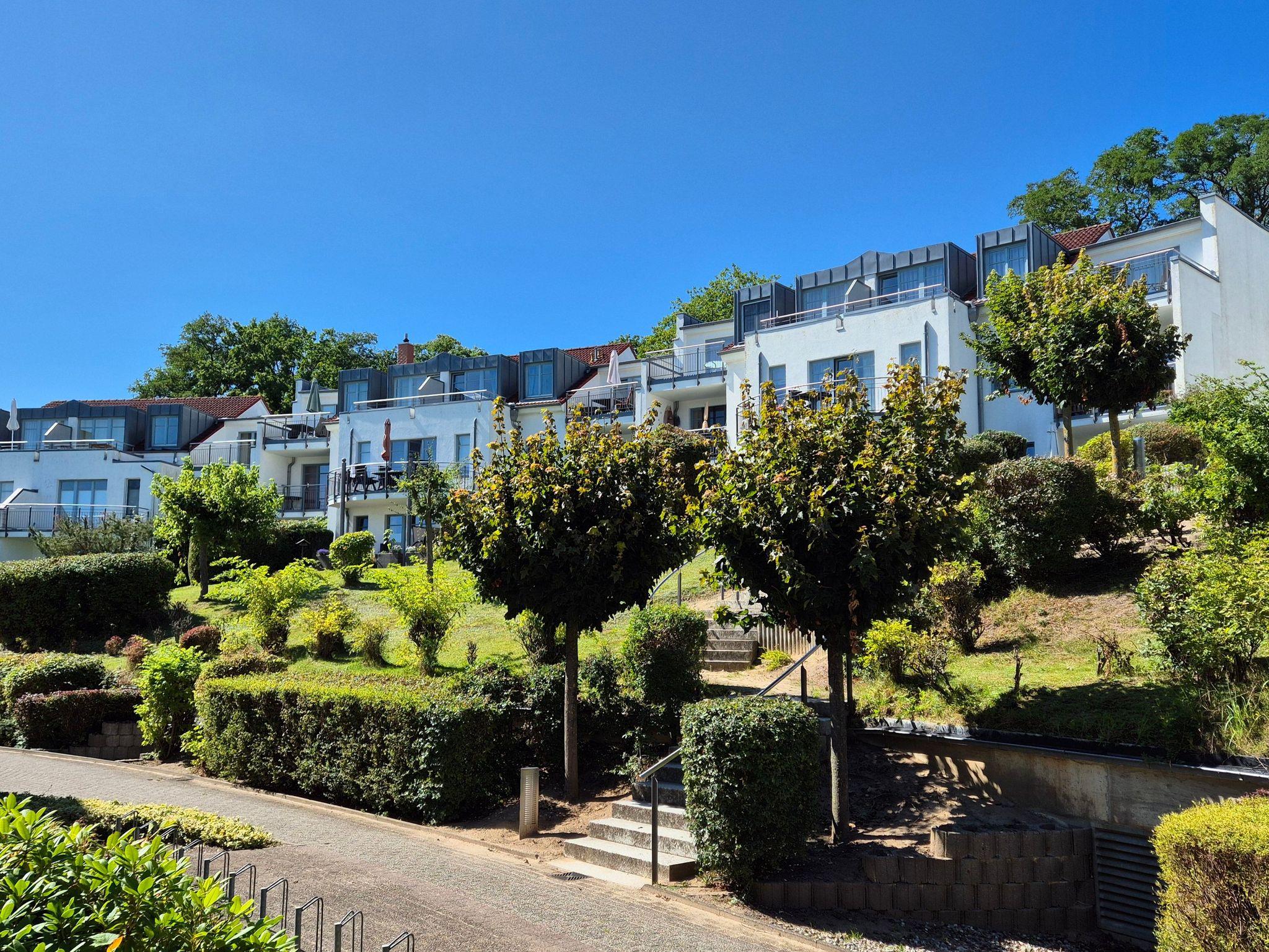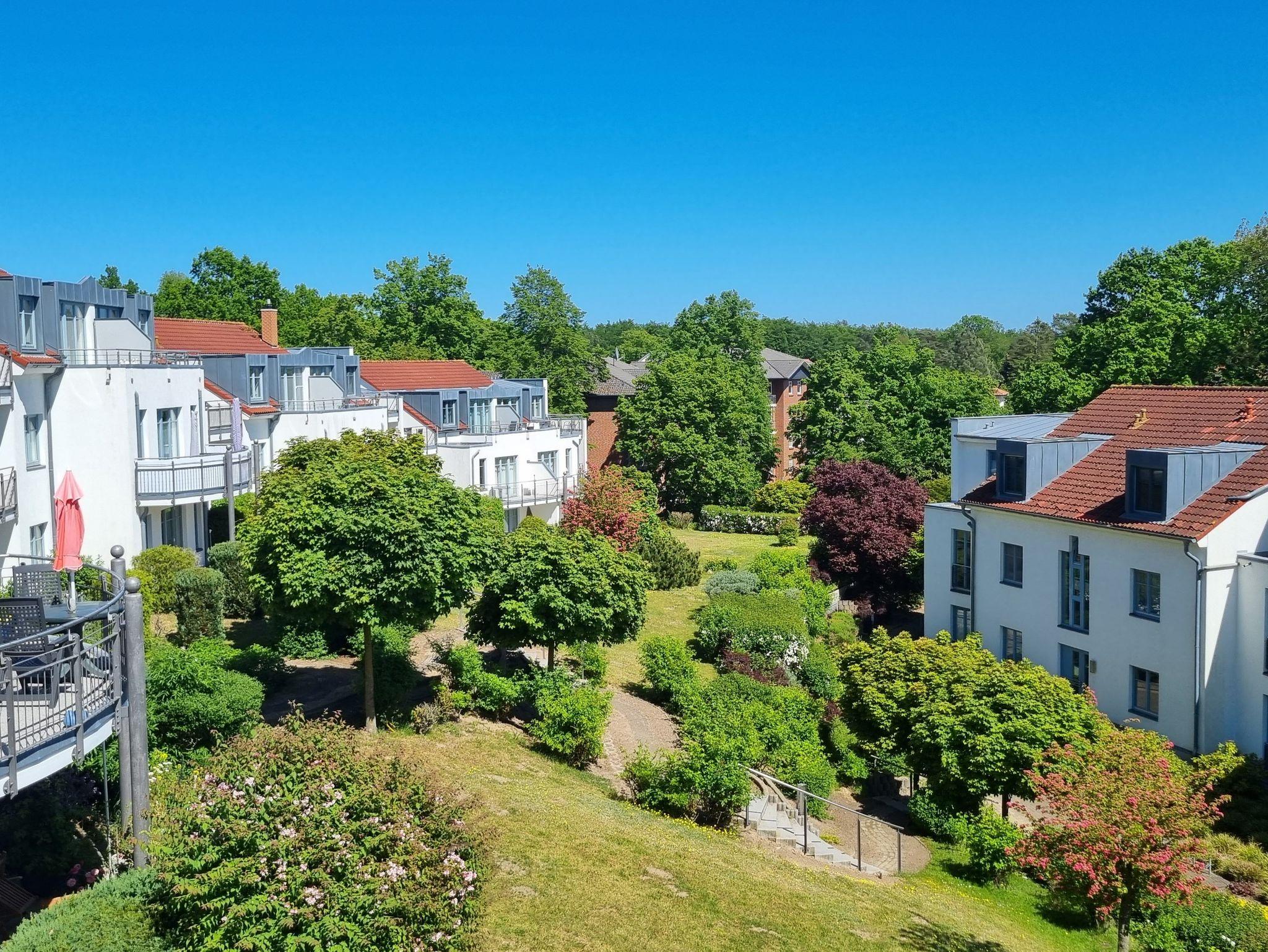 Die Ferienwohnung Nr. 2 mit Terrassen an der Küche und am Wohnzimmer befindet sich im Erdgeschoss in der Residenz Bellevue in 17454 Zinnowitz, Heimweg 7 und bietet einen Blick auf das Umfeld und die Landschaft.