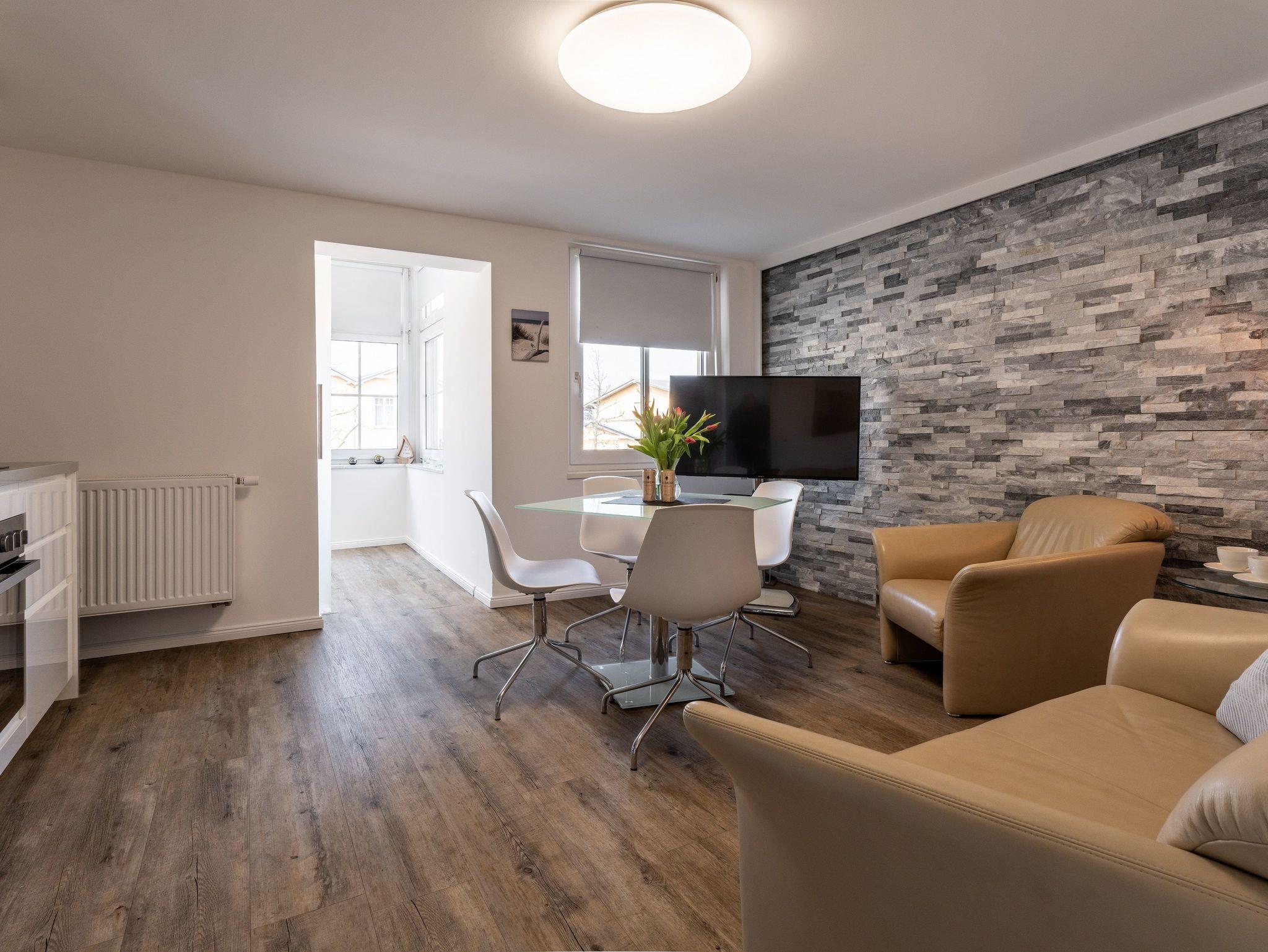 Wie wäre es mit der idealen Kombination aus moderner, stilvoller Einrichtung und gemütlicher Atmosphäre? Kommen Sie zu uns in die Ferienwohnung Abendmond auf 36 qm im Obergeschoss der liebevoll sanierten Villa Helga. Ganz frisch saniert erwartet Sie das Wohnzimmer mit einer modernen Einbauküche mit einem Geschirrspüler, einer großen Kühl- und Gefrierkombination, Backofen mit Induktions-Kochfeld, Mikrowelle, Wasserkocher, Kaffeemaschine und Toaster.
