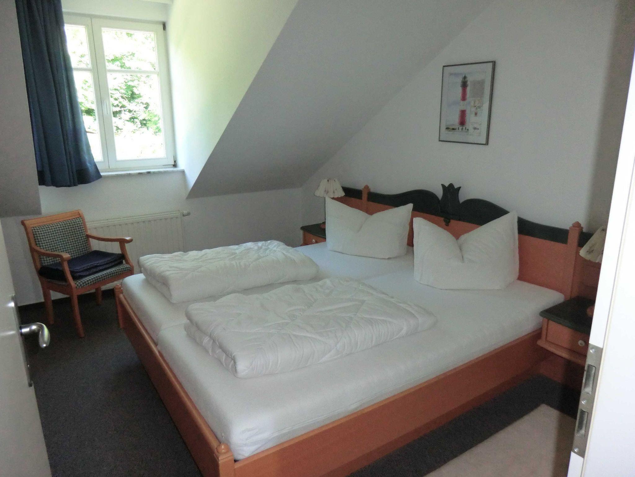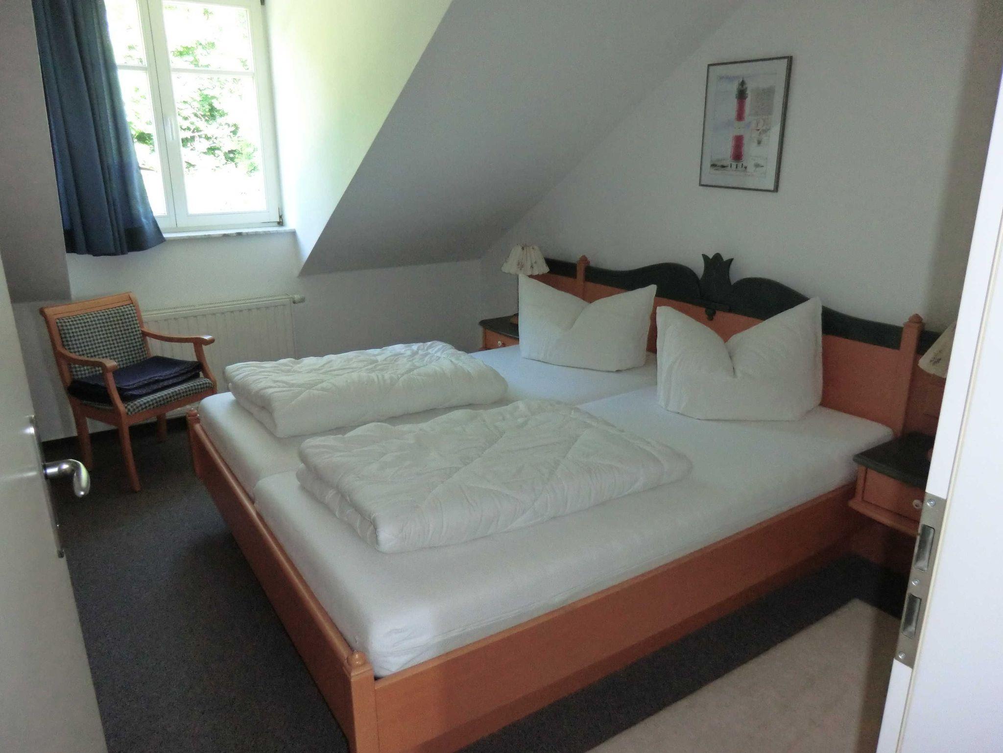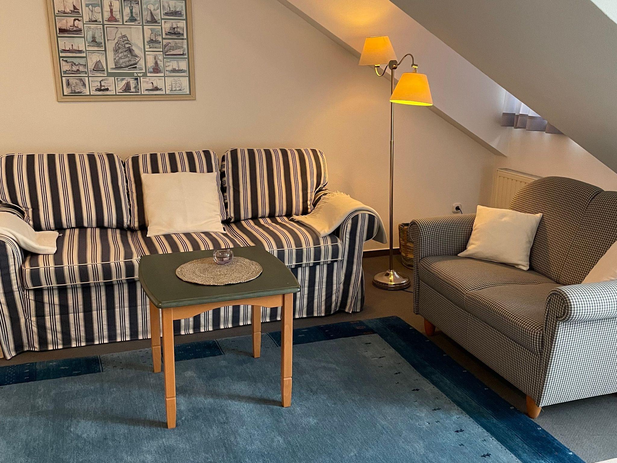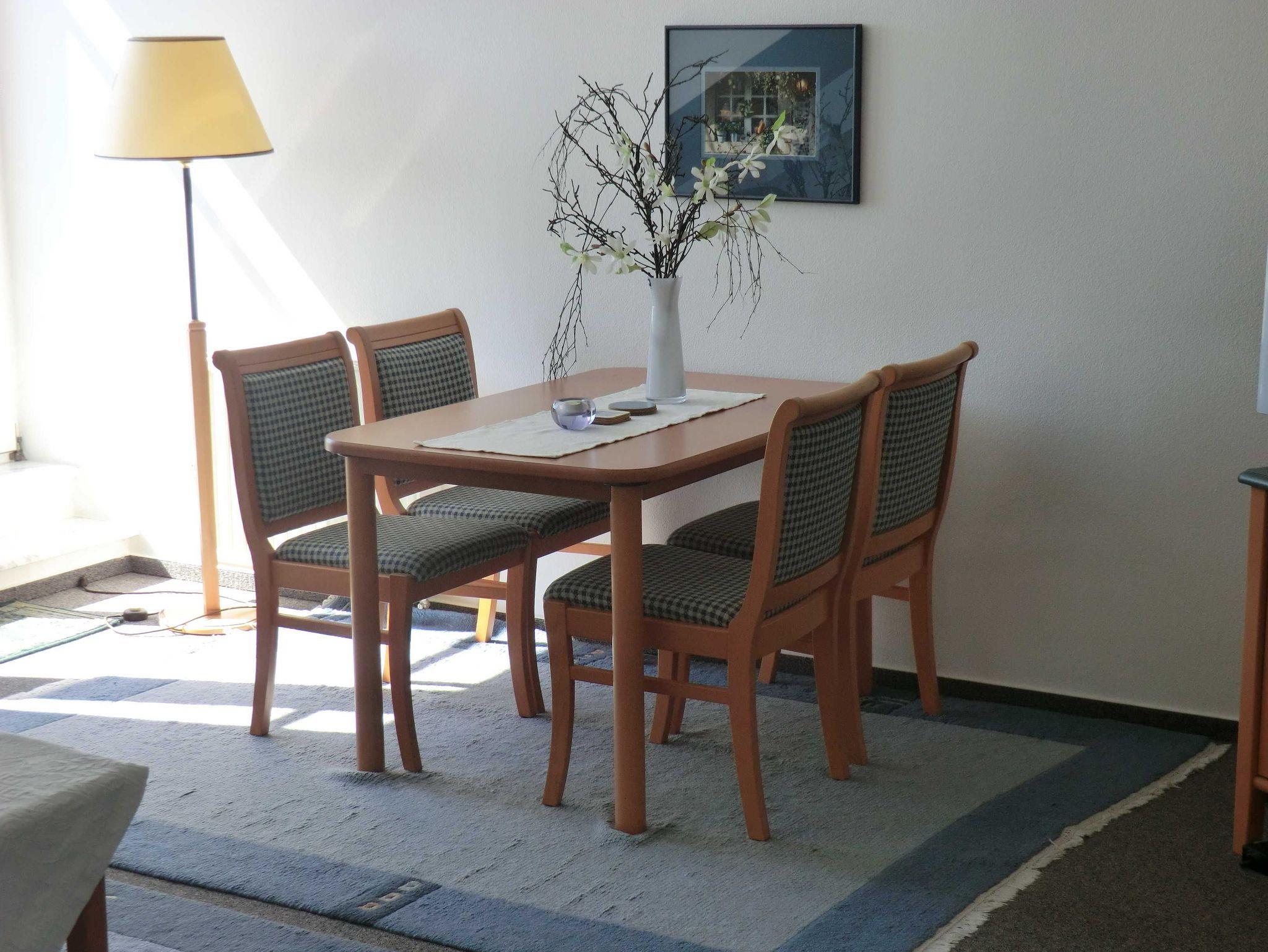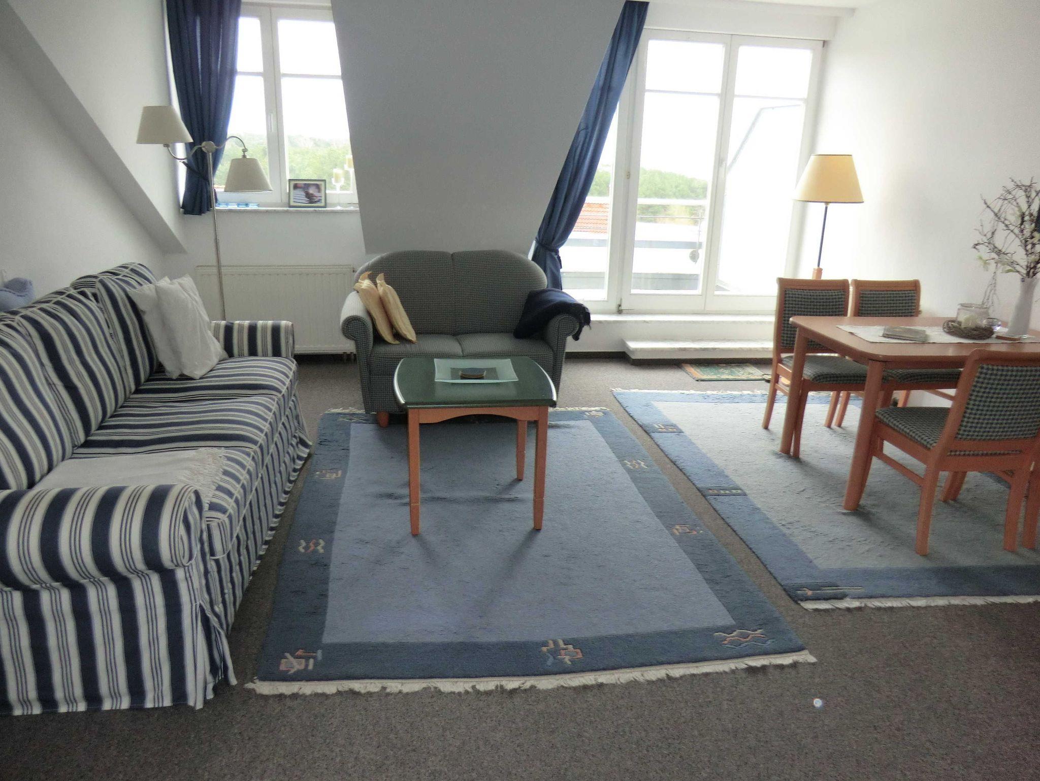 Die Dachgeschoss-Wohnung hat zwei Balkone die nach Süden ausgerichtet sind; mit 4 Terrassenstühlen, Tisch und Sonnenschirm. Die Wohnung ist hell und freundlich eingerichtet und verfügt über Sat-TV und Radio. Eine gut ausgestattete Küche mit Backofen, Mikrowelle, Geschirrspülmaschine vollständigem Geschirr, Küchengeräten, Kaffeemaschine, Wasserkocher und Toaster sind vorhanden. Schlafzimmer mit Doppelbett für 2 Personen; Wohnzimmer ein Schlafsofa für 2 Personen; Kinderbett kann gemietet werden.