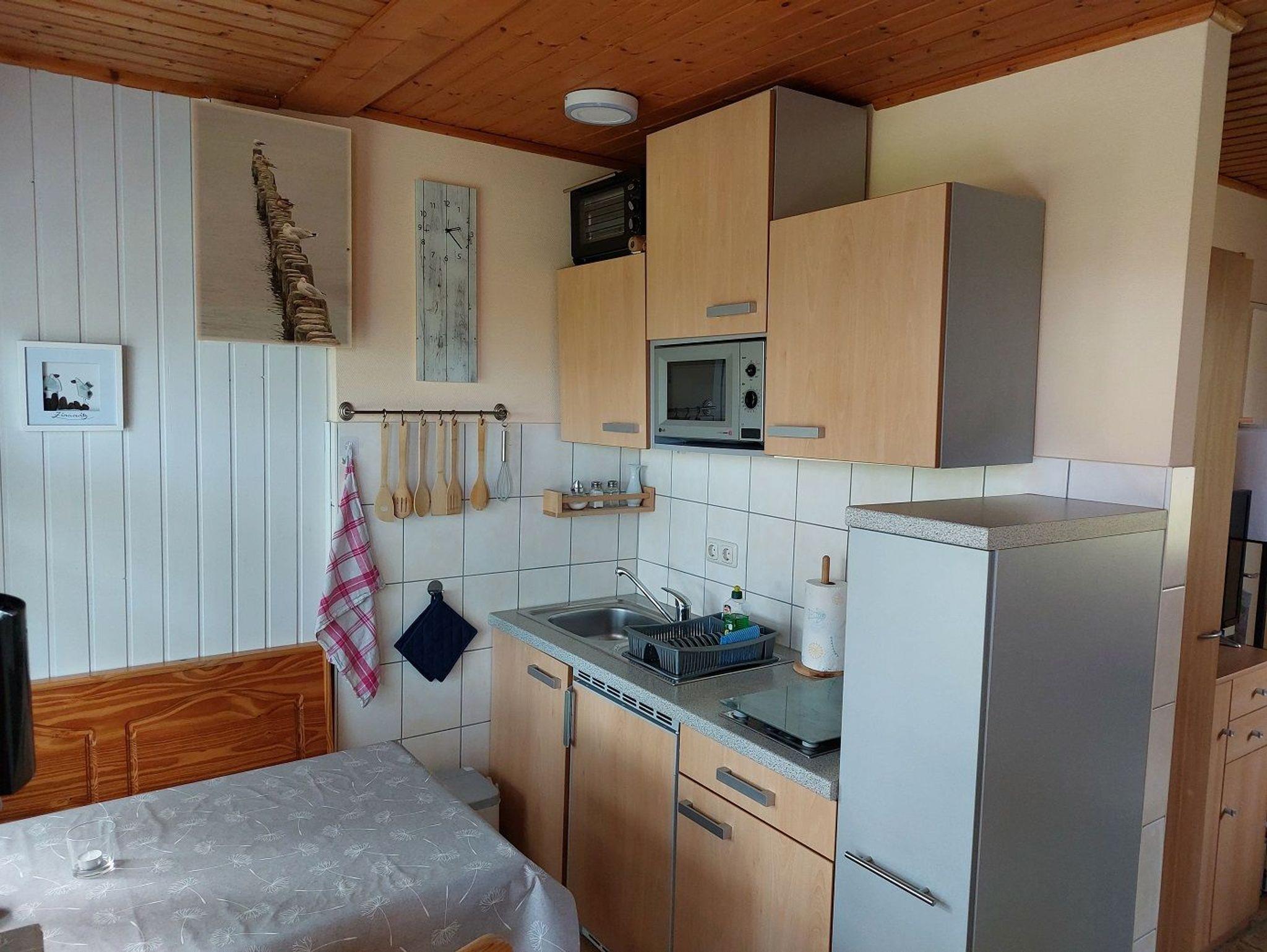 Geräumiger Bungalow mit 2 Schlafzimmern und einem Wohnraum mit Essecke und Küchenzeile. Auf der Terrasse stehen Ihnen Gartenmöbel & ein Strandkorb zum Relaxen zur Verfügung.