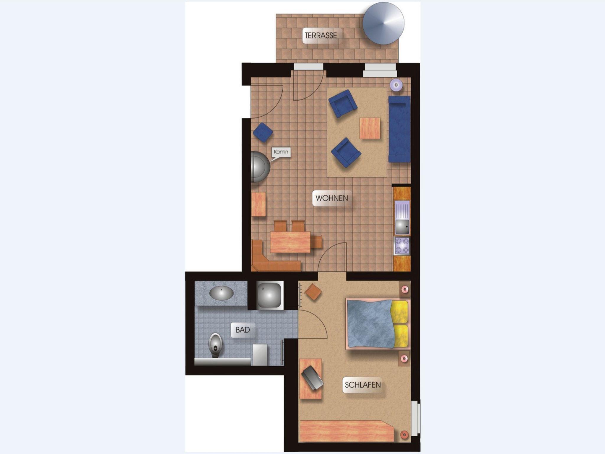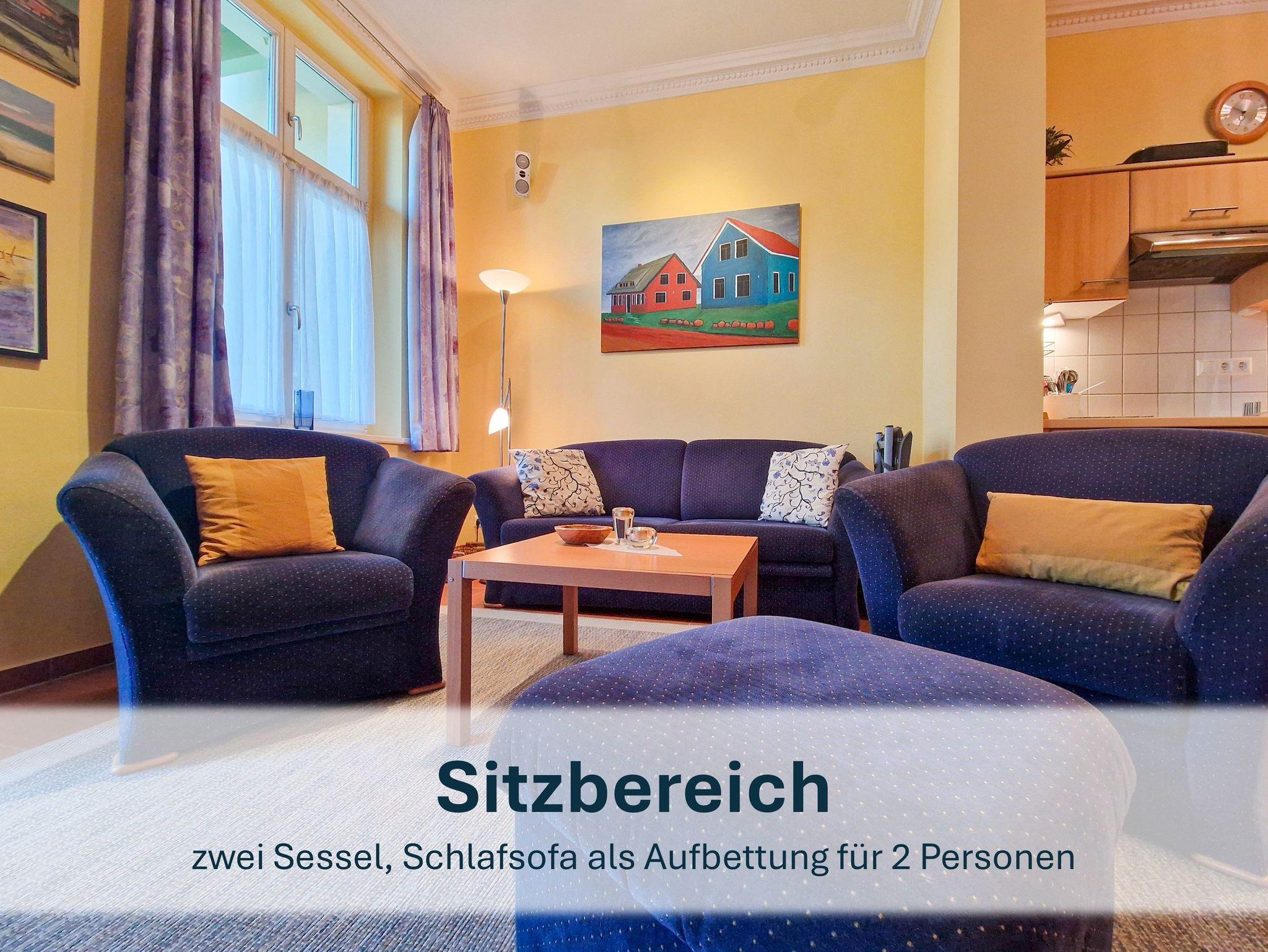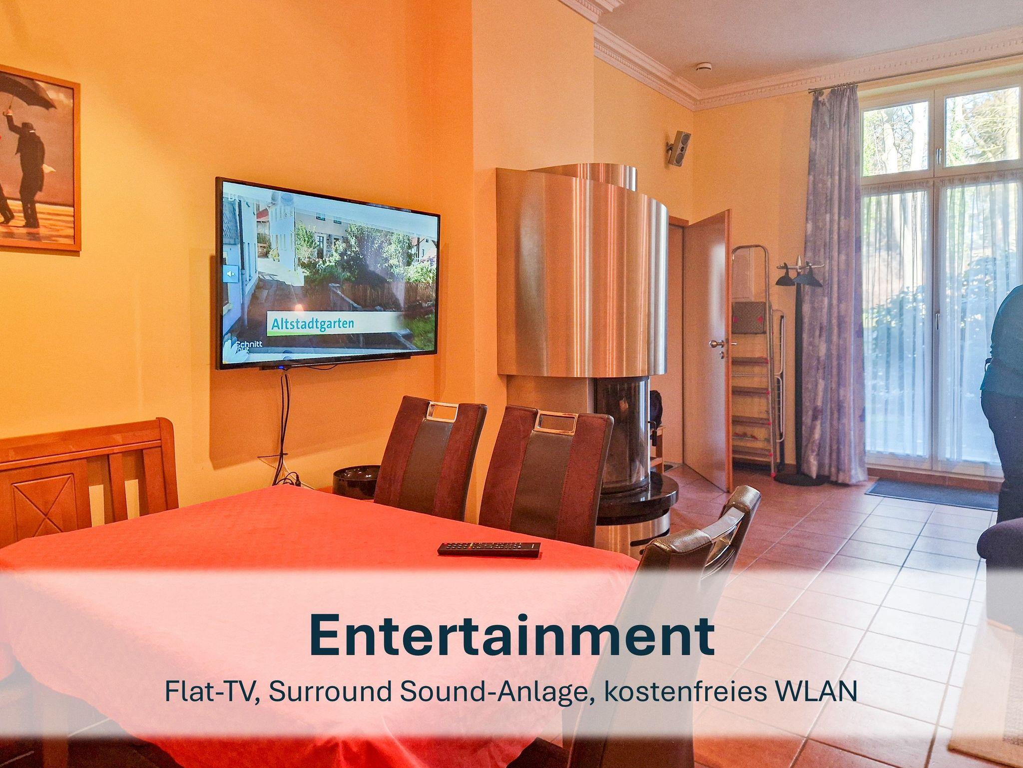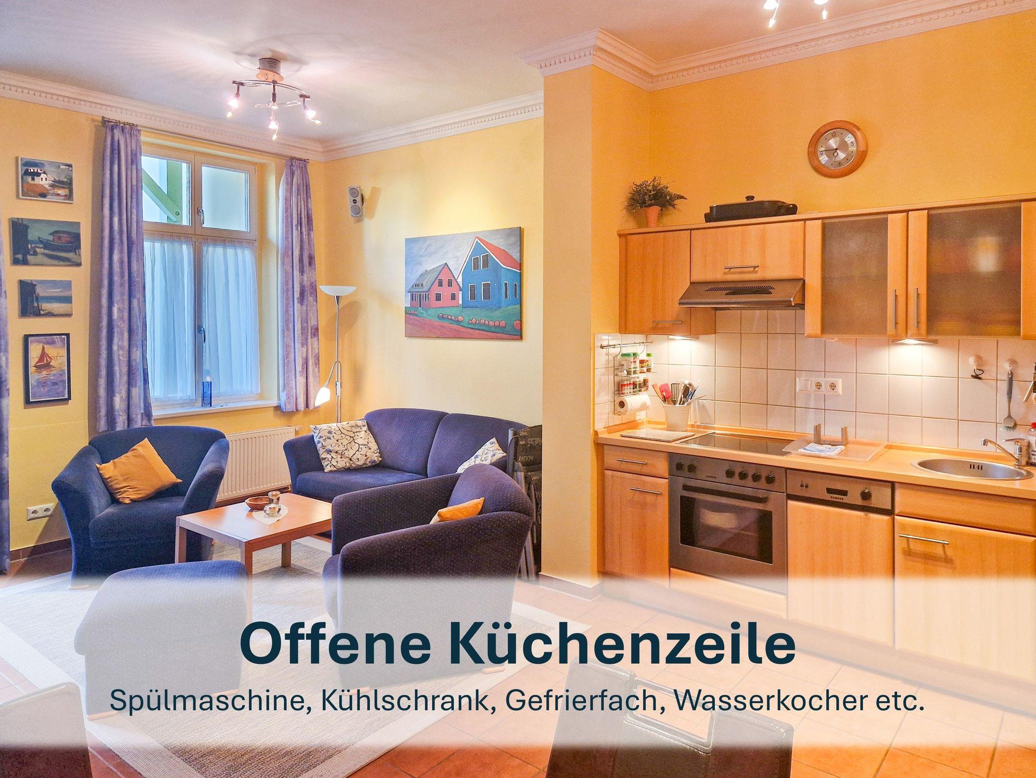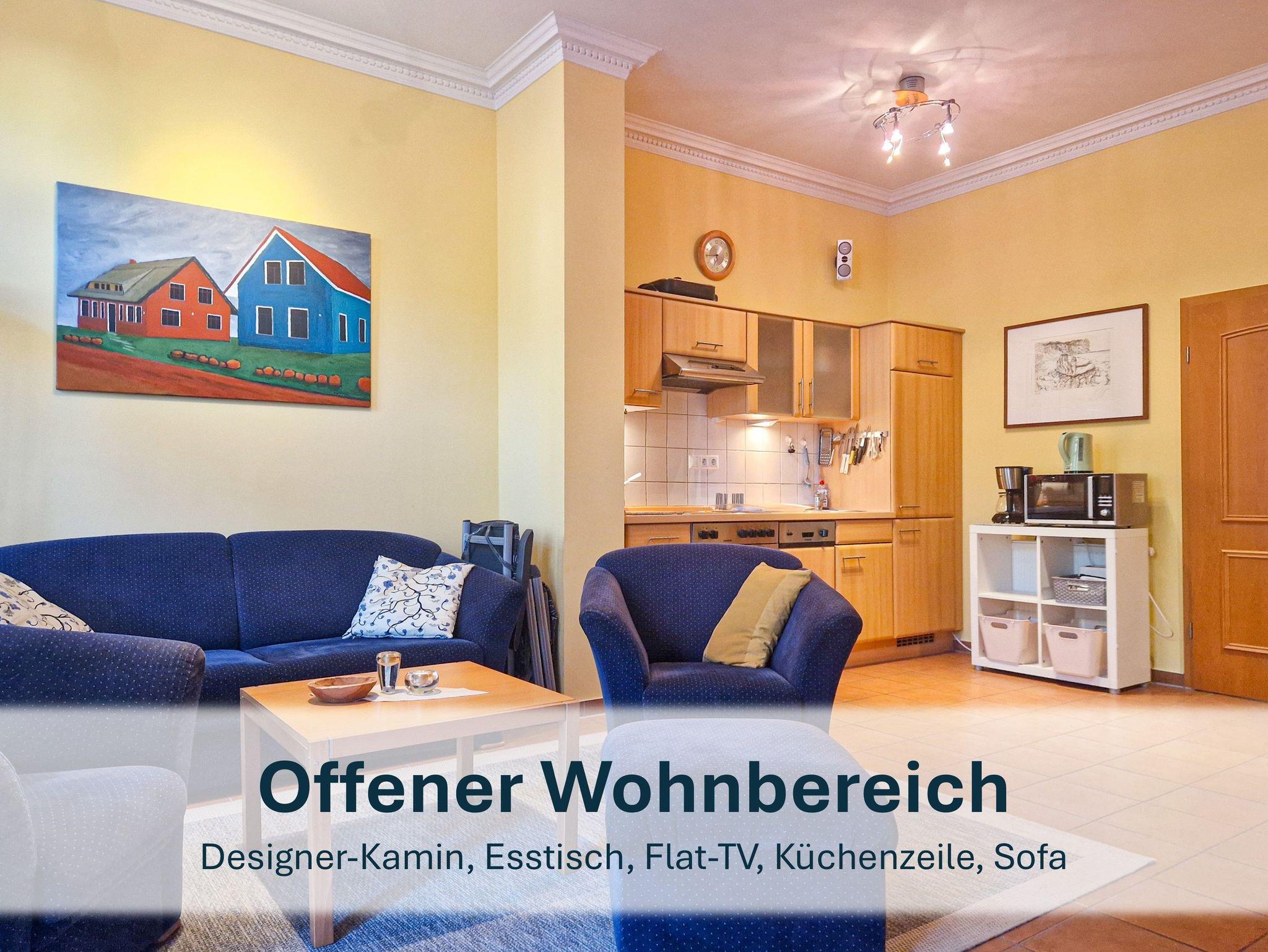 Die stilvolle Wohnung im Erdgeschoss bietet Ihnen auf großzügigen 65 m² höchsten Komfort. Das großzügige Wohn-/Esszimmer besticht durch eine bequeme Sitzecke mit Doppelbettschlafsofa für 2 Personen und einer Essecke. Der Designer-Kamin sorgt für eine gemütliche Atmosphäre, während die hochwertige Technik mit Surround-Anlage und großem Flachbildfernseher für echtes Kinofeeling sorgt.