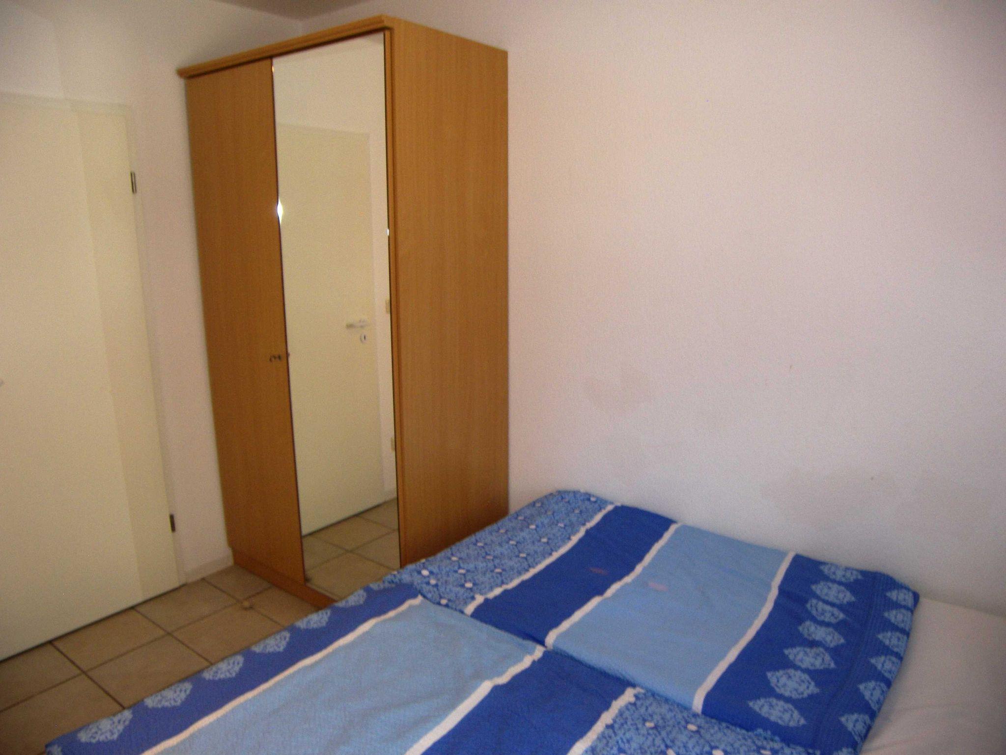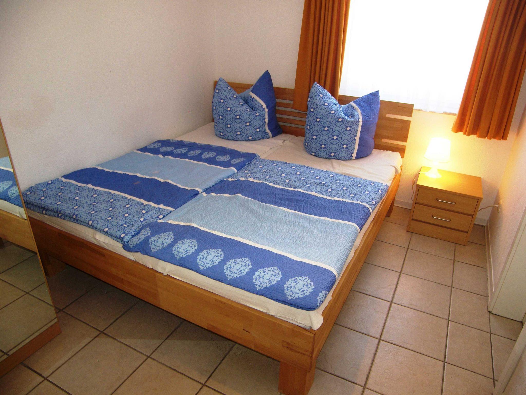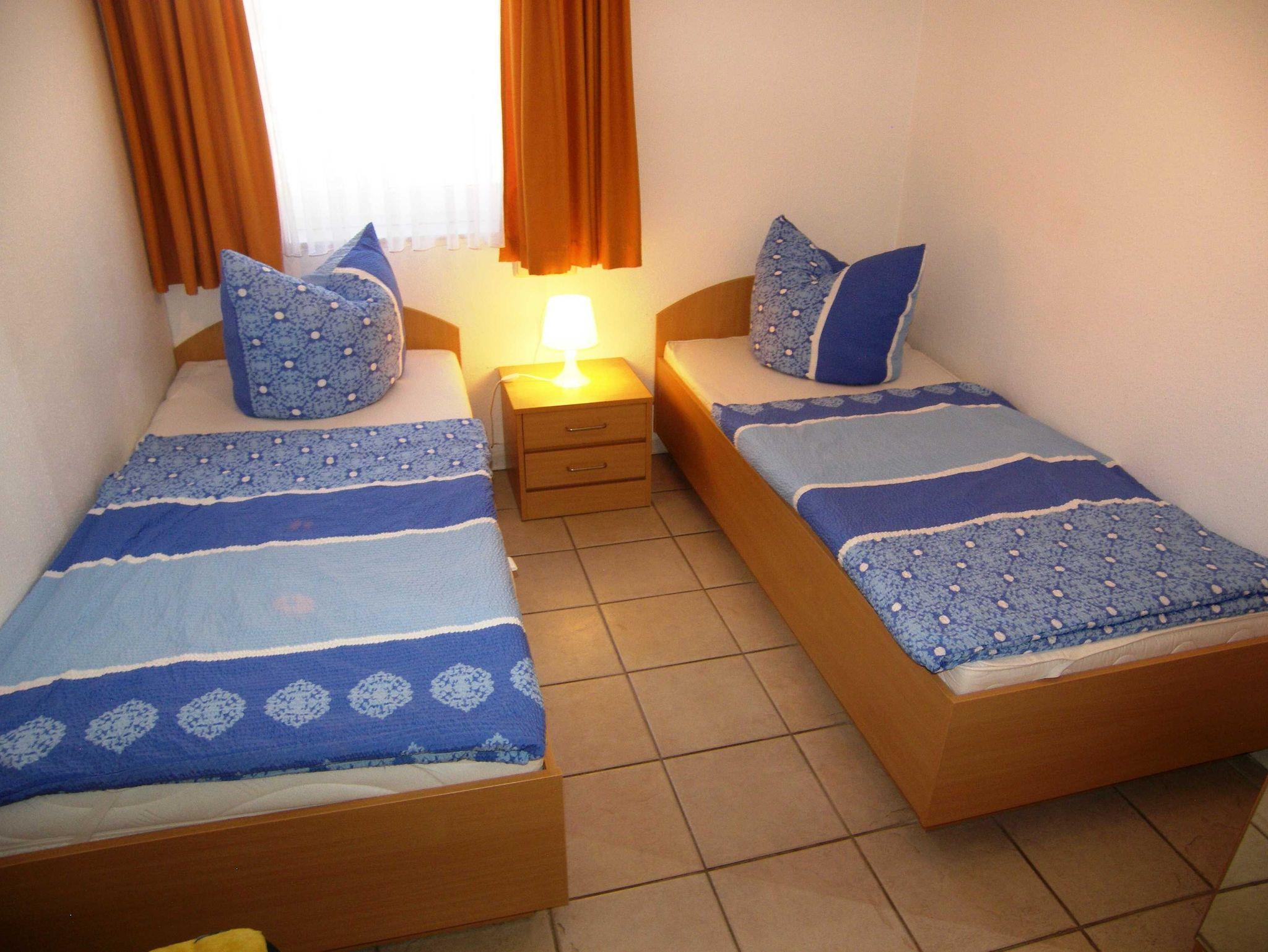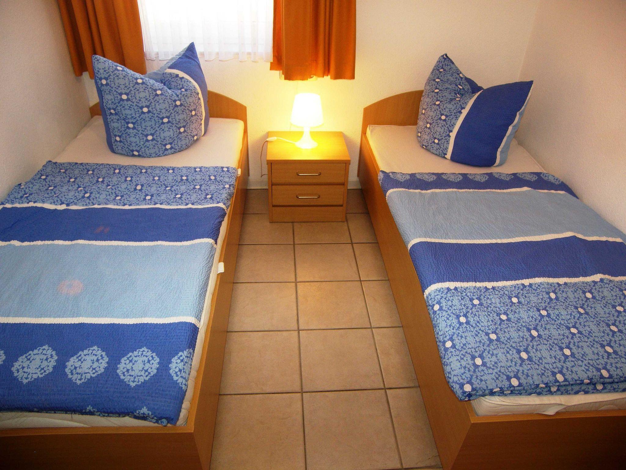 EIn Schlafzimmer ist mit einem Doppelbett, das zweite ist mit zwei Einzelbetten ausgestattet. Die Wohnung verfügt über zwei Badezimmer mit Dusche.
