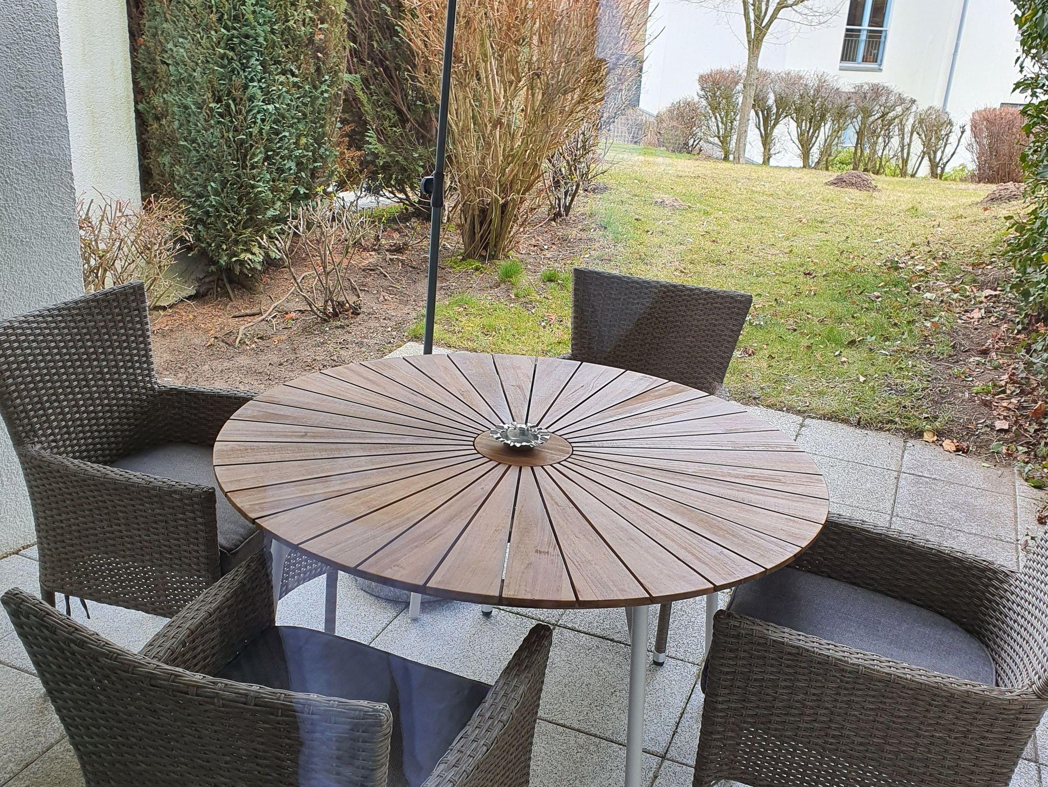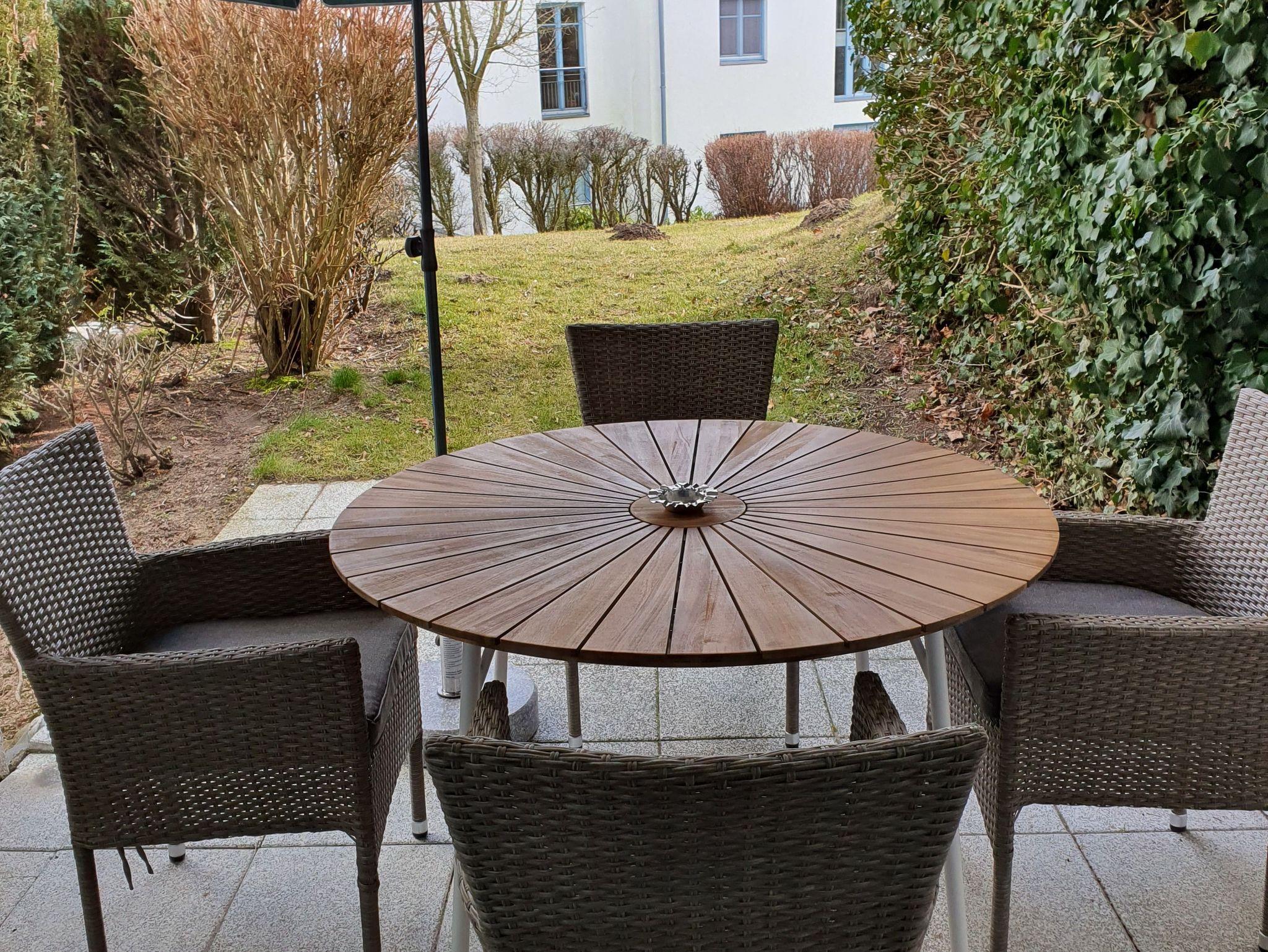 Die Parterre-Wohnung hat eine Terrasse die nach Süden ausgerichtet ist; mit 4 Terrassenstühlen, Tisch und Sonnenschirm.