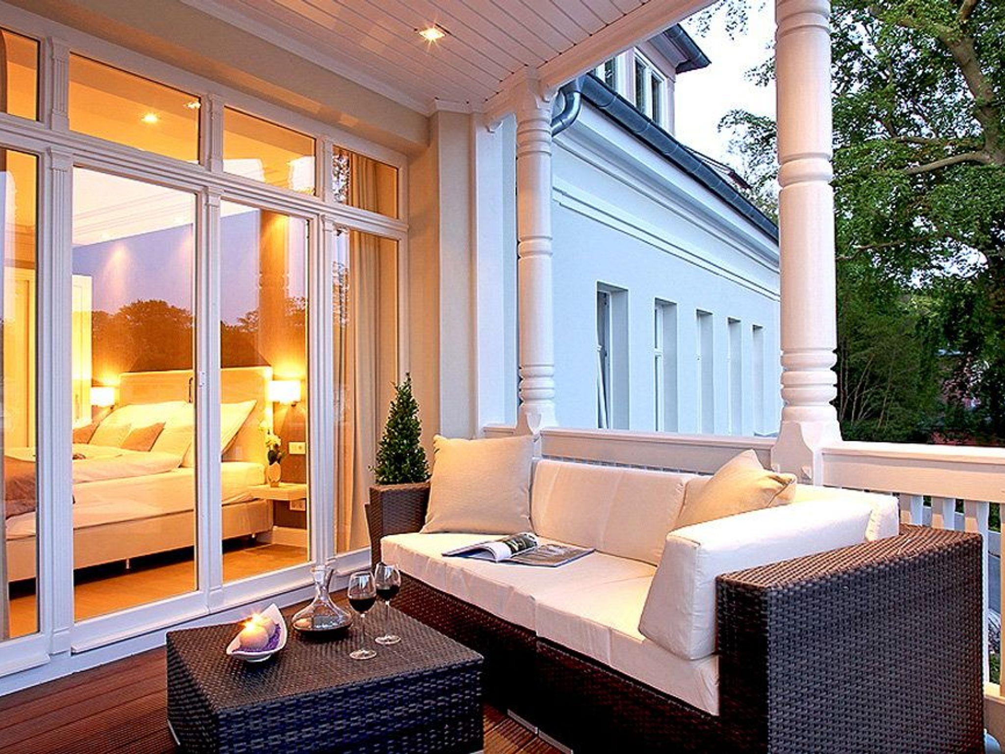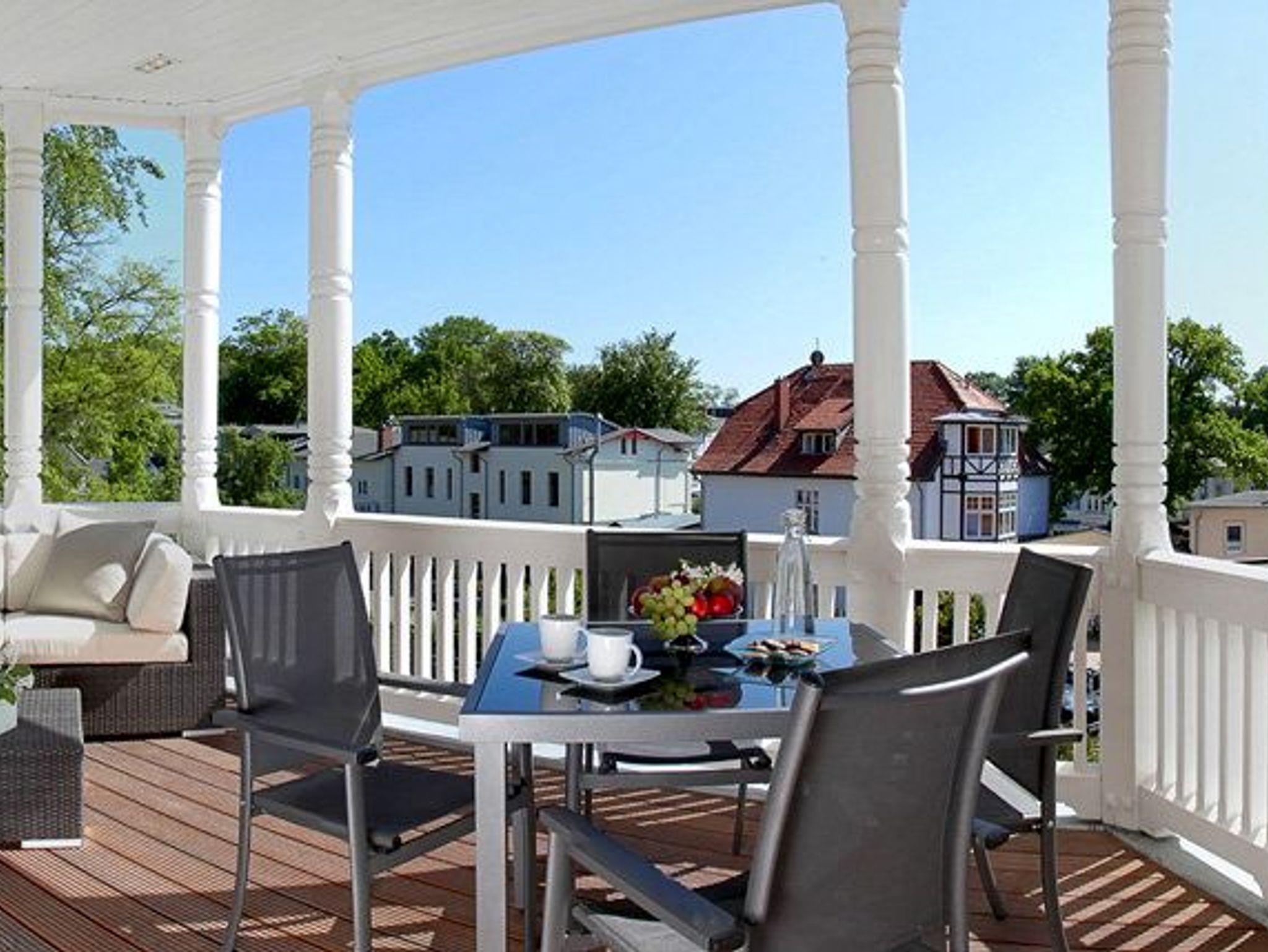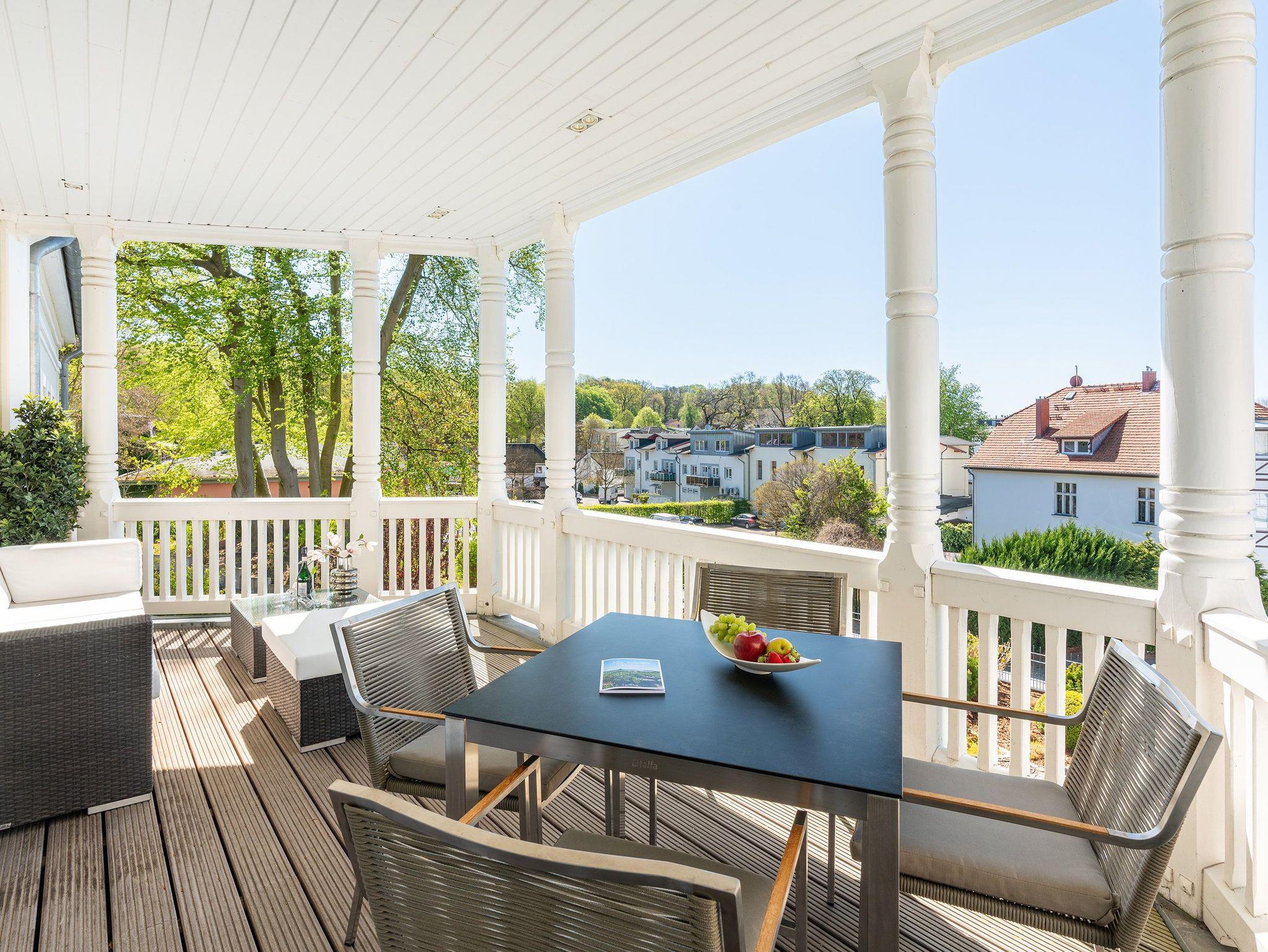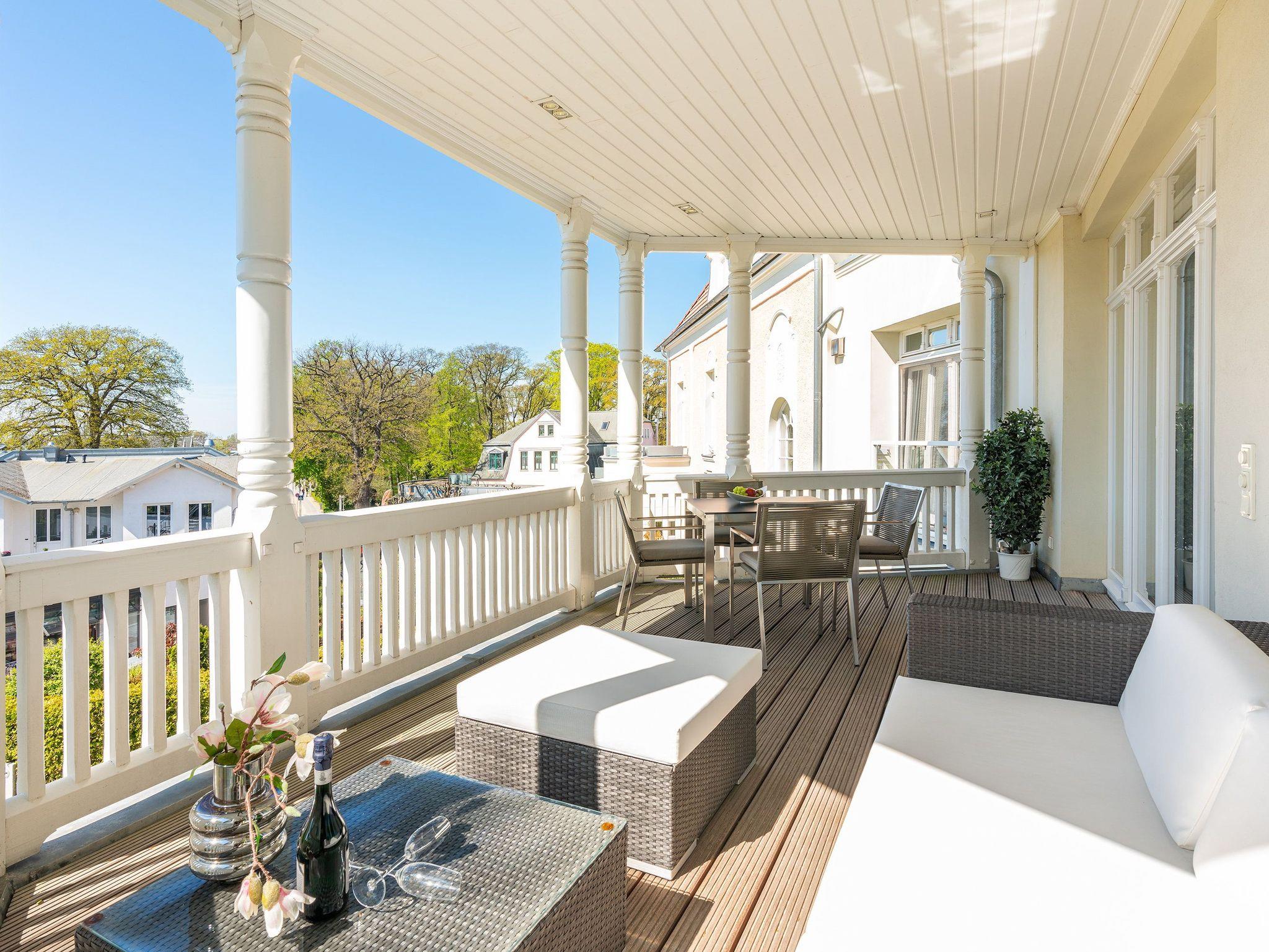 Vom Wohn- und Schlafbereich gelangen Sie auf den großzügigen Balkon, der wegen seiner historischen Holzsäulen und seiner enormen Größe in diesem Objekt einzigartig ist. Durch seine Südausrichtung werden Sie fast den ganzen Tag mit Sonne beschenkt, ein grandioser Blick über Zinnowitz inklusive. Damit Sie auf Ihrem Balkon auch längere Zeit verweilen können, ist er mit einer gemütlichen Loungeecke (Rattan Sofa) ausgestattet. Zudem steht ein Esstisch für gemeinsame Mahlzeiten an der frischen Ostseeluft bereit.