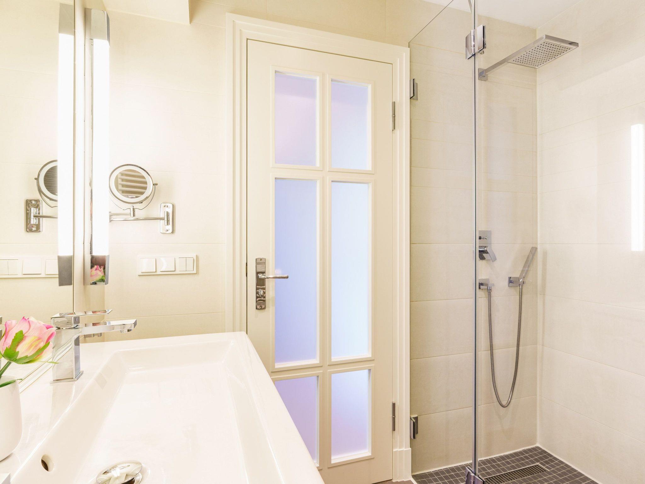 Ein luxuriöses Badezimmer rundet mit einem großen und modernen Waschtisch und bodengleicher Echtglasdusche, WC und Haartrockner das perfekte Urlaubsdomizil ab.