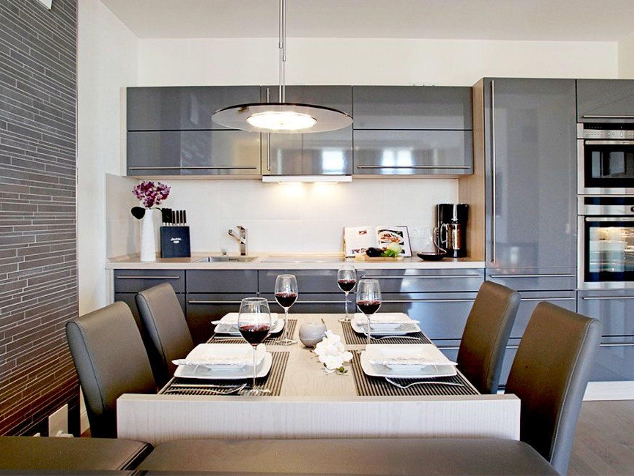 Wenn Sie das Wohnzimmer betreten, werden Sie bereits vom großzügigen Ecksofa zum Verweilen eingeladen. Dabei können Sie sich und Ihren Liebsten mit dem Gaskamin ein romantisches Flair zaubern oder ganz einfach vom Fernsehprogramm unterhalten lassen.