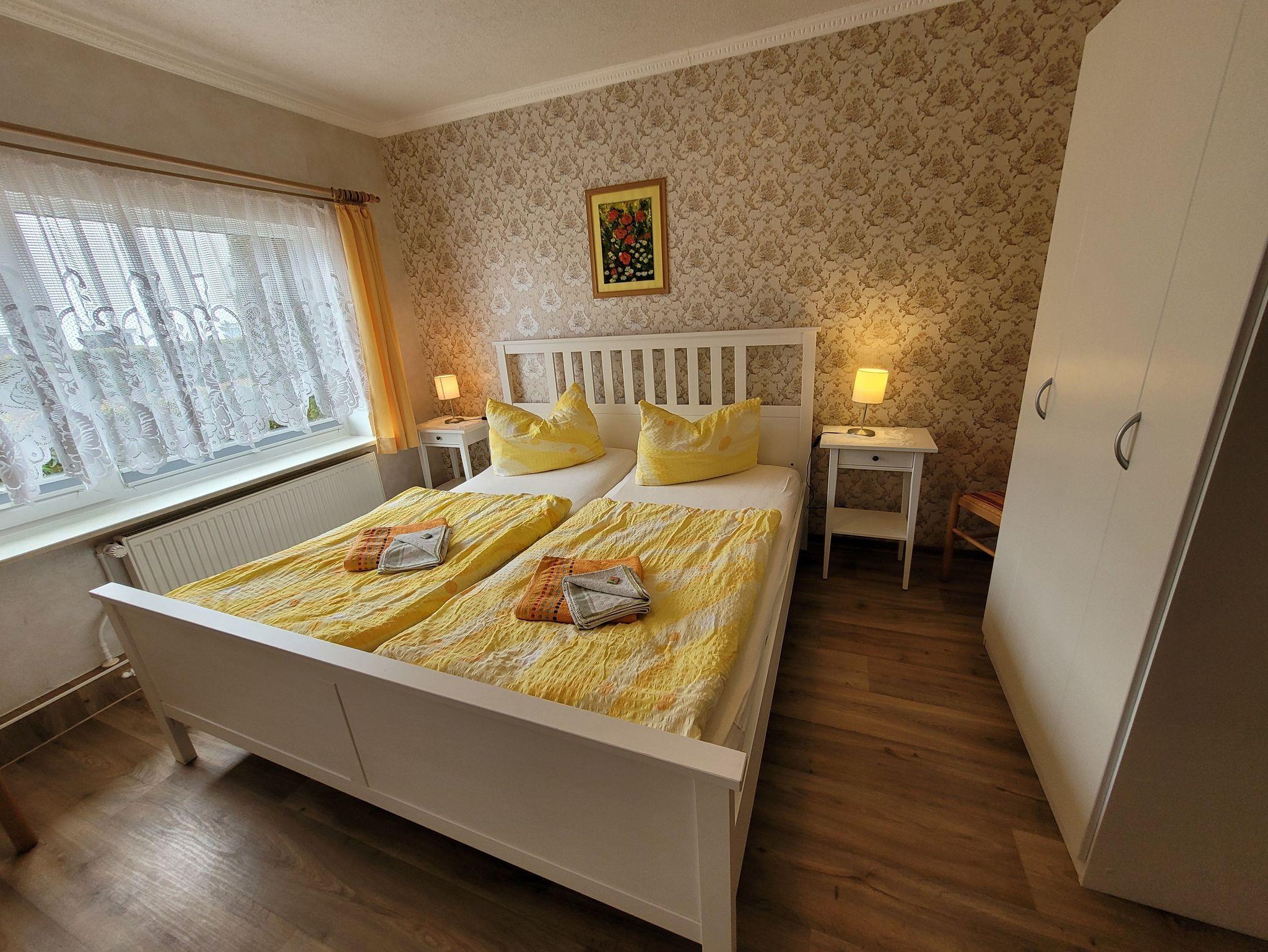 Unsere Ferienwohnungen liegen ca.15 Geh-Minuten vom Strand entfernt in einer ruhigen Wohnlage. Die komplett eingerichtete Ferienwohnung mit Wohnzimmer, zwei Schlafzimmern mit einem Doppelbett und einmal zwei Liegen, Küchenzeile, Dusche, WC, Flur und großer Terrasse neben der Wohnung würde für Sie bereitstehen.Zur Ausstattung gehören weiter Radio, Fernseher, einmalig Bettwäsche und Handtücher. In der Küchenzeile sind Mikrowelle, Kaffeemaschine und Toaster, Eier-und Wasserkocher sowie ein Herd, Kühlschrank und Geschirr vorhanden. Eine Aufbettung ist im Wohnzimmer nach Absprache auf dem ausziehbarem Sofa möglich. Zu jeder Wohnung gehört ein kostenloser Parkplatz für Ihr Auto. Auf unserem Gelände steht Ihnen ein Kinderspielplatz, ein Grillplatz, im Sommer ein kleines Kinderspielzimmer und ein Clubraum zum Tischtennis und Billard spielen zur Verfügung. Die Waschmaschinen- und Trocknerbenutzung ist nach vorheriger Absprache möglich.