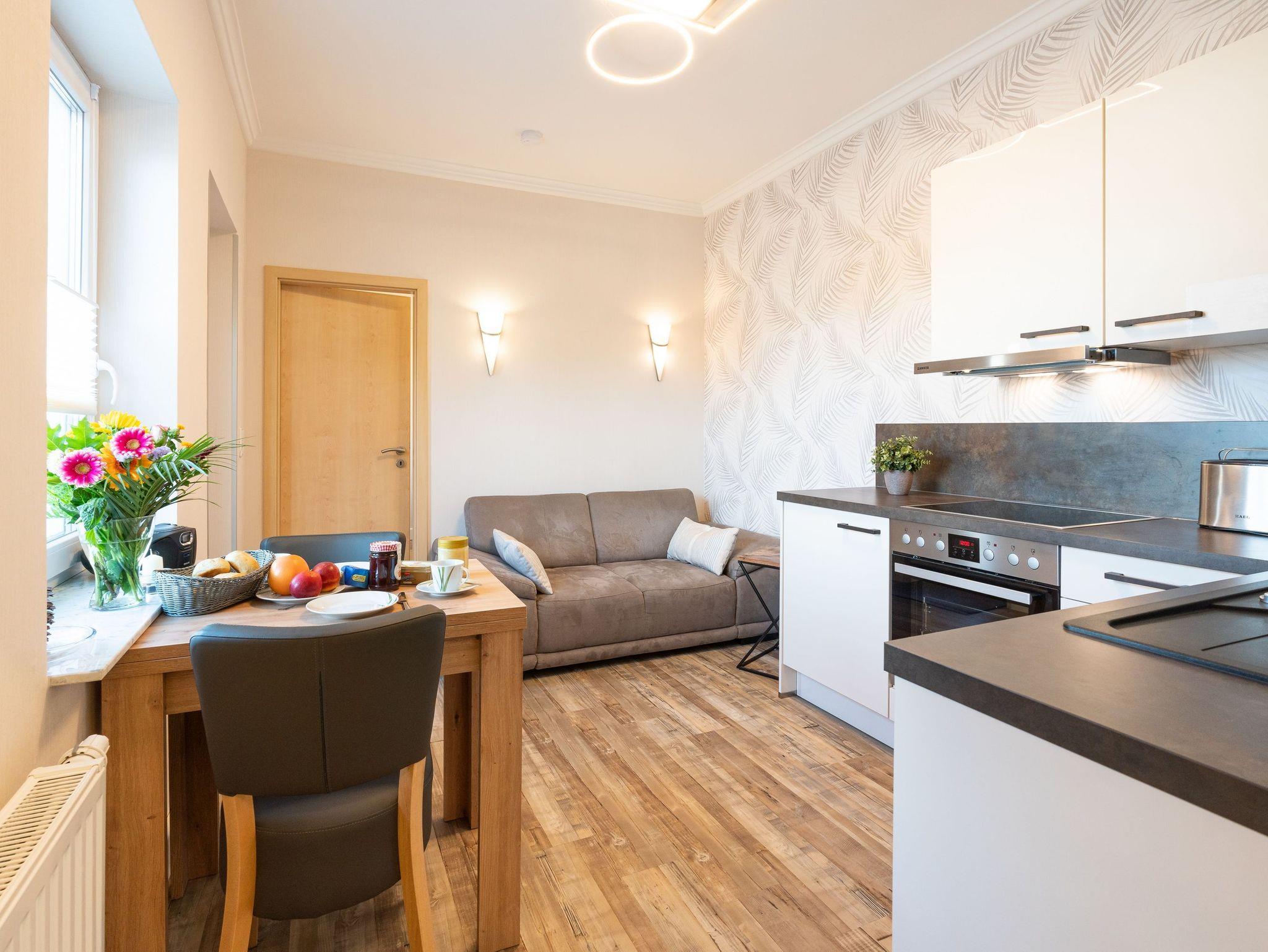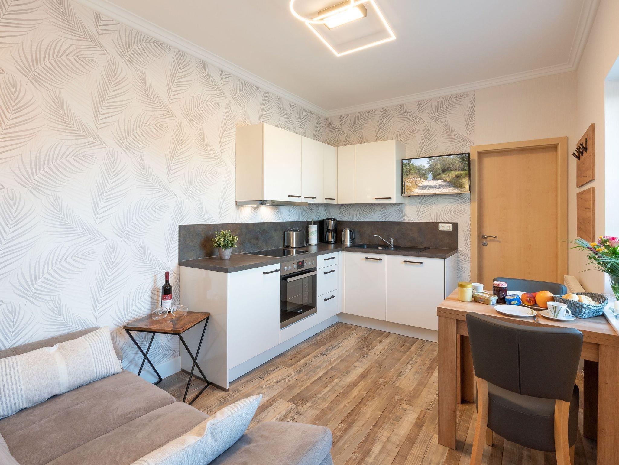 Das 2-Zimmer-Appartement im Erdgeschoss mit einer Größe von 28 Quadratmetern ist das ideale Urlaubsquartier für 2 Personen. Der kombinierte Wohn- Koch- und Essbereich ist mit allem Komfort ausgestattet, den Sie sich im Urlaub wünschen: gemütlicher Relaxbereich mit Couch und TV sowie eine Küchenzeile mit Ceranfeld, Backofen, Kühlschrank mit Gefrierfach, Toaster, Wasserkocher und Kaffeemaschine, in der nicht nur der Snack für Zwischendurch, sondern auch feinste Gaumenfreuden angerichtet werden können. Das Schlafzimmer ist mit einem bequemen Doppelbett (140 x 200cm / durchgehende Matratze) ausgestattet.