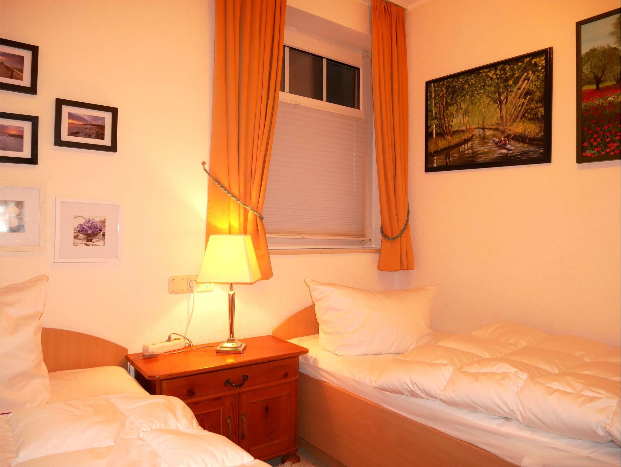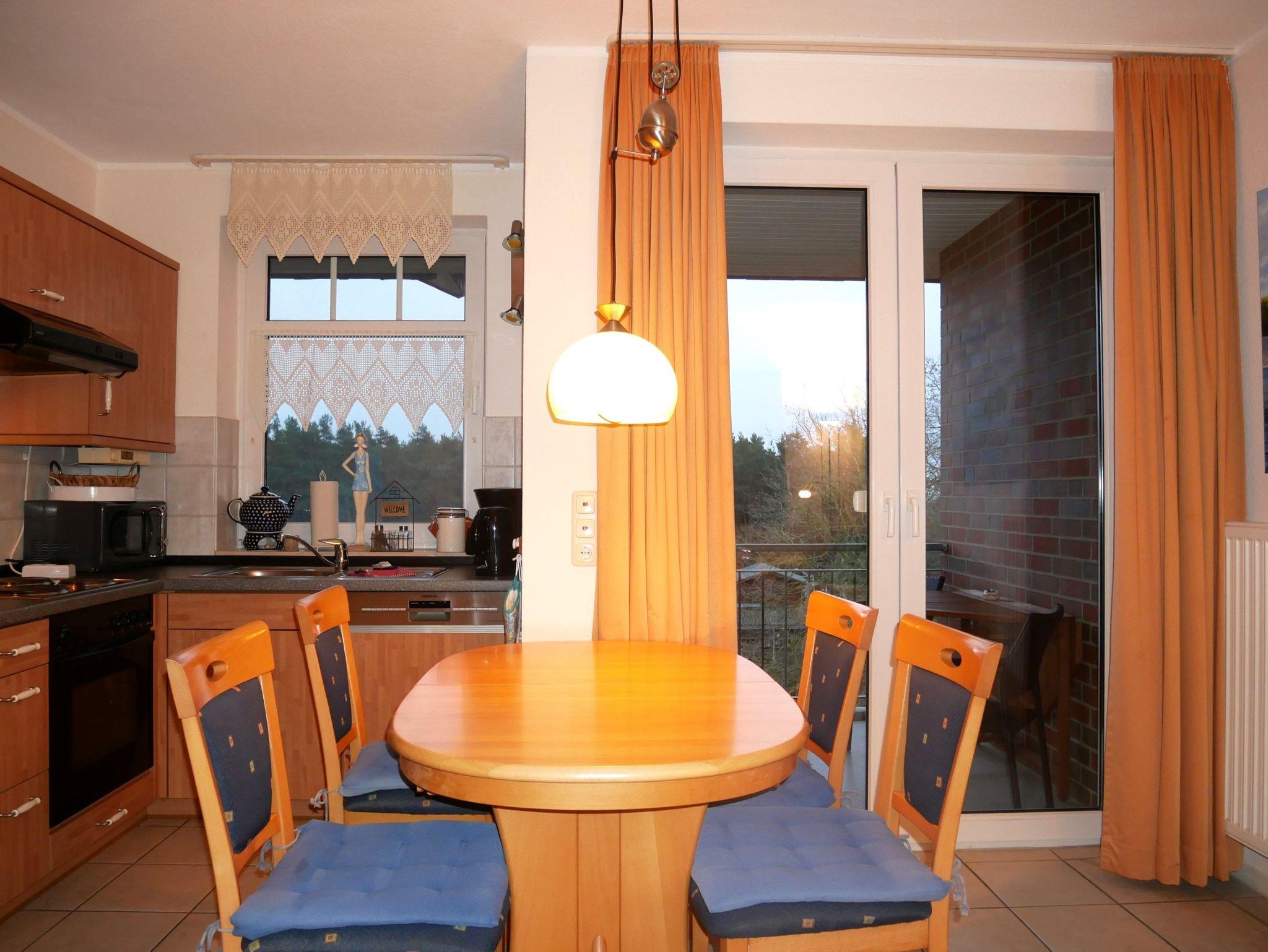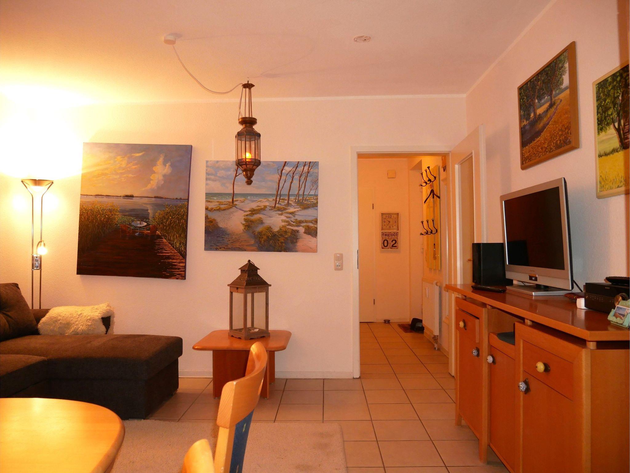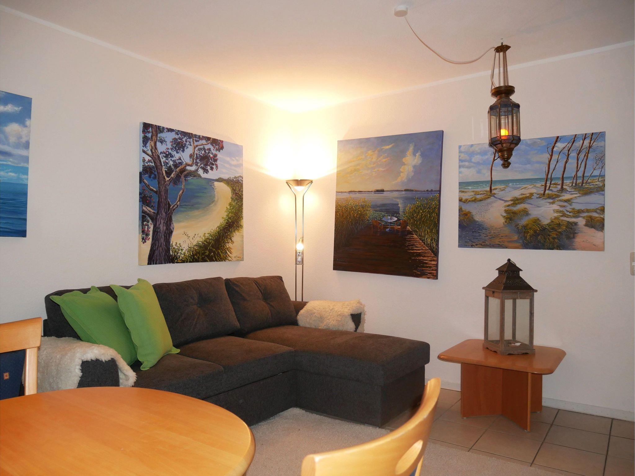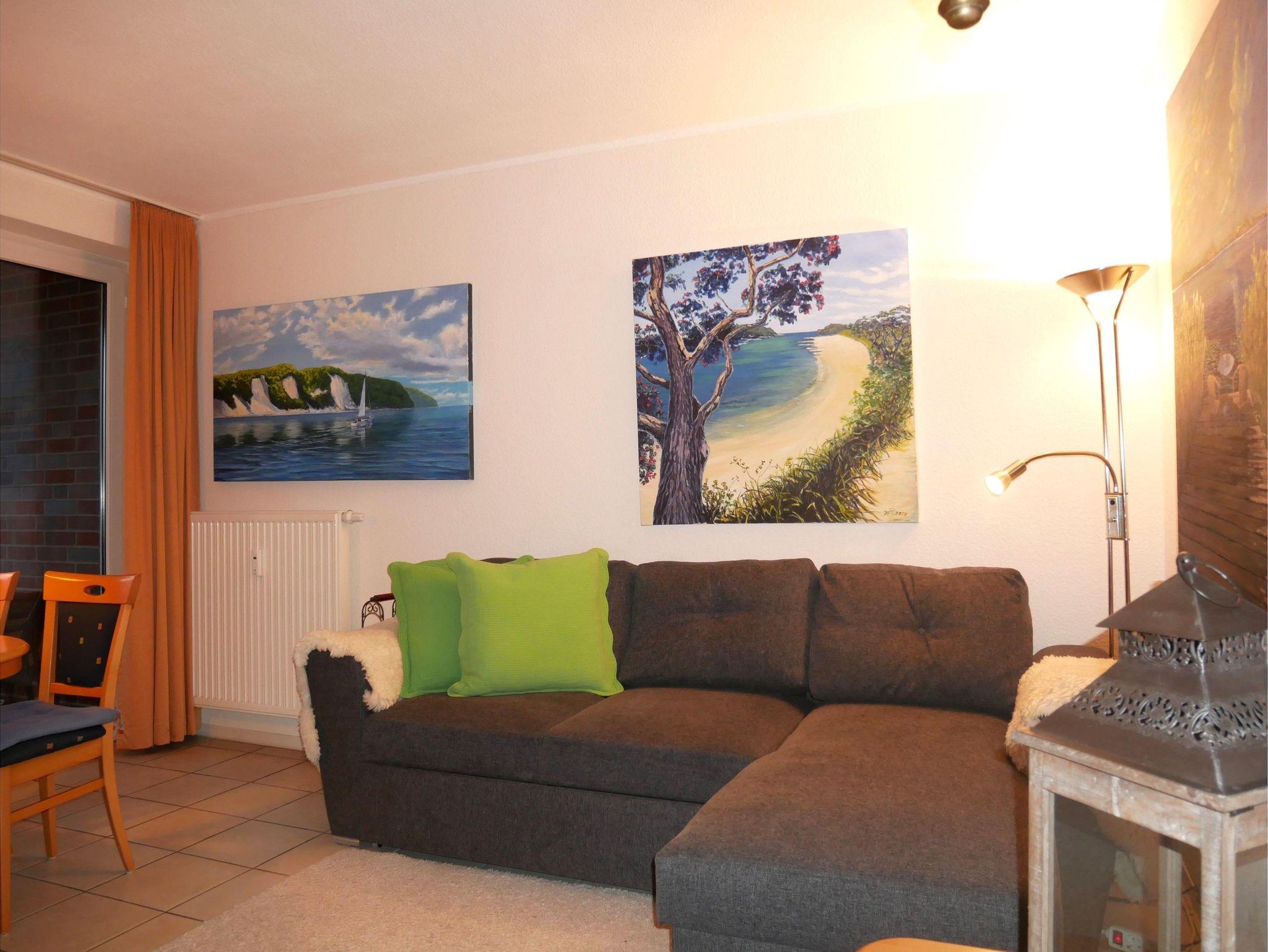 Die helle 2-Raum-Ferienwohnung befindet sich in der 3. Etage im Haus Roland und teilt sich auf in ein Wohnzimmer mit gemütlichem Schlafsofa (140 x 200 cm- Aufbettung für 3+ 4 Person), Flachbild Fernseher, Musikanlage und Esstisch für 4 Personen. Die angrenzende Küchenzeile verfügt über Backofen, 4 Platten Herd, Kühlschrank mit Gefriermöglichkeit, Mikrowelle, Spülmaschine, Kaffeemaschine, Wasserkocher und Toaster.