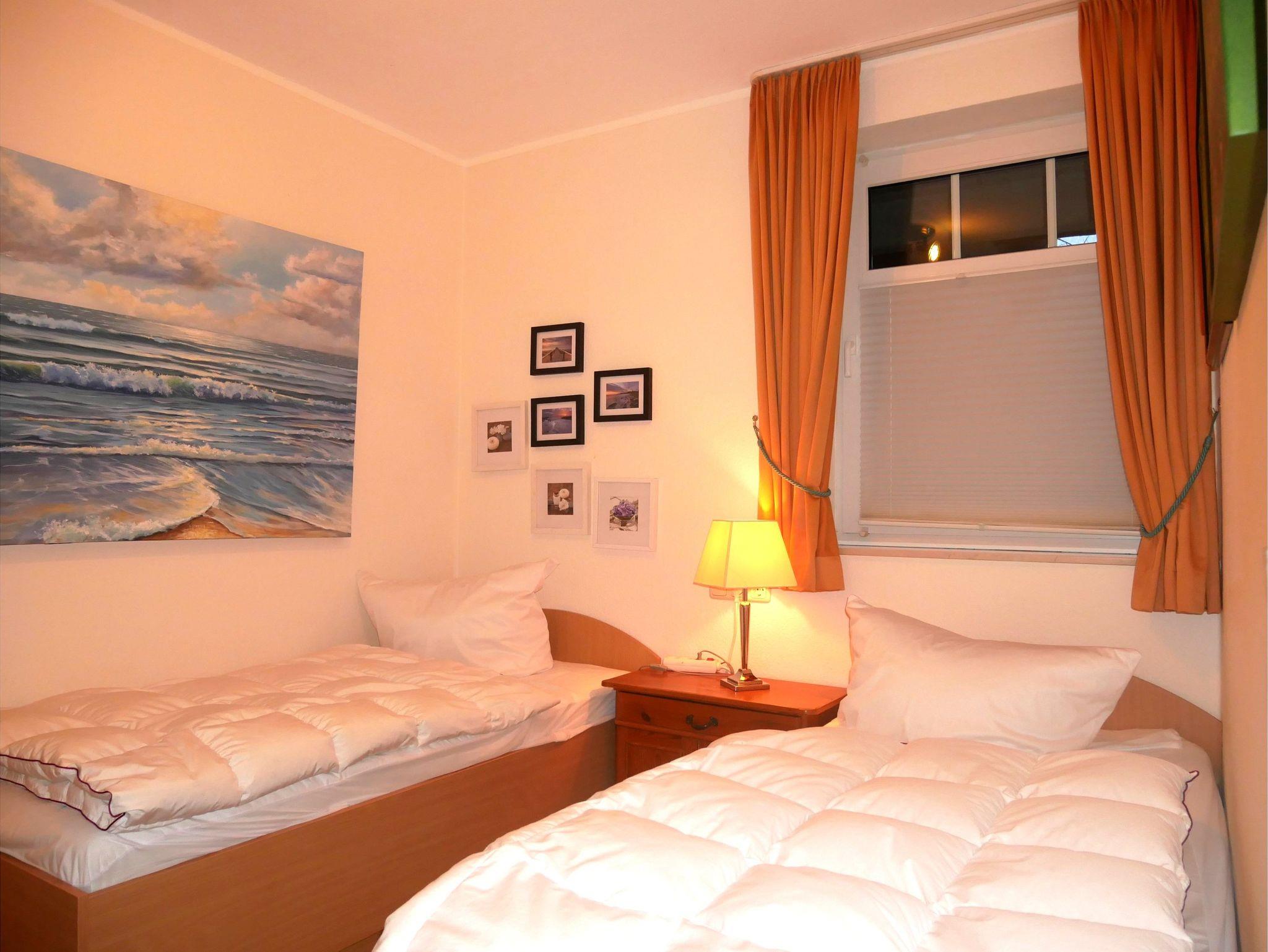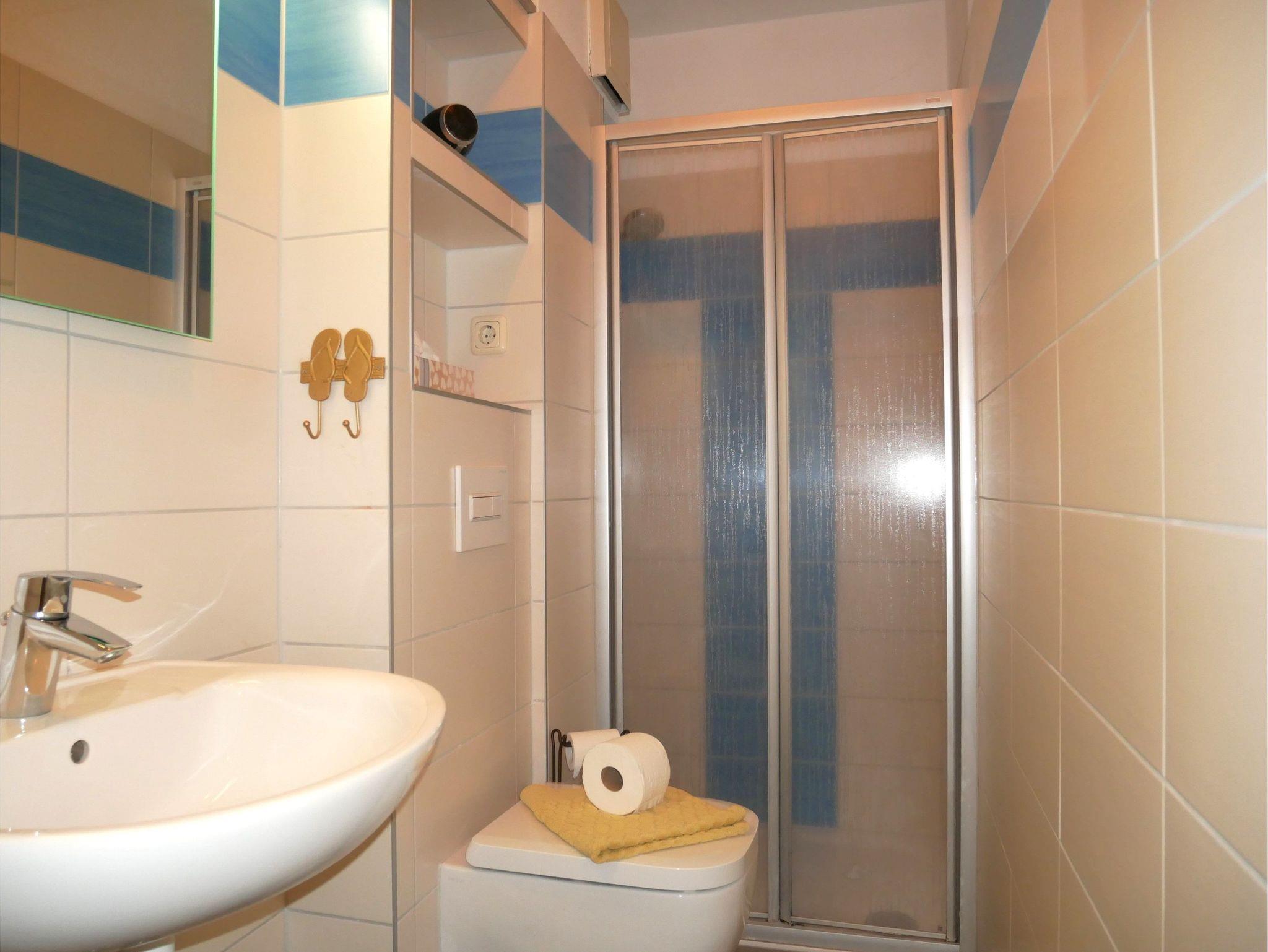 Das Schlafzimmer ist mit zwei Einzelbetten ausgestattet. Den zum Süden ausgerichtete Balkon, erreichen Sie vom Wohnzimmer aus. Das kleine Badezimmer ist mit einer ebenerdigen Dusche ausgestattet.
