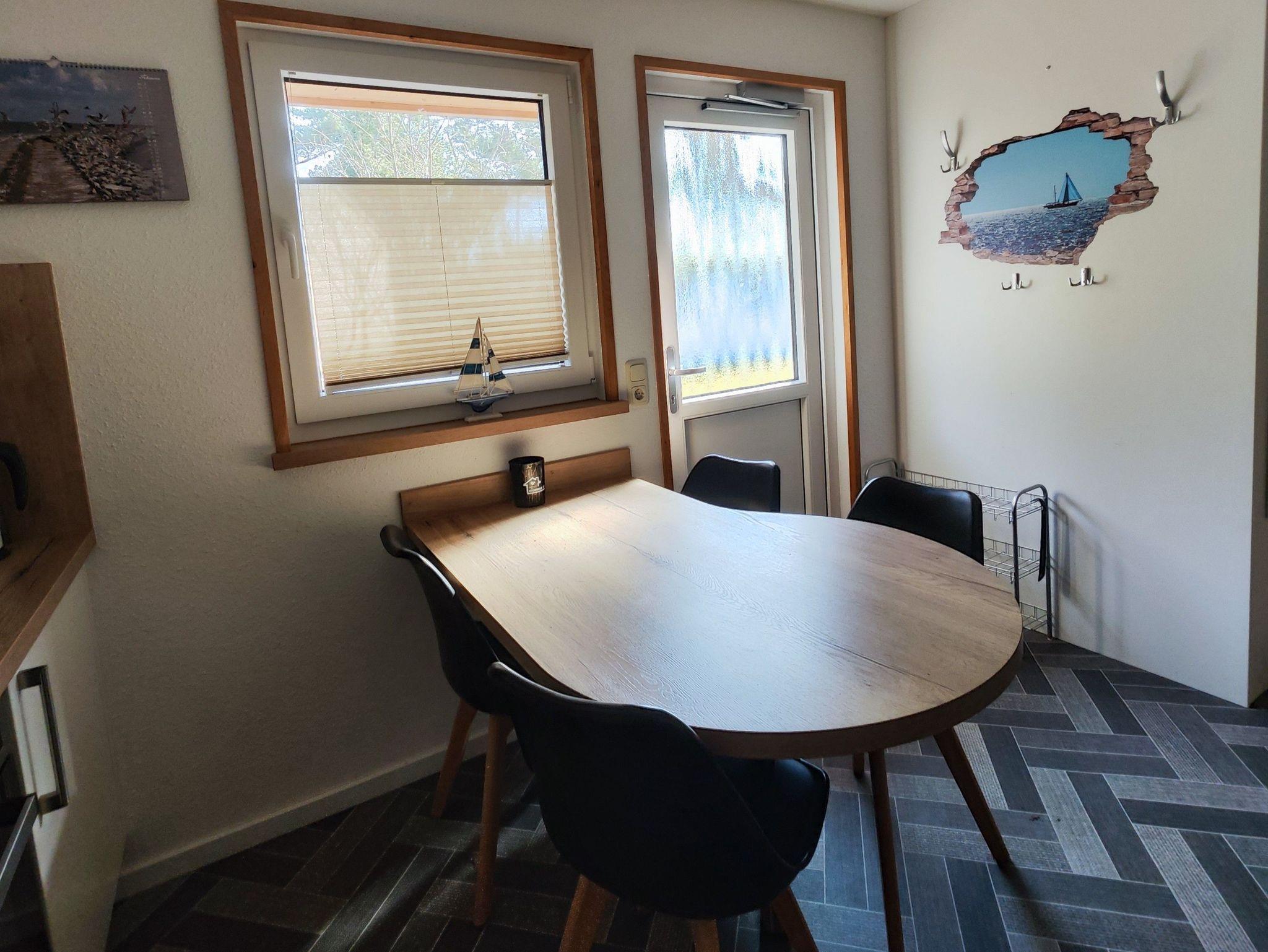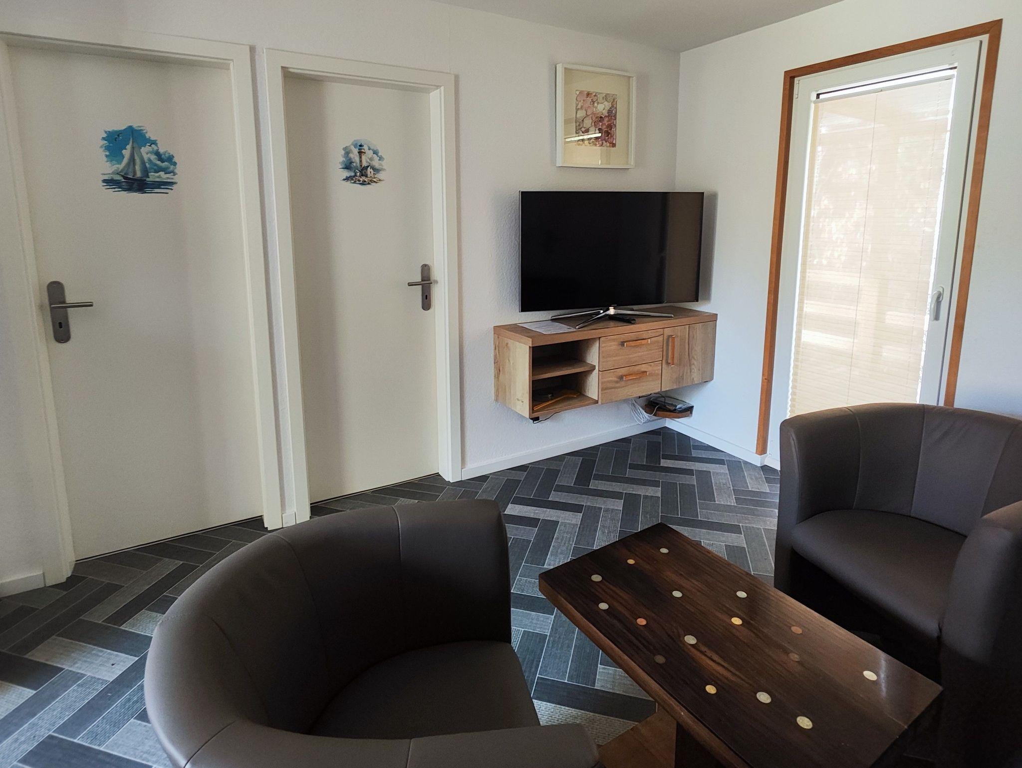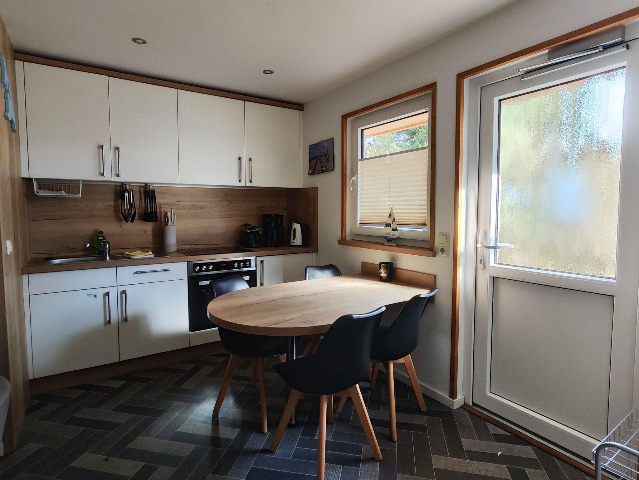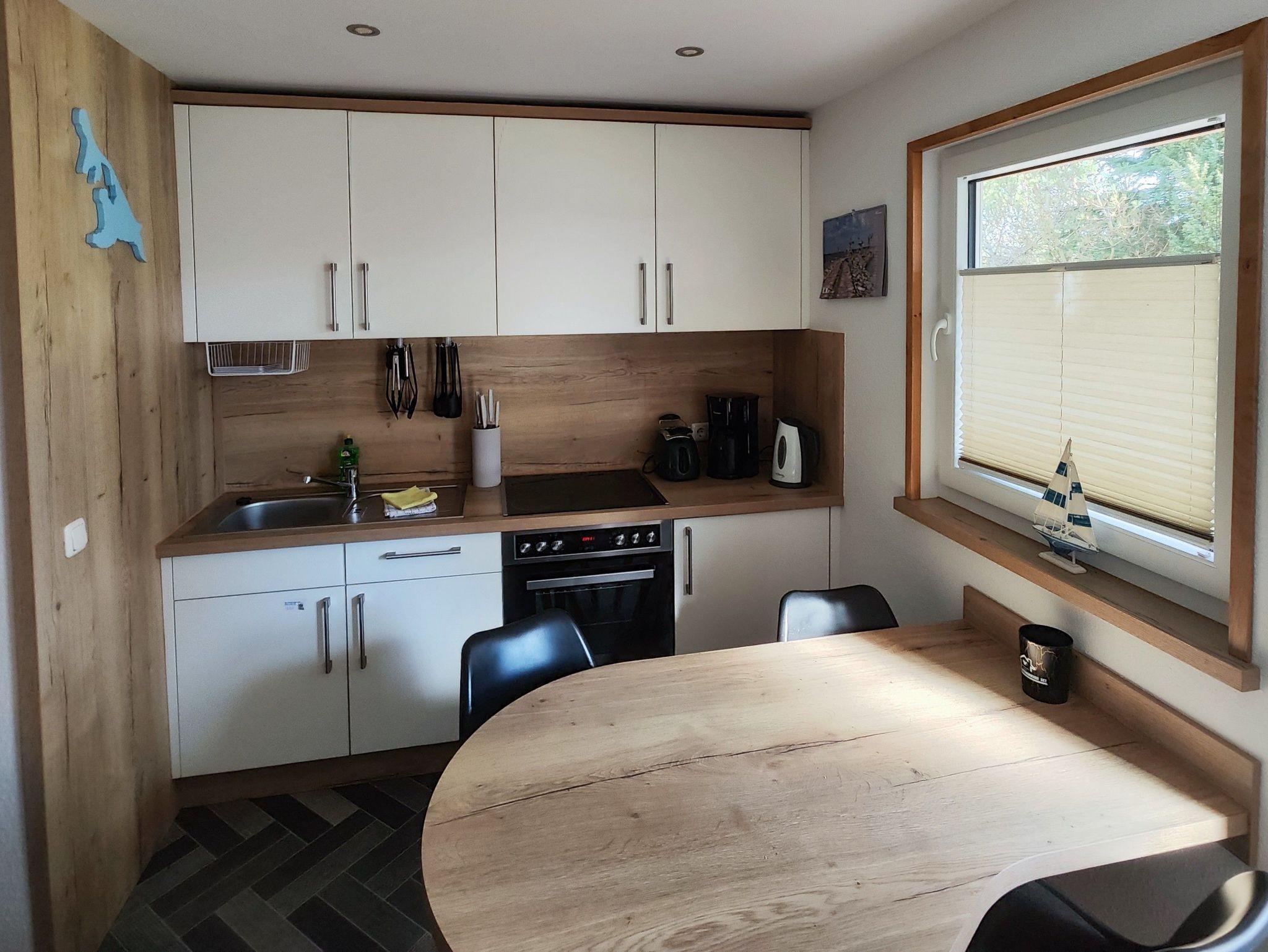 Bungalow mit 2 Schlafzimmern und einem gemütlichen Wohnraum mit Essecke, Küchenzeile und einer Couch.