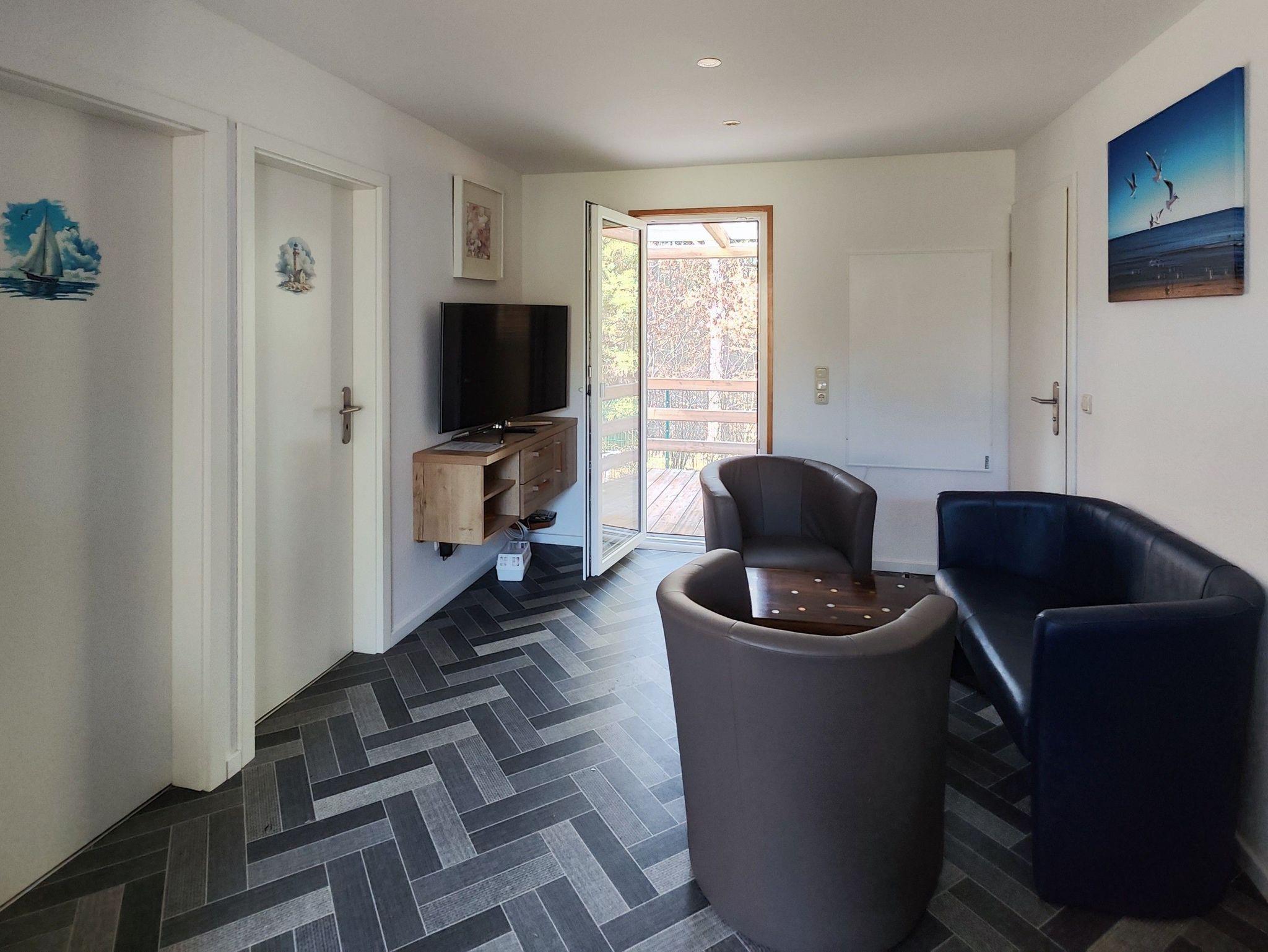 Die 10qm große überdachte Terrasse, umgeben von Kiefern in einer ruhigen Ferienanlage, lädt zum Relaxen und Verweilen ein. Hier können Sie die Natur genießen und den Alltag hinter sich lassen. Gartenmöbel stehen selbstverständlich für Sie bereit.