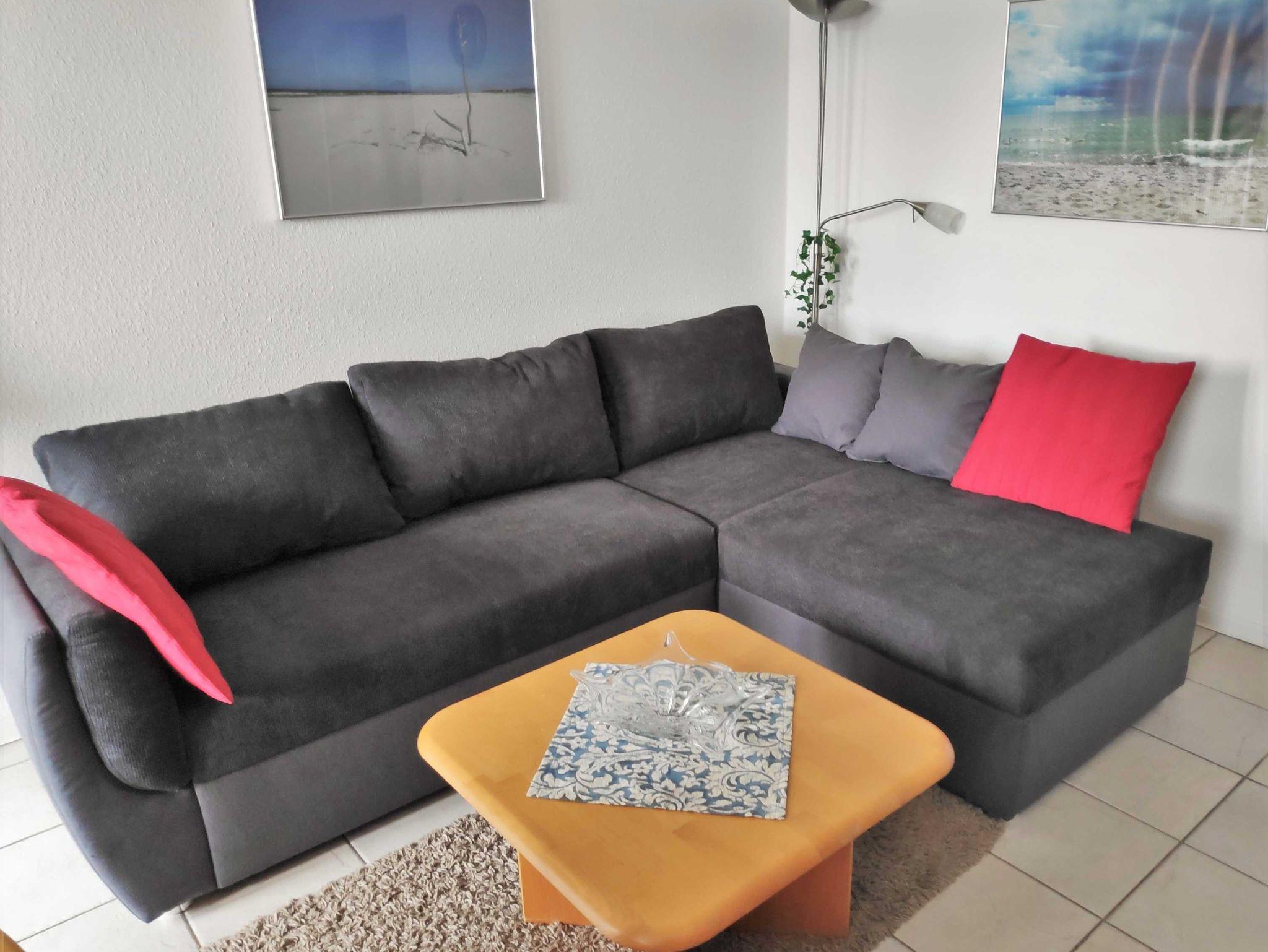 Die helle, ca. 38qm große Ferienwohnung ist ideal für 2 -3 Personen geeignet und verfügt über einen möblierten Balkon. Der kombinierte Wohn-Essbereich ist mit einem bequemen Sofa (Aufbettungsmöglichkeit für 3. Person Liegefläche 1,40x2,00m), einem Sessel, großem Flat-TV, CD-Player und Sideboard ausgestattet. Die offene Küche erwartet Sie mit einem 4-Platten-Herd, Backofen, Geschirrspüler, Kühlschrank mit Gefrierfach, Kaffeemaschine, Wasserkocher und Toaster. Das separate Schlafzimmer ist mit zwei Kastenbetten (je 90x200cm), Nachttischen sowie einem Kleiderschrank eingerichtet. Das Badezimmer verfügt über Dusche/WC, Waschbecken sowie einen Haartrockner.