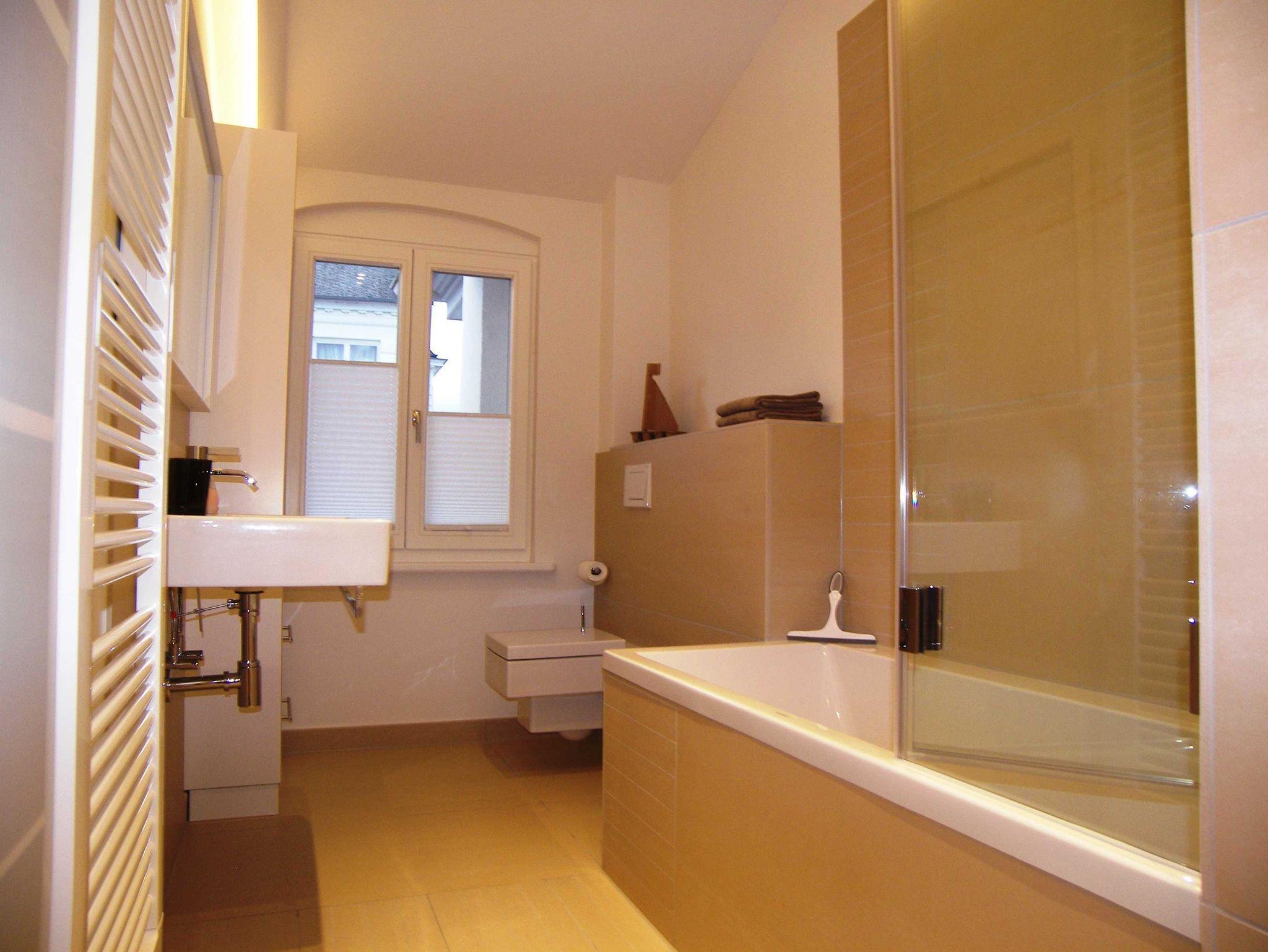 Das Badezimmer mit Außenfenster bietet eine Badewanne mit Duschmöglichkeit, sowie eine Waschmaschine und Trockner.