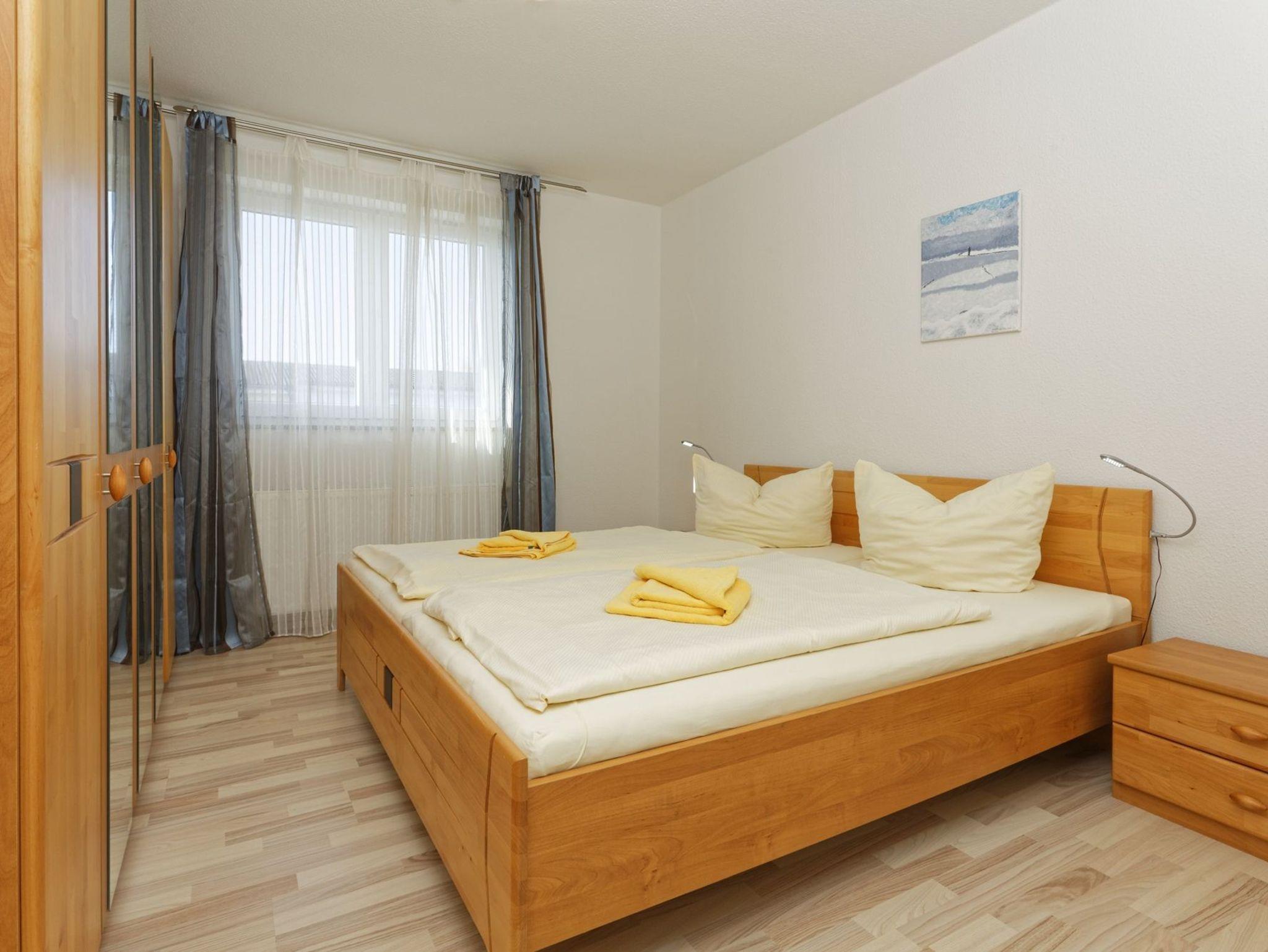 Die zwei Schlafzimmer, bieten einen gemütlichen Rückzugsort. Sie besitzen jeweils ein bequemes Doppelbett (180 x 200 cm) und einen geräumigen Schrank. In dem großzügigen Wohnzimmer befindet sich zudem eine Schlafcouch für eine zusätzliche Aufbettung. Durch Fernseher und Stereoanlage können Sie sich abends gemütlich zusammensetzen und sich entspannen. Zur Ausstattung der hochwertigen Einbauküche gehören ein Herd mit Backofen, ein Geschirrspüler sowie ein großer Kühlschrank mit Gefrierfach. Das moderne Bad mit Dusche ist mit Fußbodenheizung und einem elektrischen Handtuchtrockner ausgestattet. Auf dem Balkon können Sie ihren Abend gemütlich ein- und ausklingen lassen. Alle Fenster wurden mit Jalousien versehen. Selbstverständlich gehört zu Ihrer Wohnung auch ein gekennzeichneten PKW-Stellplatz.