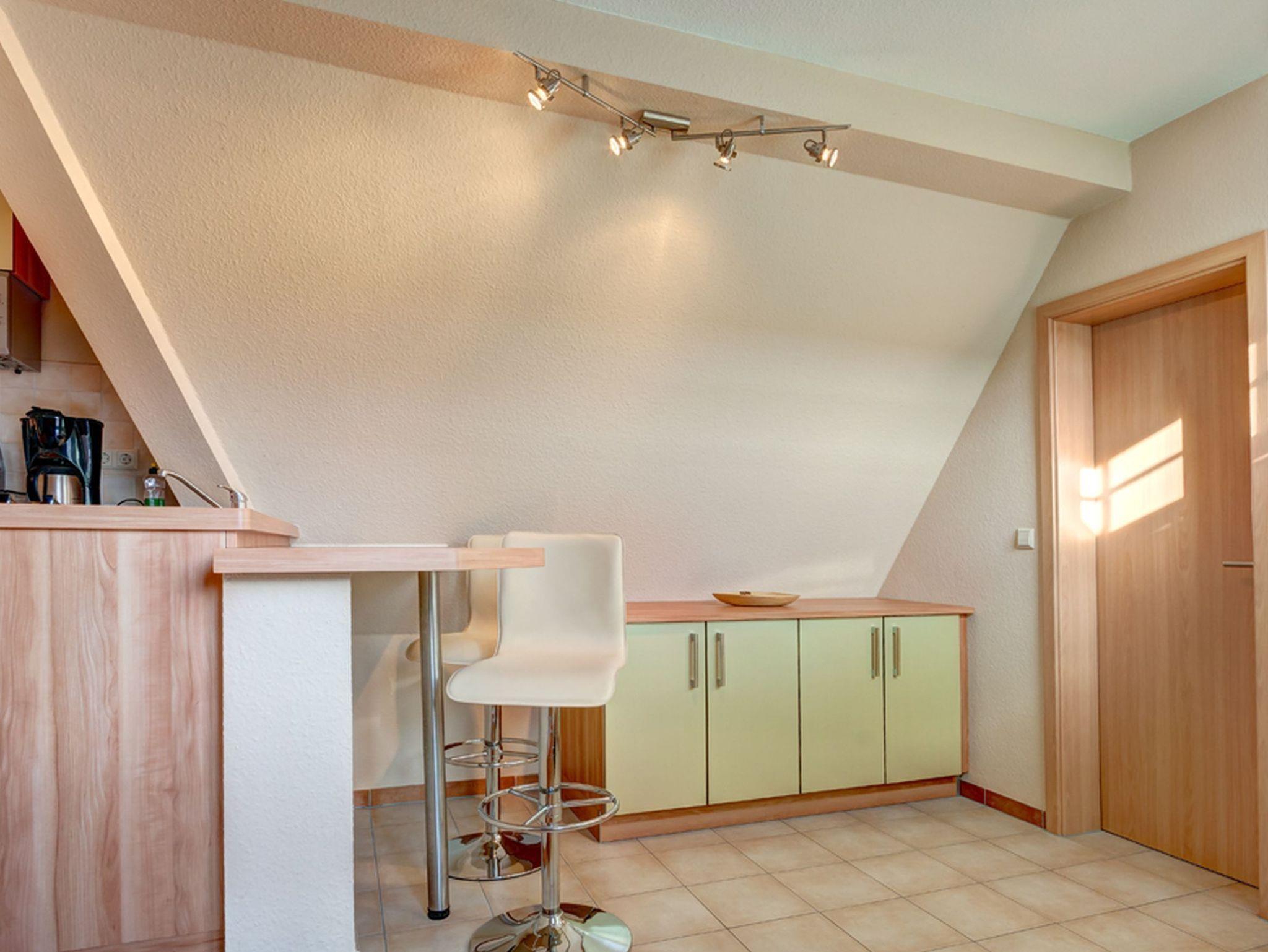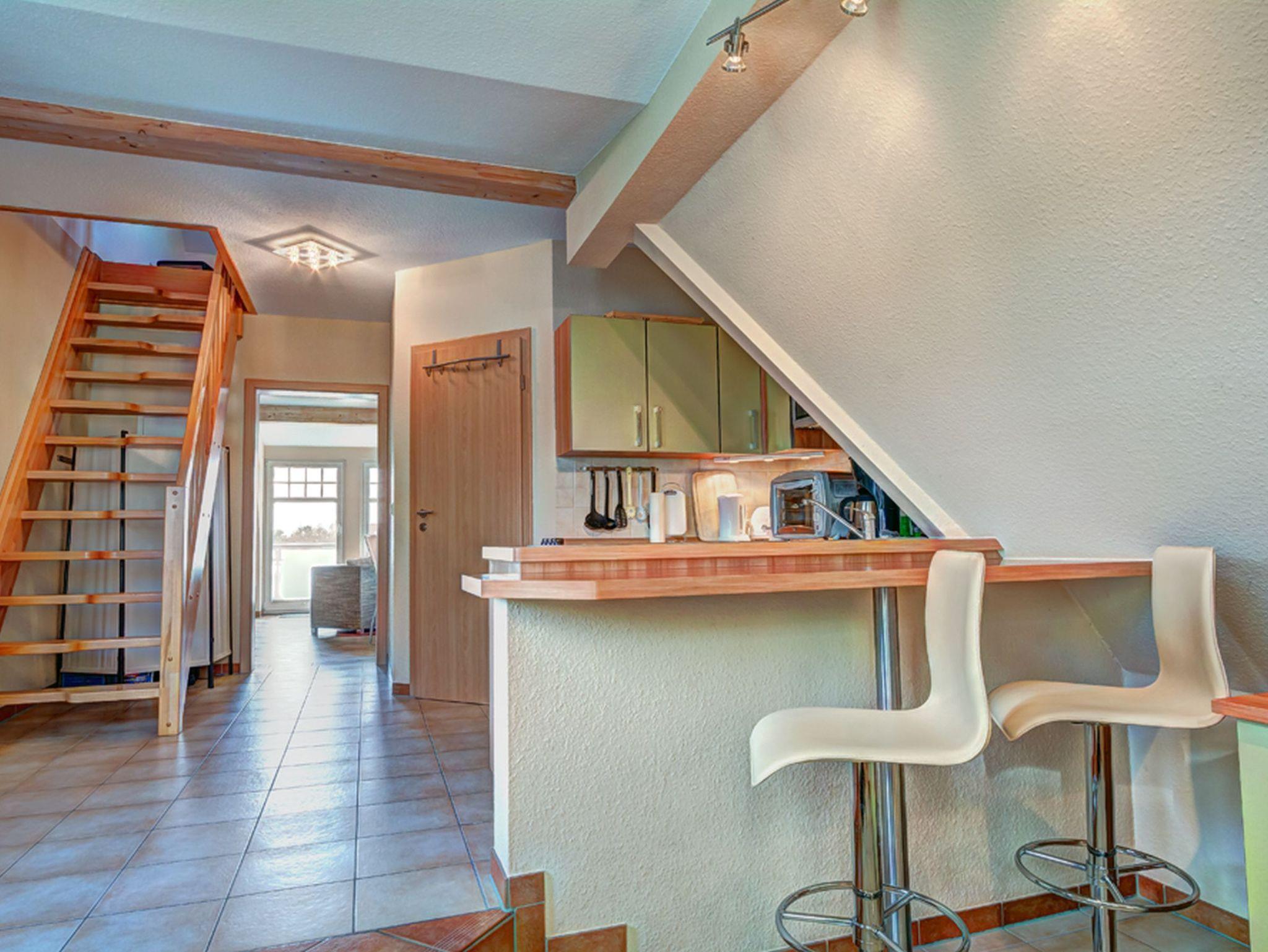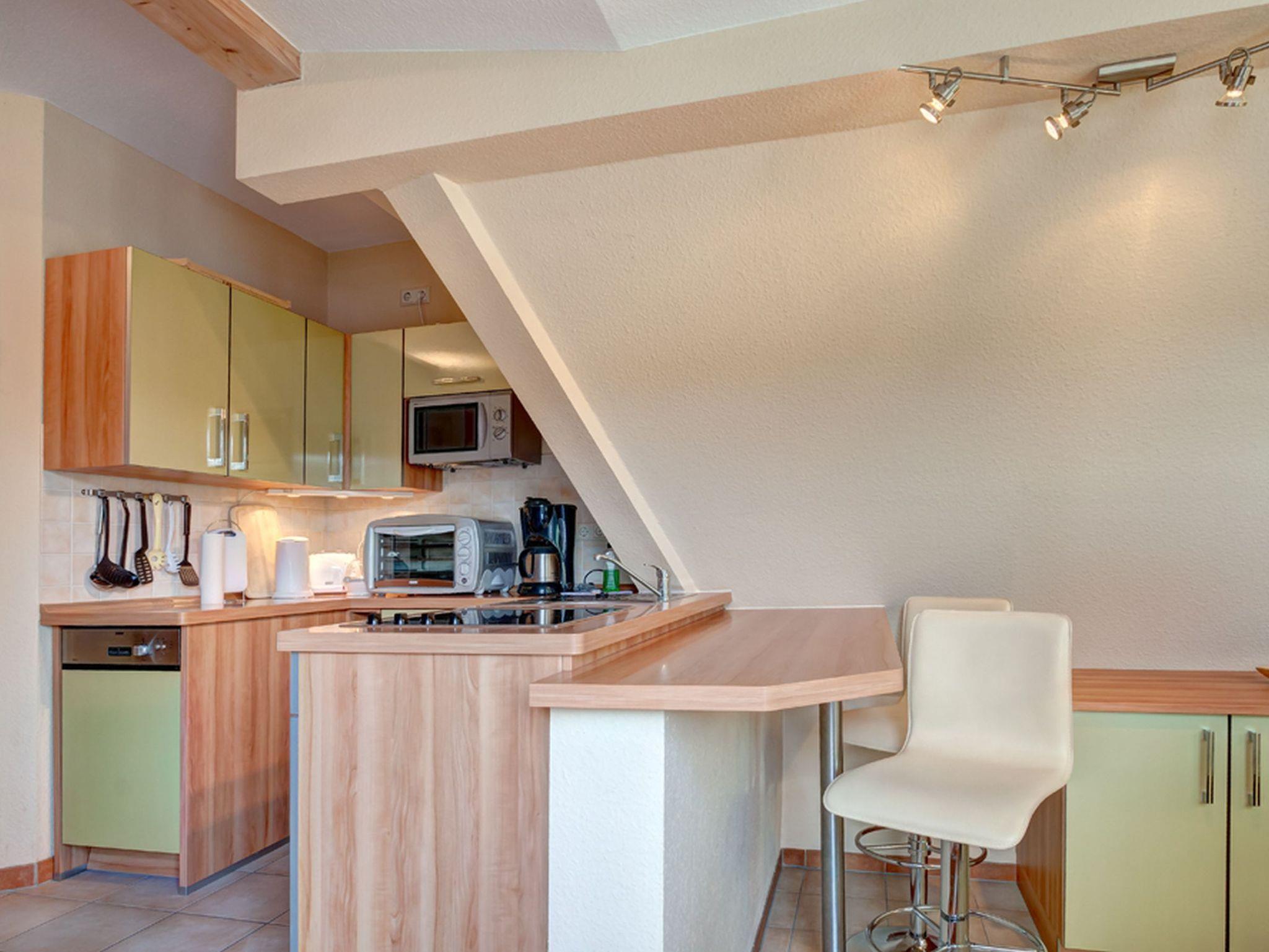 Die Küche ist eingerichtet, mit Backofen und Cerankochfeld, Geschirrspüler, Kühlschrank, Mikrowelle, Kaffeemaschine, Toaster und Wasserkocher. Ein eingebauter Tresen mit 2 Barhockern eröffnet die Möglichkeit eines gemütlichen Drinks.