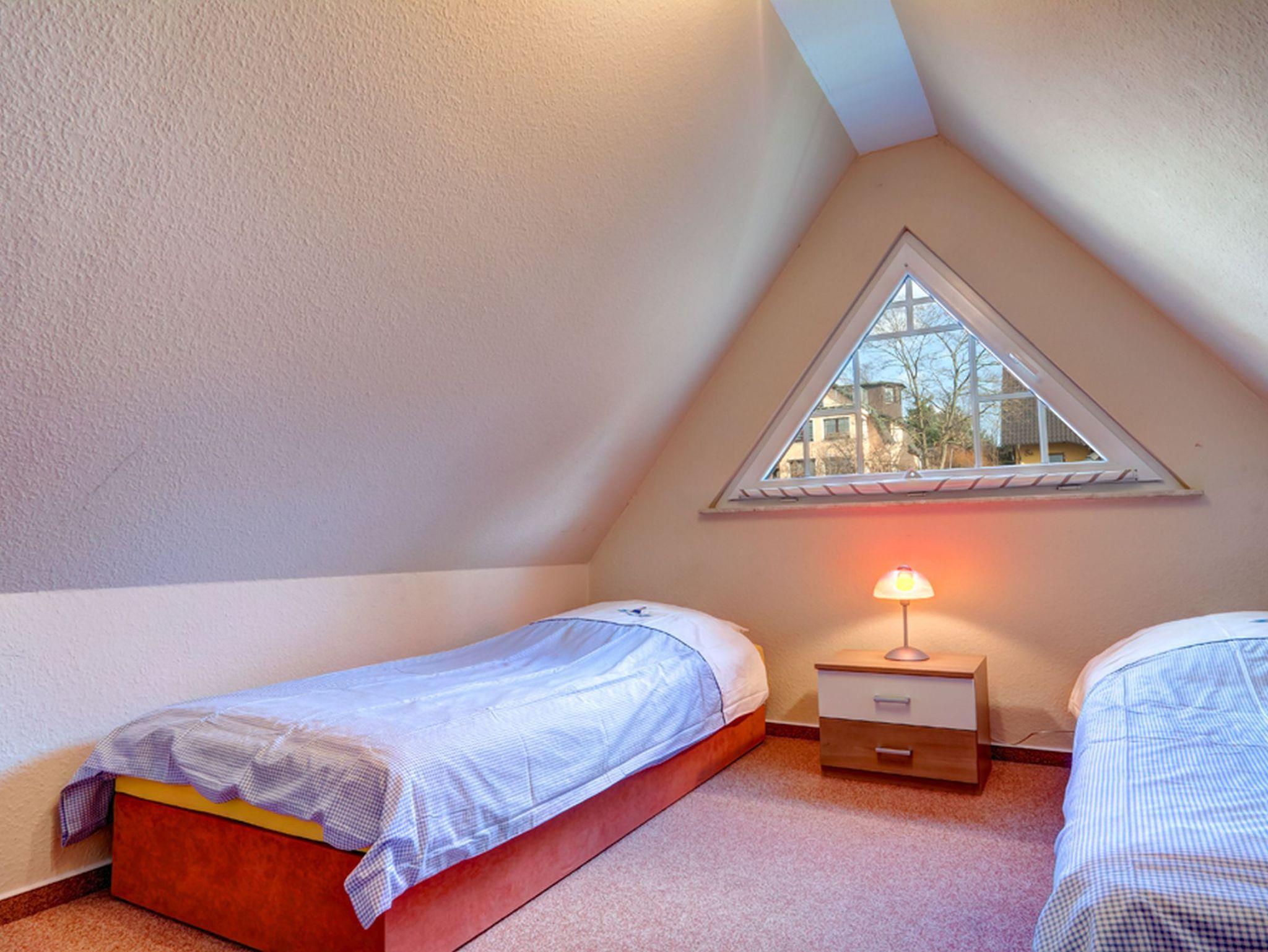 Im zweiten, etwas kleineren Schlafzimmer mit schönem Dreiecksfenster sind zwei Liegen mit jeweils 0,90m breiter Liegefläche, ein großer Kleiderschrank und 2 Nachtschränkchen untergebracht.