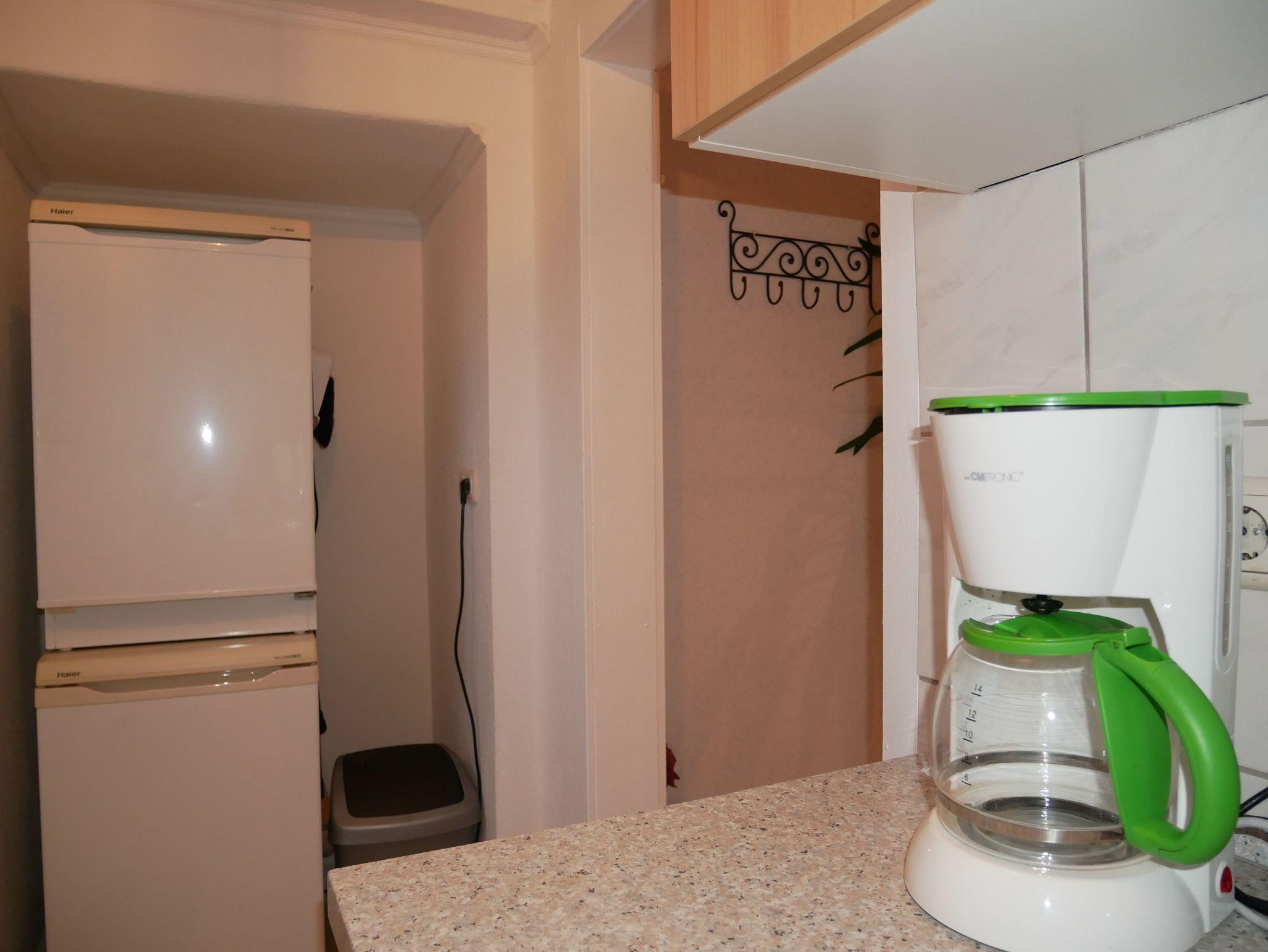 Dort finden Sie auch eine Küche zur gemeinschaftlichen Nutzung. Die Küche ist ausgestattet mit 2-Platten-Herd, Kühlschrank mit Gefrierfach, Toaster, Wasserkocher und Kaffeemaschine.