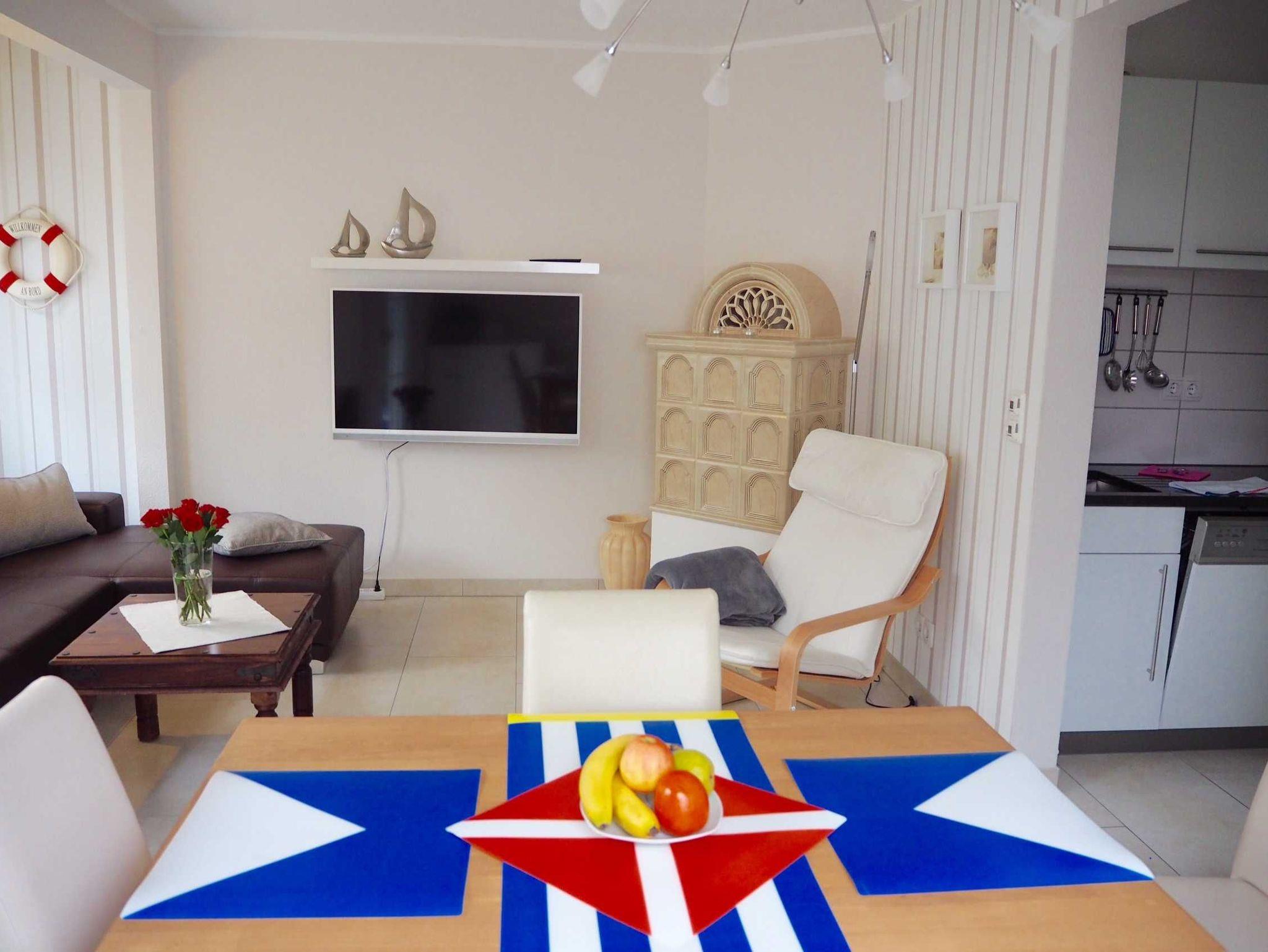 1 Wohnbereich mit Essecke, TV / Radio und elektrischem Kaminofen